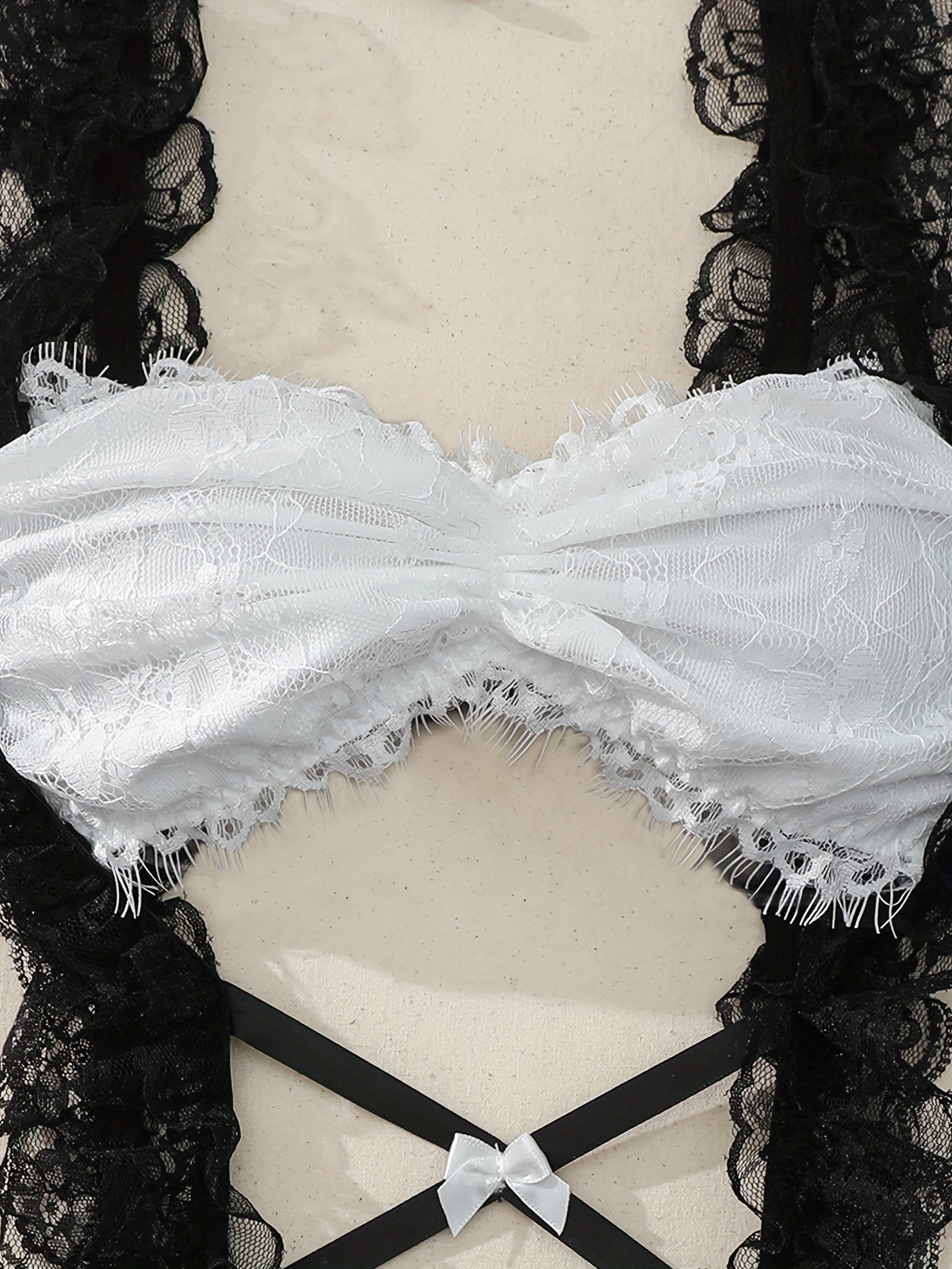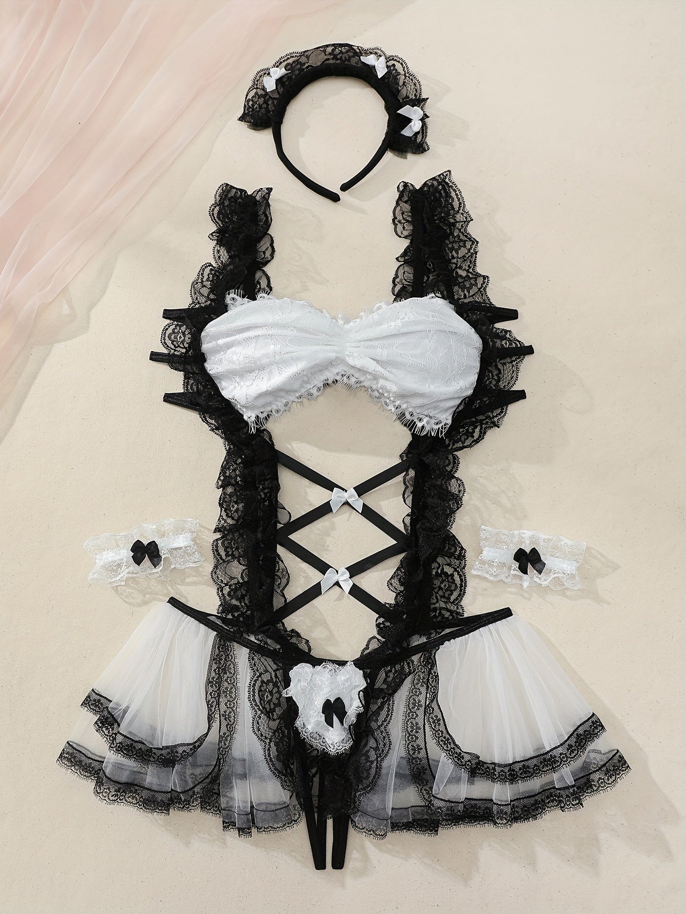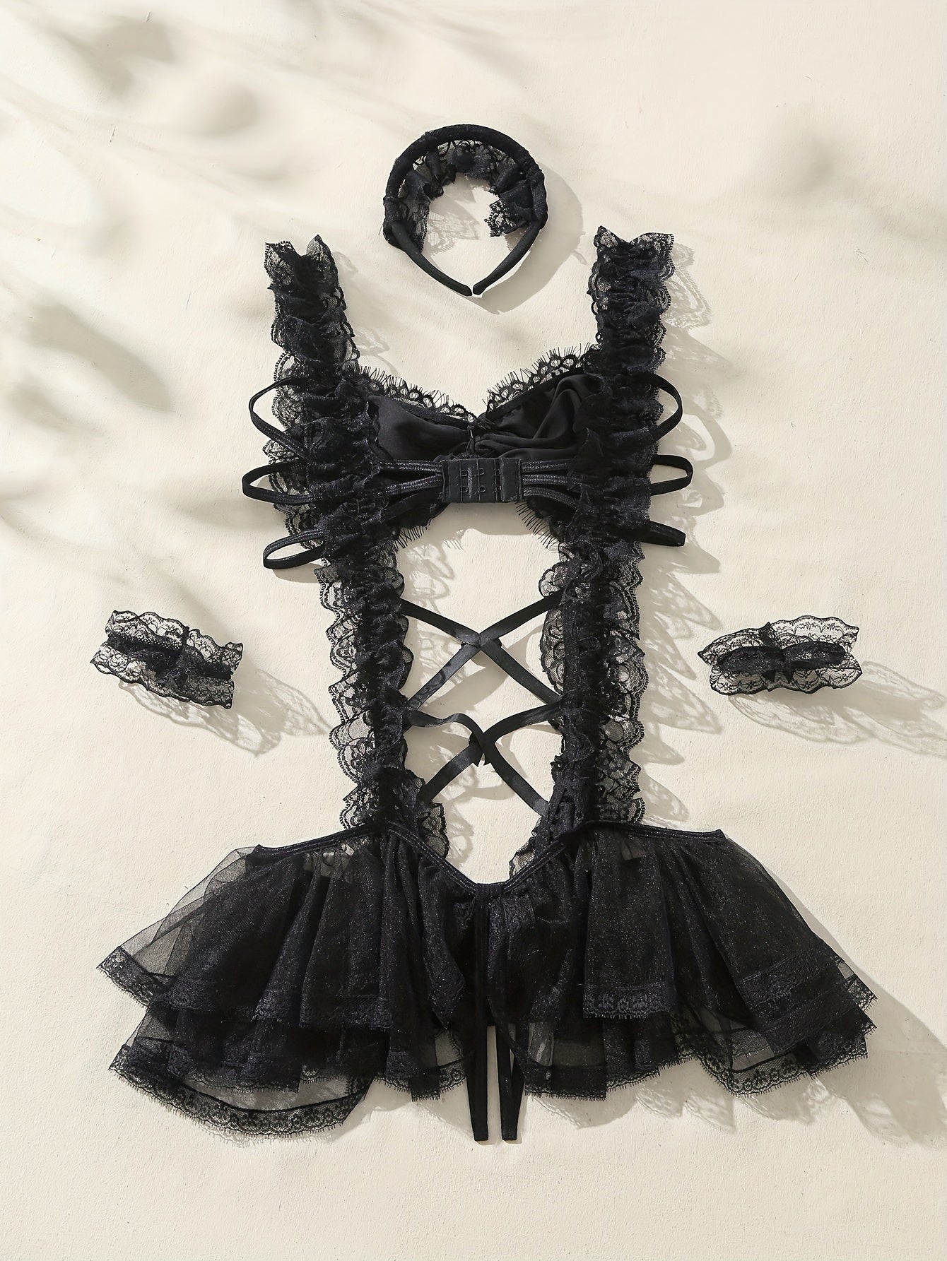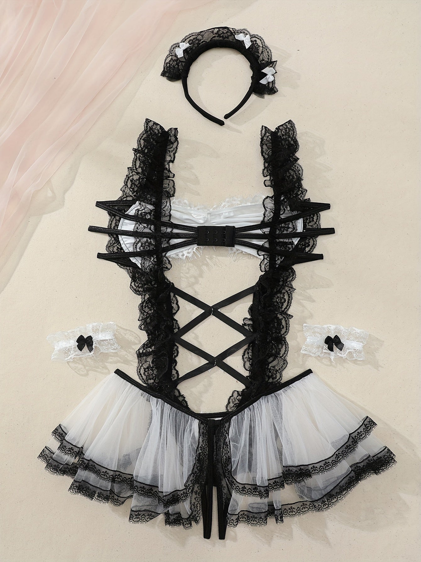تعرفي على البدلة الداخلية المثيرة بتصميمها المفتوح والمذهل. تأتي مع كورسية قابل للفصل وتفاصيل عصرية مثل حواف الدانتيل المتباينة وأكسسوارات البو. هذه البدلة مثالية للدور التمثيلي ومجموعة الملابس الحميمة.