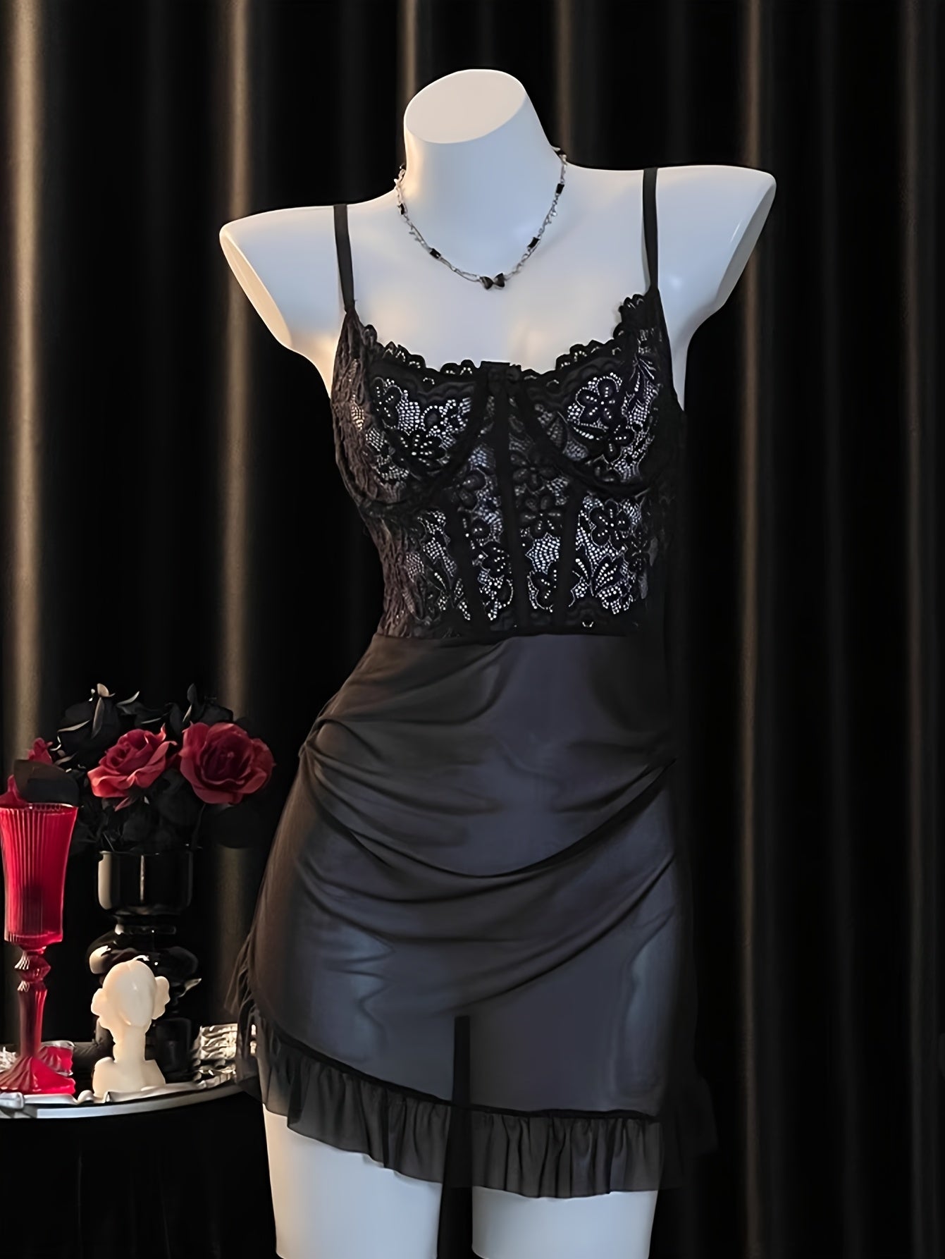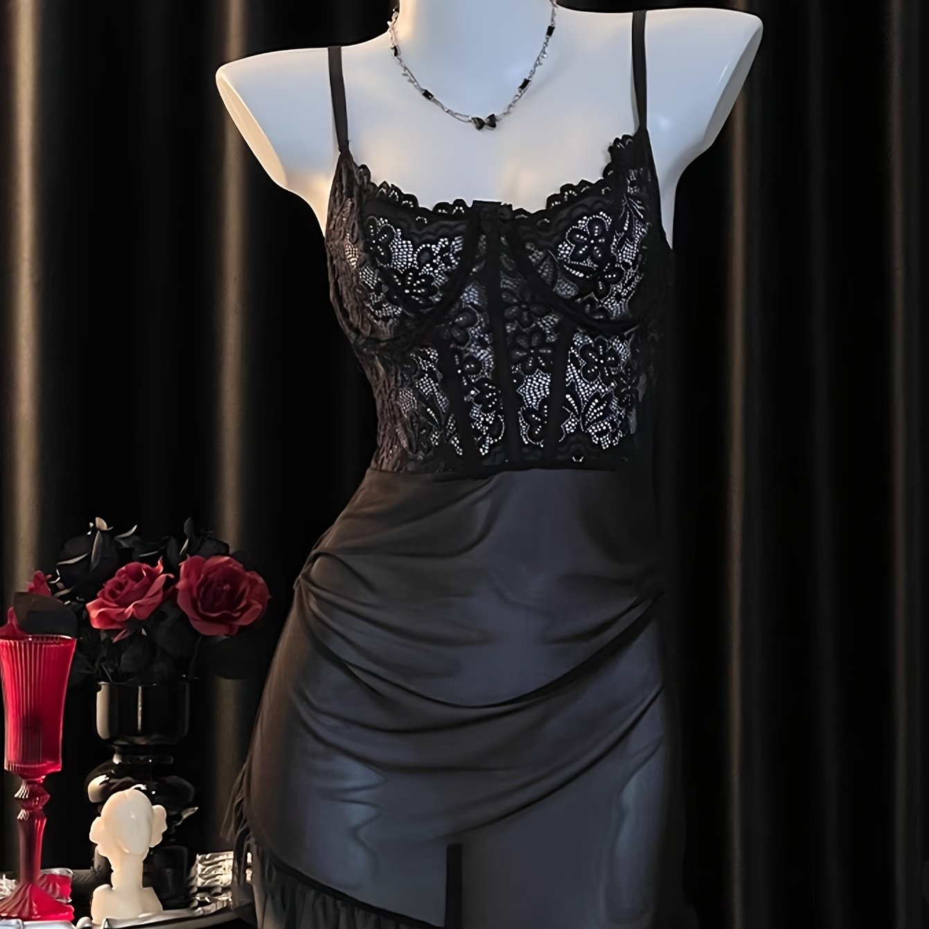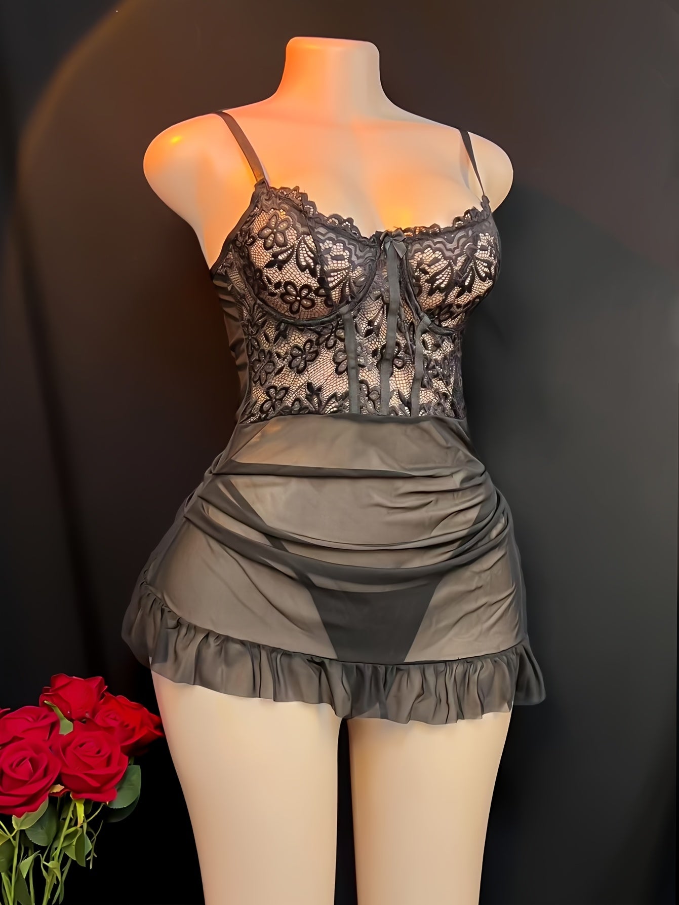 اكتشف الأناقة مع البدلة المثيرة بقصة دانتيل، المصممة بإتقان لتكشف عن جمالك. تأتي مع حلقة فولاذية مميزة لتوفير لمسة عصرية وفريدة.