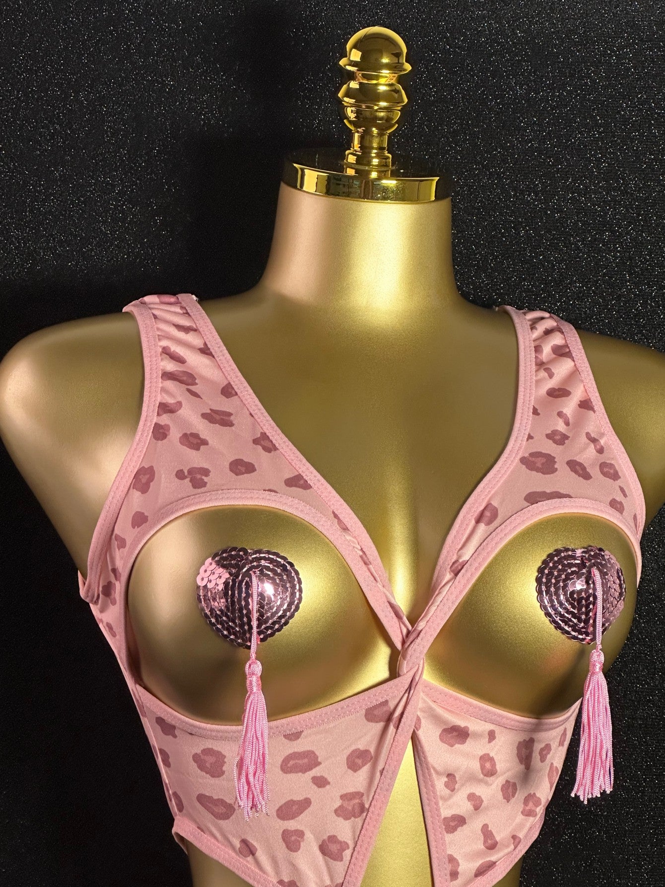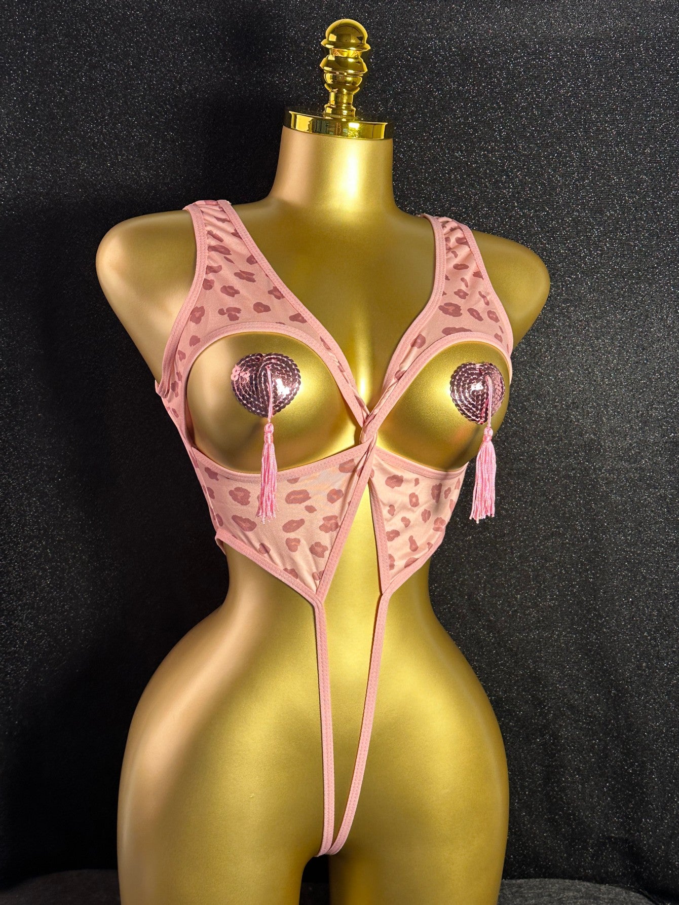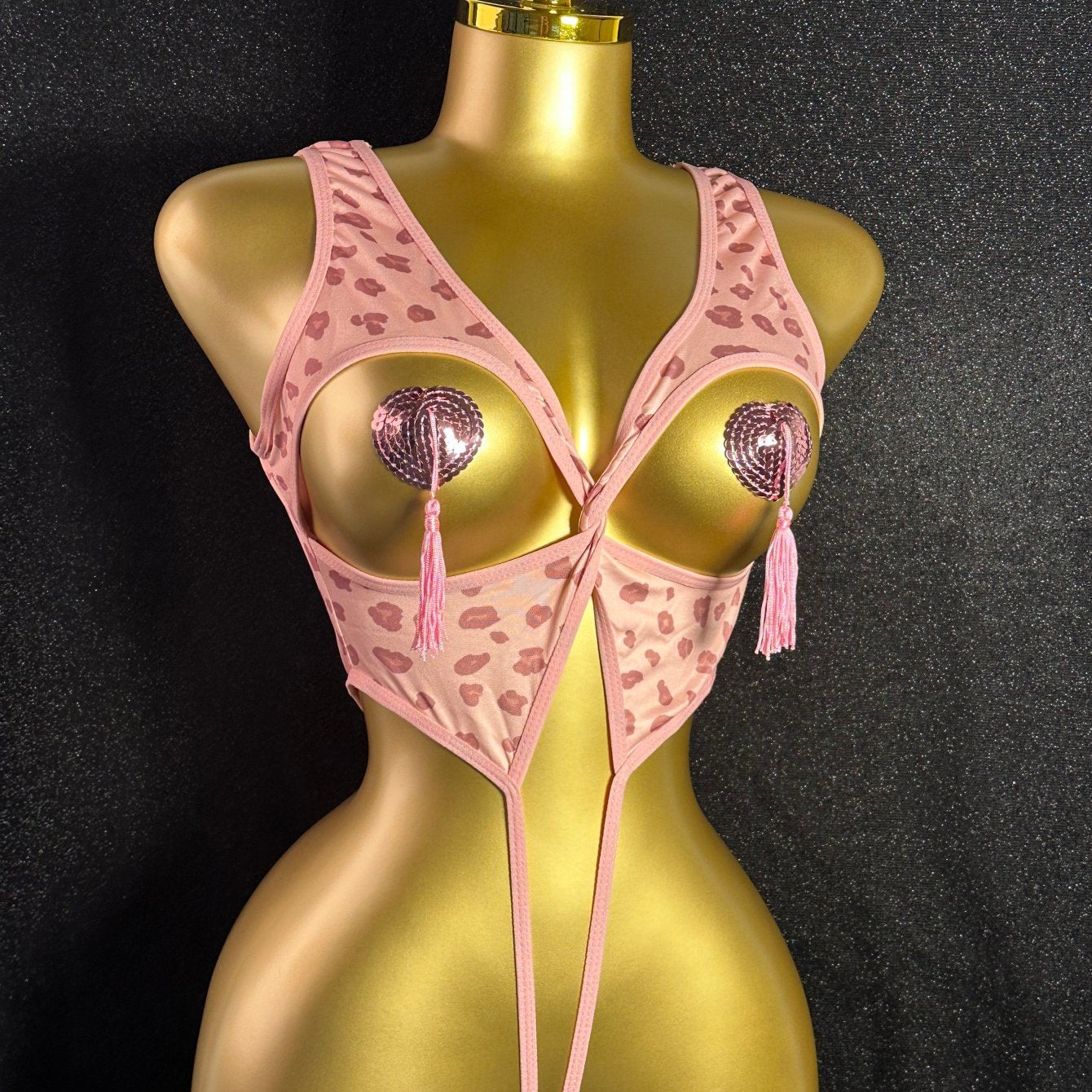 استمتع بأجواء جريئة ومثيرة مع بدلة نسائية بتصميم ليوبارد. مثالية للاحتفالات المختلفة مثل عيد الحب وأعياد الميلاد.