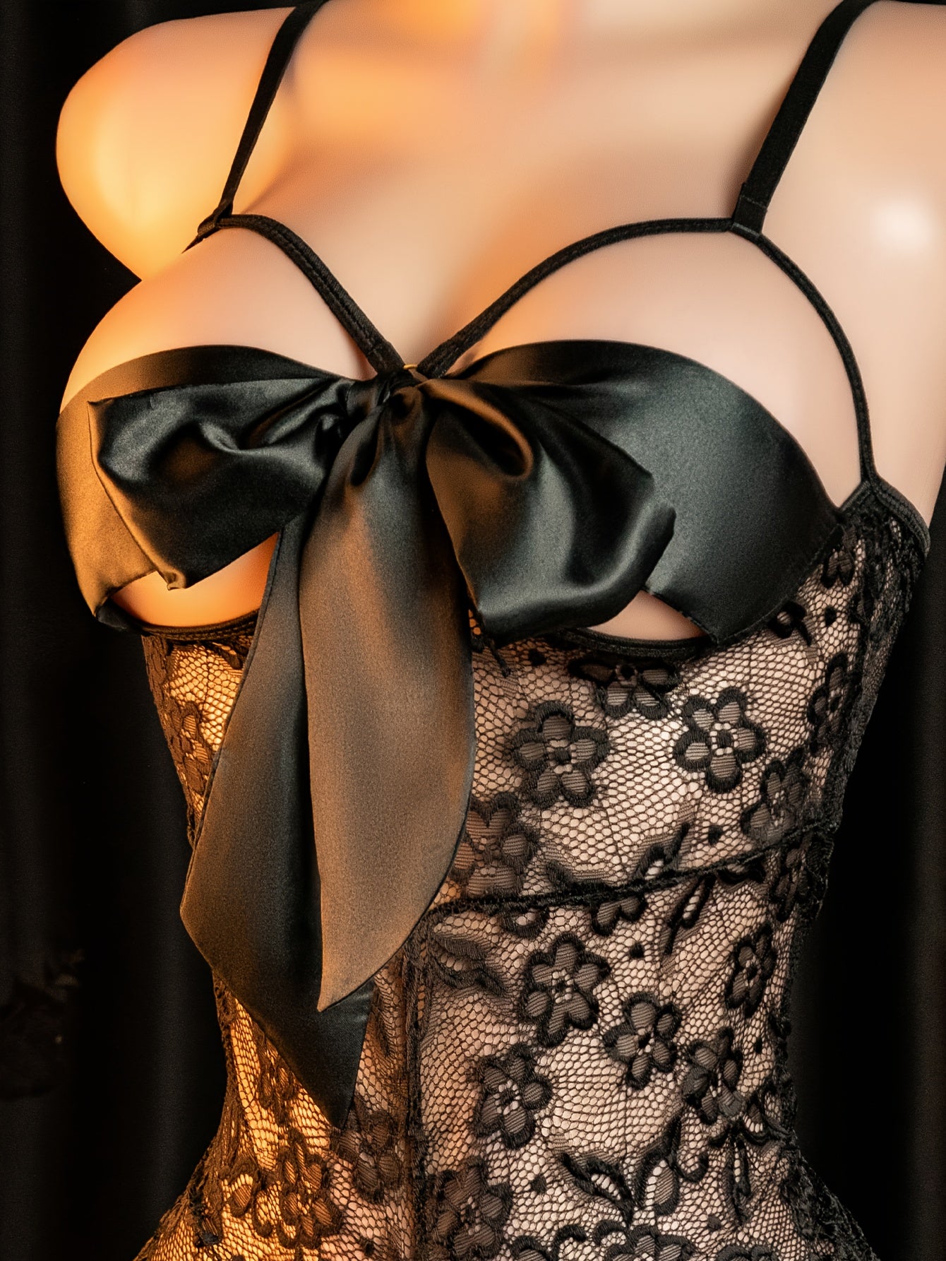 استعدي للتميز مع بدلة نسائية sexy من الدانتيل الأسود. تصميم لجسم واحد مع عنق قابل للتعديل بفعل الأربطة، مثالي للمناسبات الخاصة مثل عيد الحب أو الحفلات.