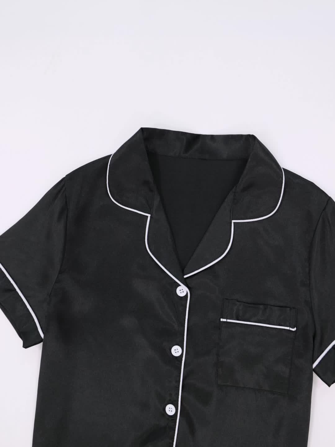 استمتع براحة وأناقة مع بيجاما الساتان النسائية الأنيقة. تصميم قميص بأكمام قصيرة وزر، مثالية للاسترخاء في المنزل.