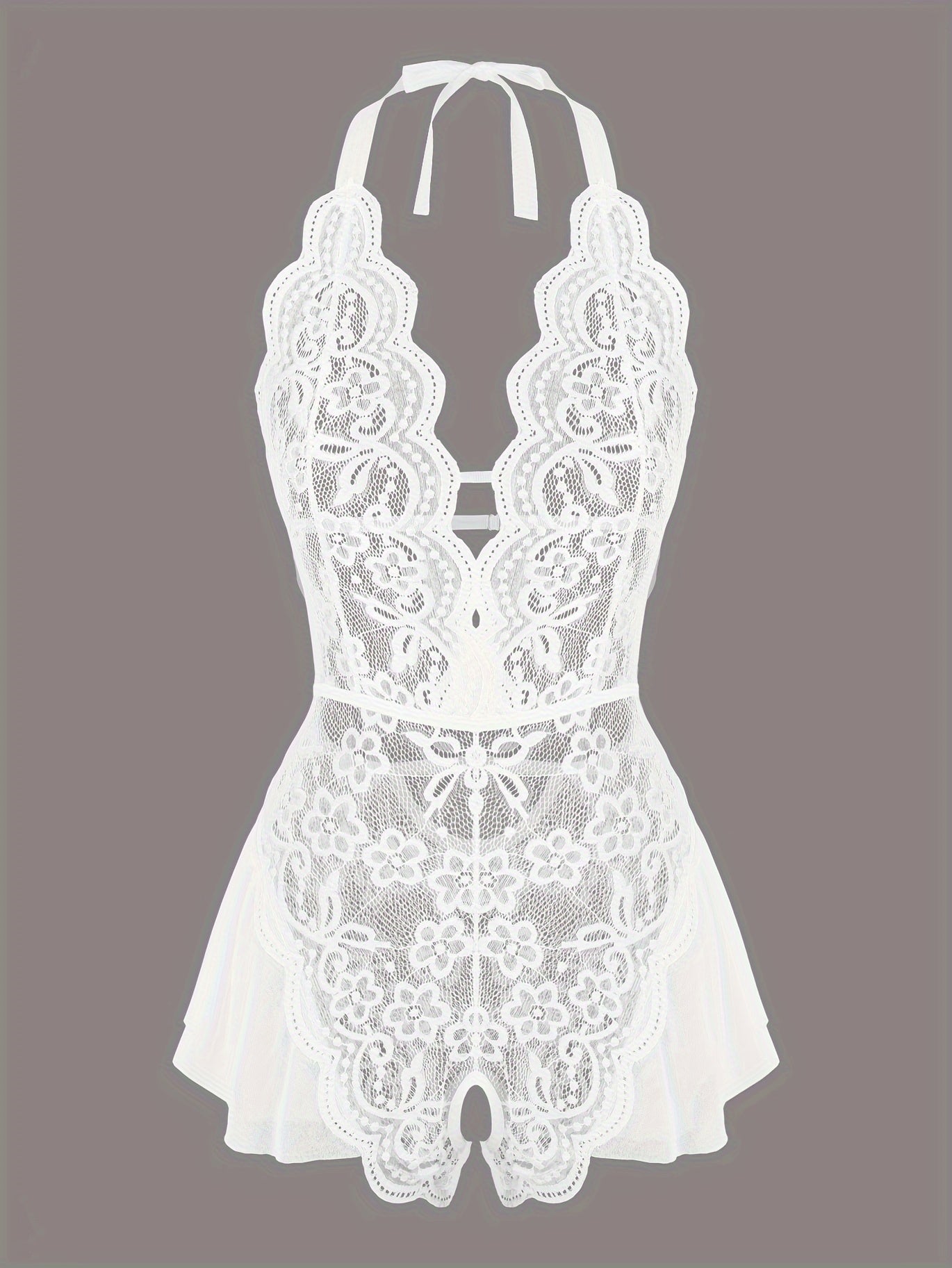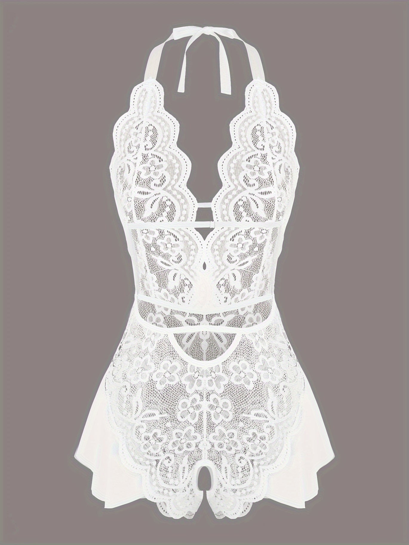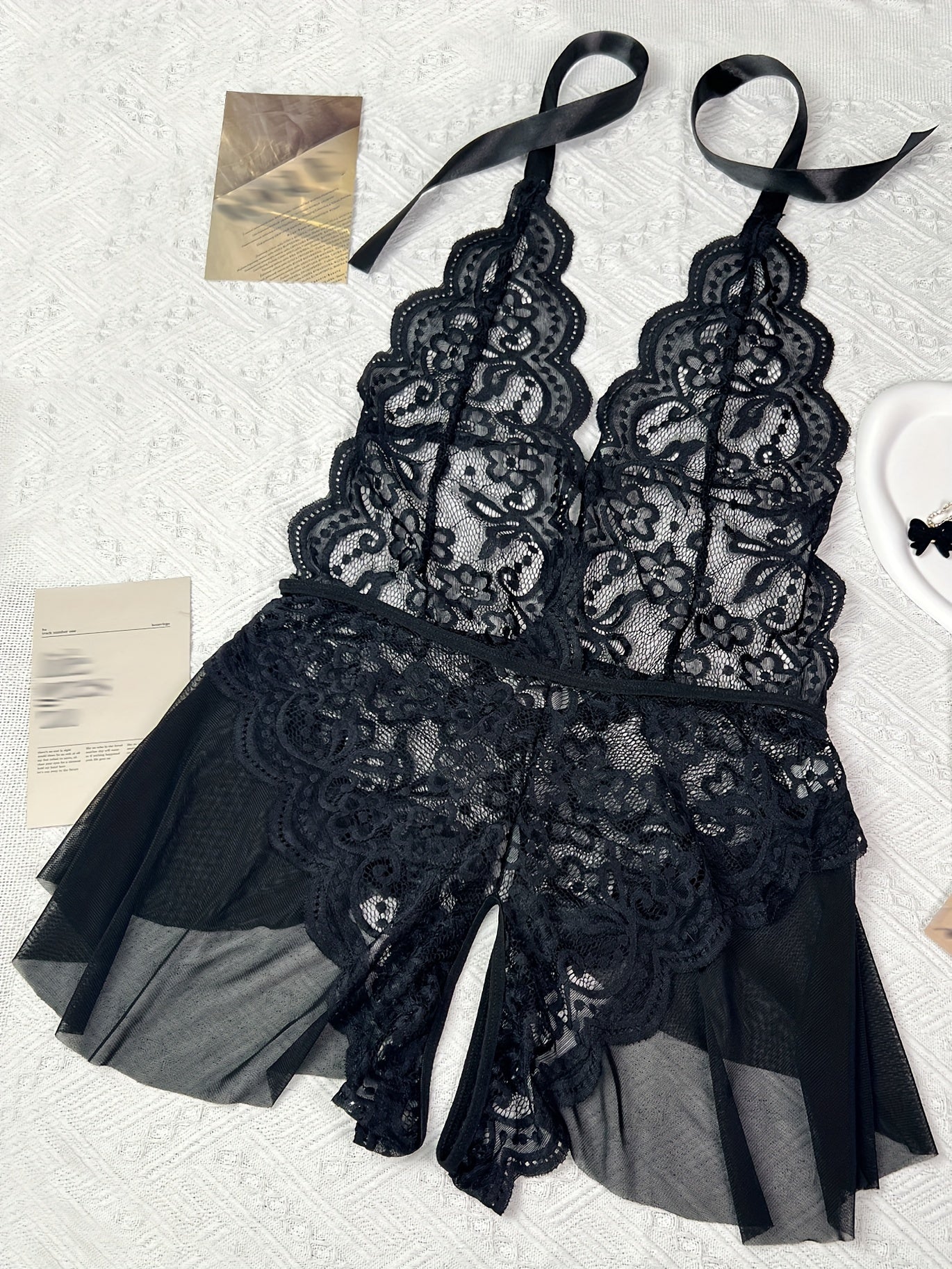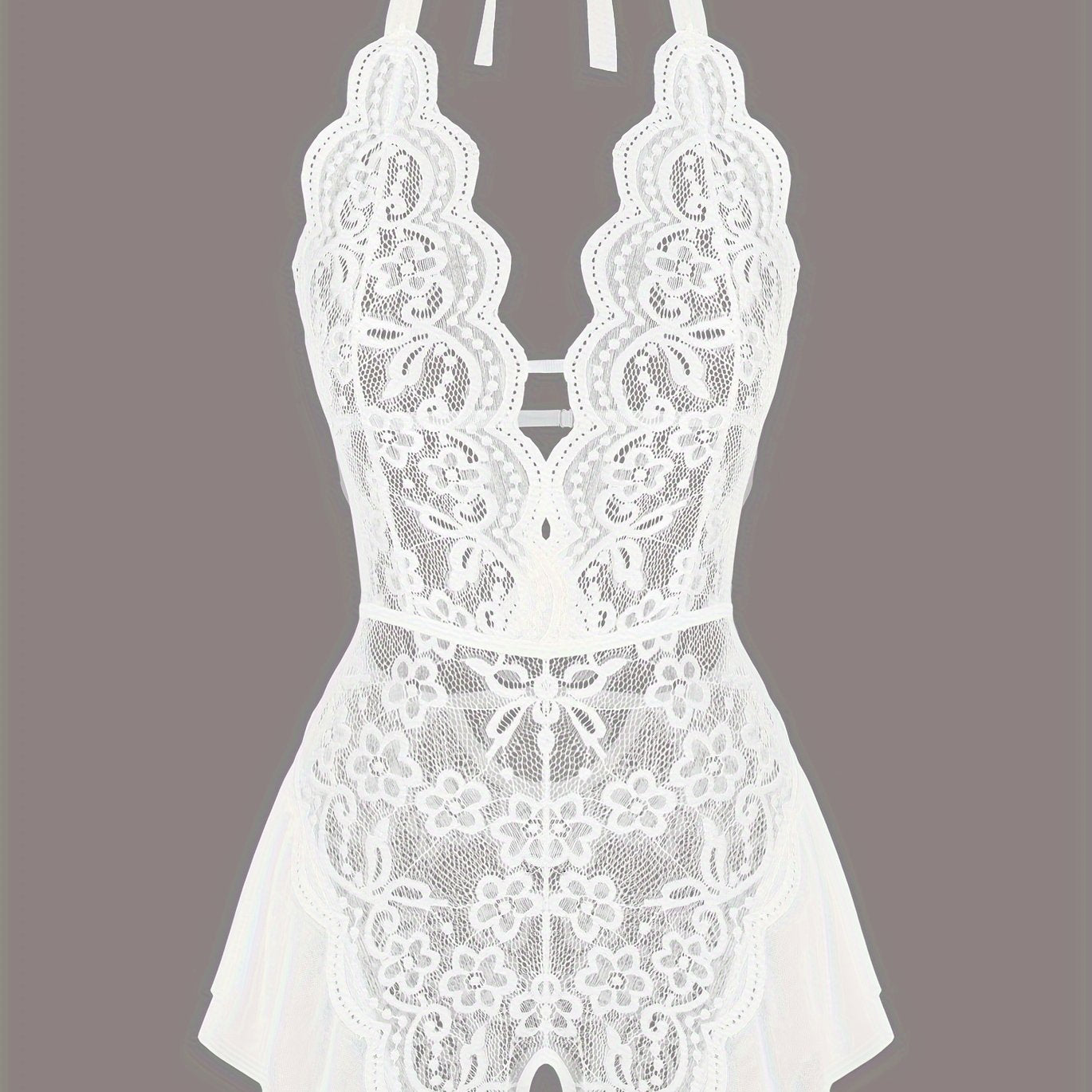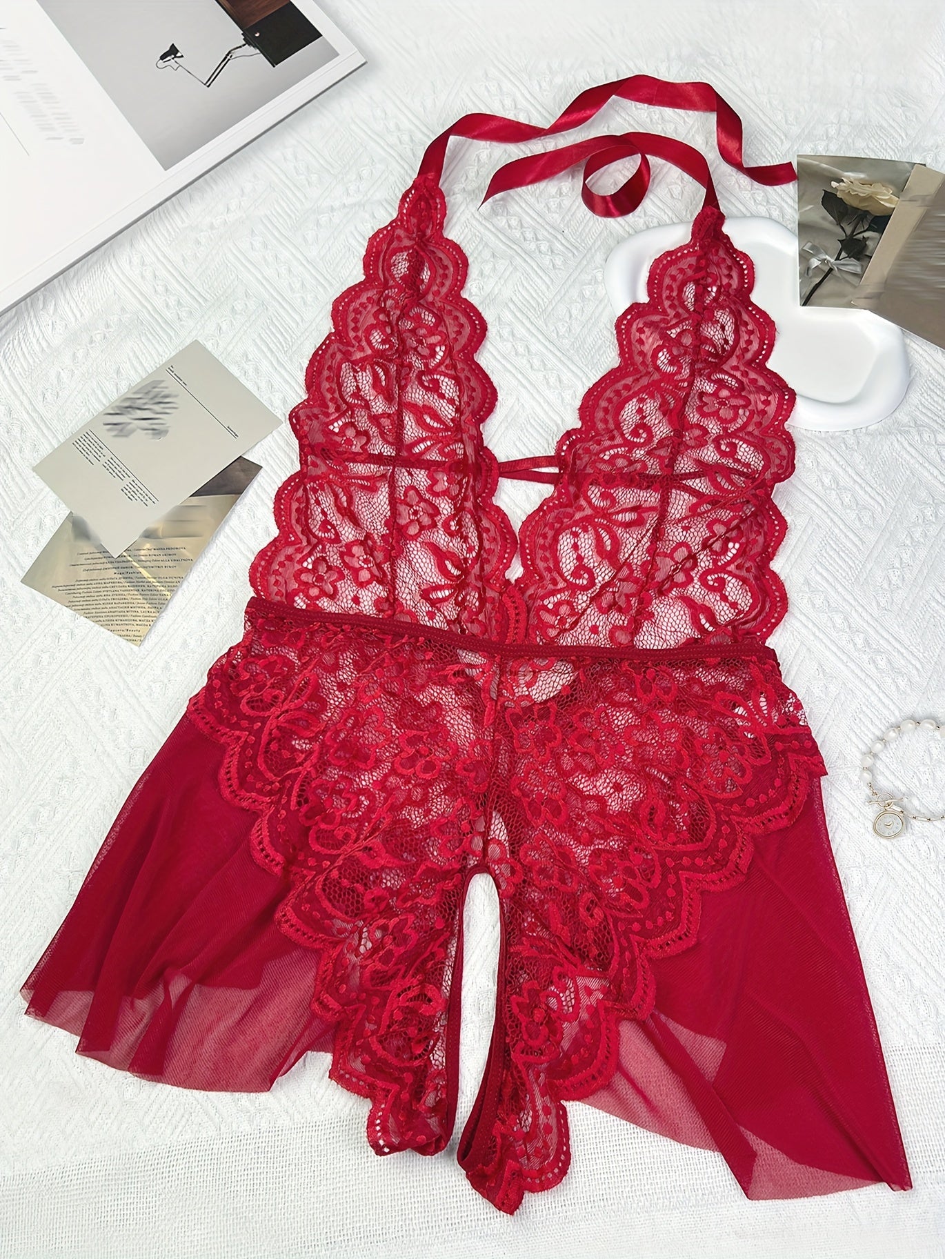 استمتع بارتداء تيدي لميز الجذاب مع حواف من الكروشيه. مصمم بعمق على شكل حرف V مع فتحات في الفخذين، هذا اللباس يعد خيارًا مثاليًا لأمسية خاصة.