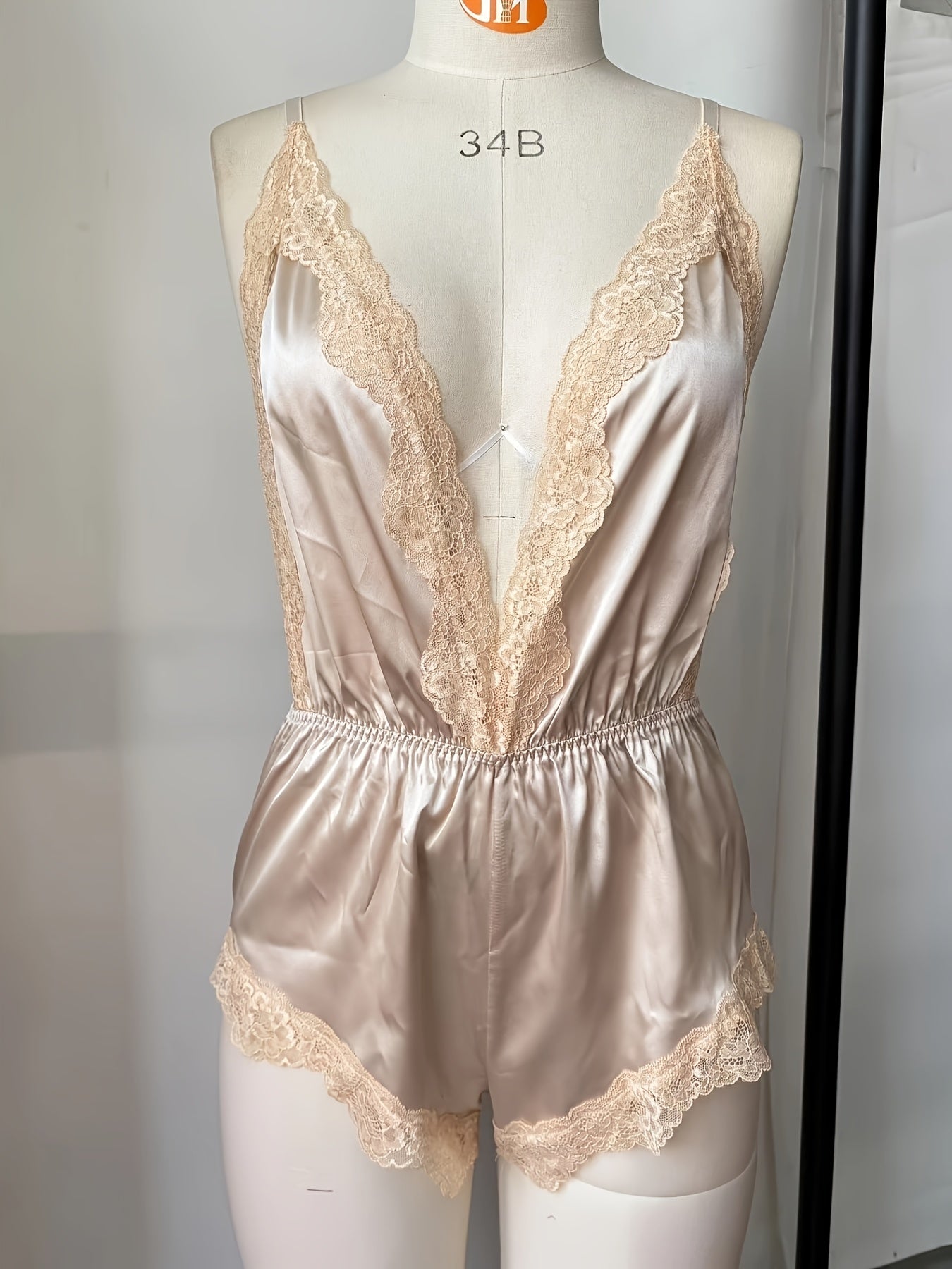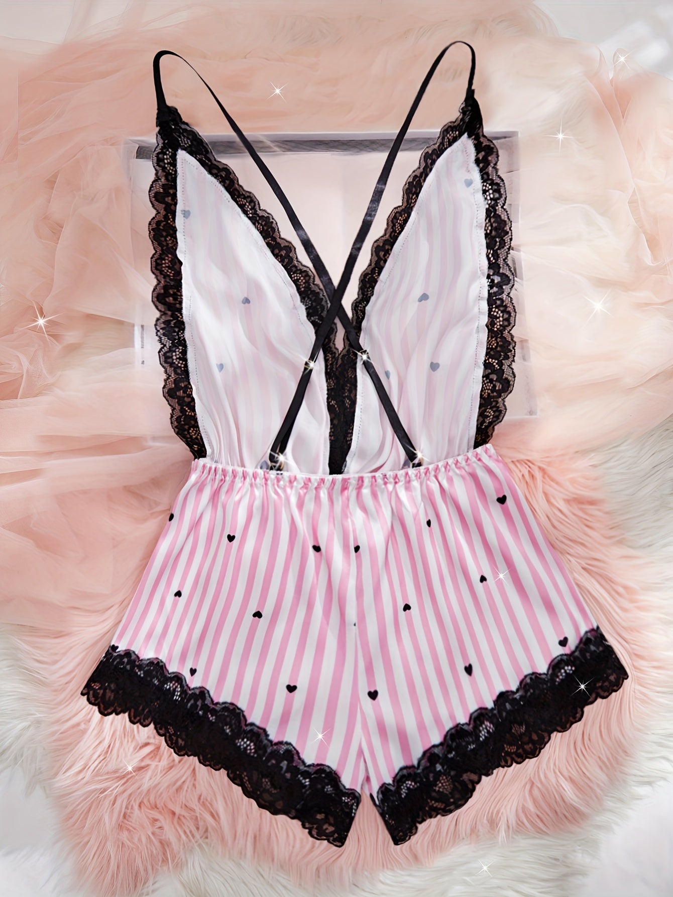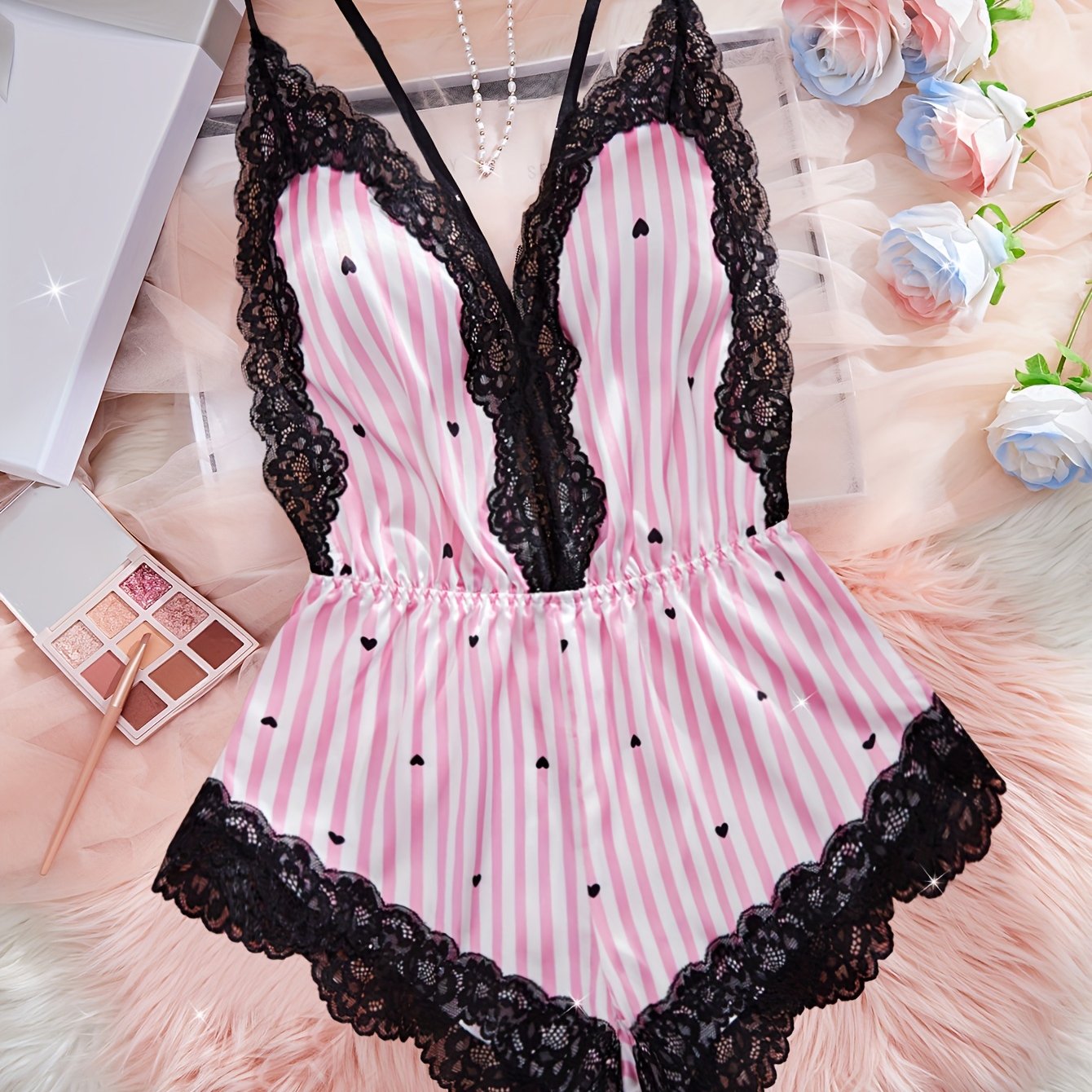 استمتع بأناقة راقية مع ثوب النوم المزخرف باللون الوردي والأبيض مع لمسات من الدانتيل الأسود. يتميز بتصميمه ذو v-neck العميق وخالي من الأكمام، مما يجعله مثالياً للاسترخاء أو للمناسبات الخاصة.