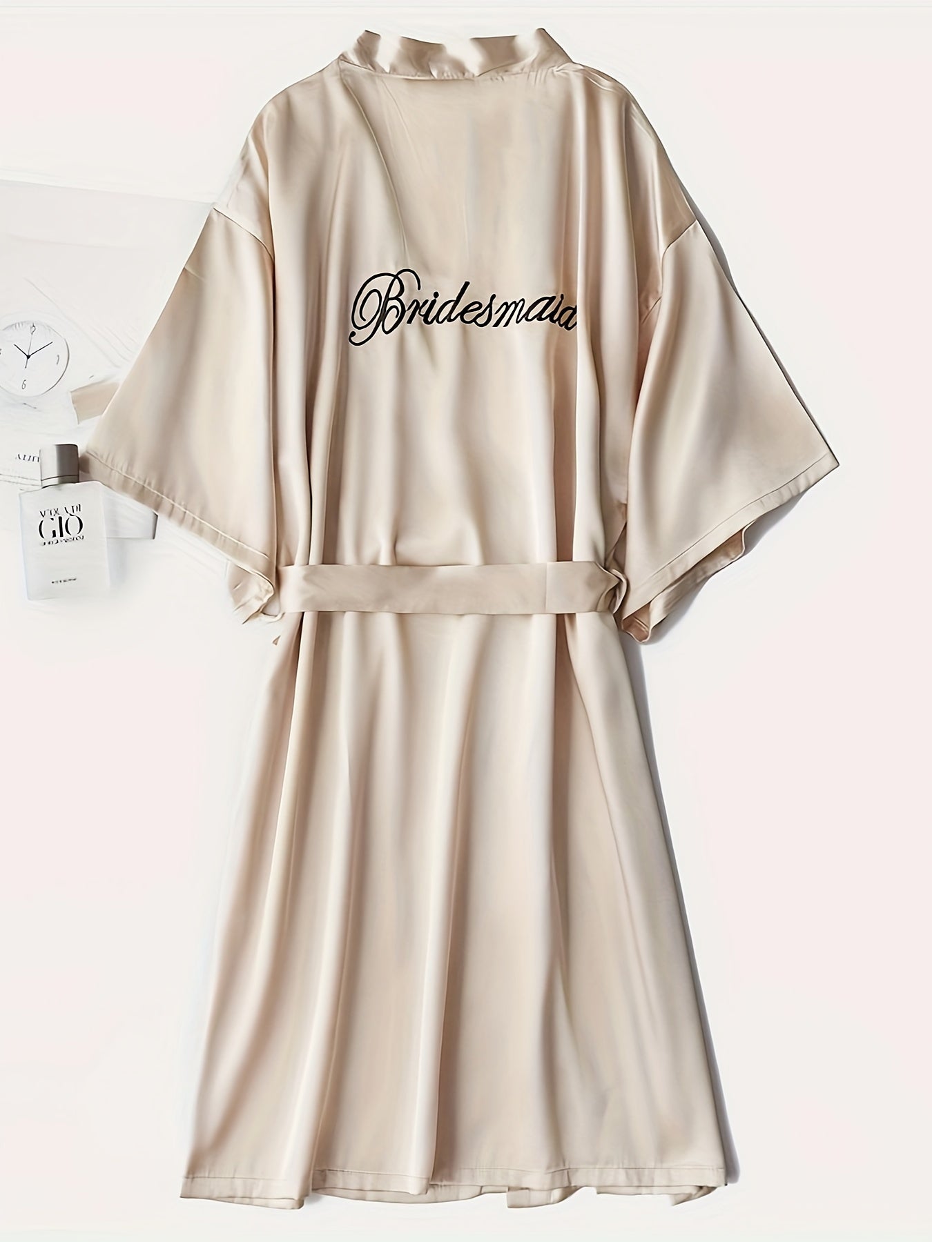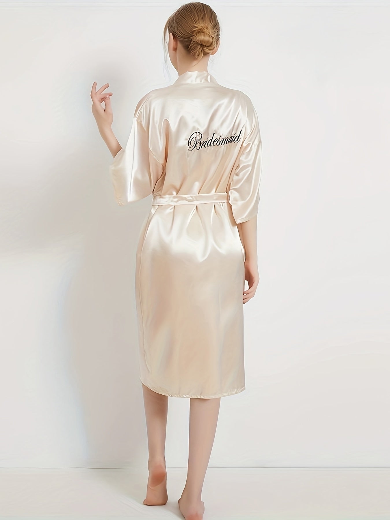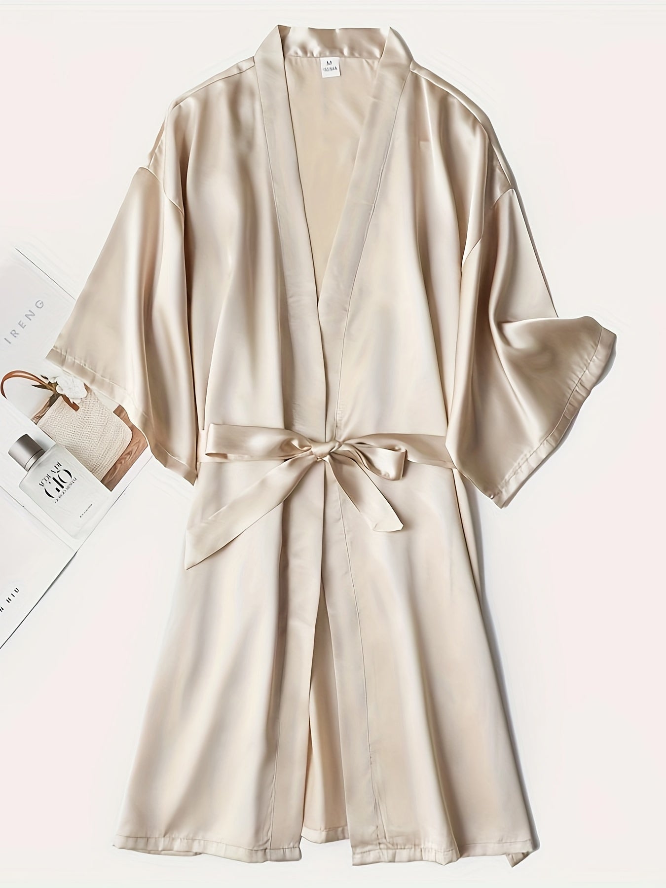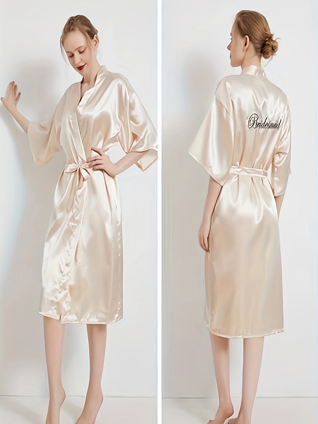روب العروس المتألق المصنوع من الساتان، يجمع بين الأناقة والراحة. يتميز بياقة على شكل V وأكمام نصفية، مع حزام للخصر لإضفاء لمسة جمالية.