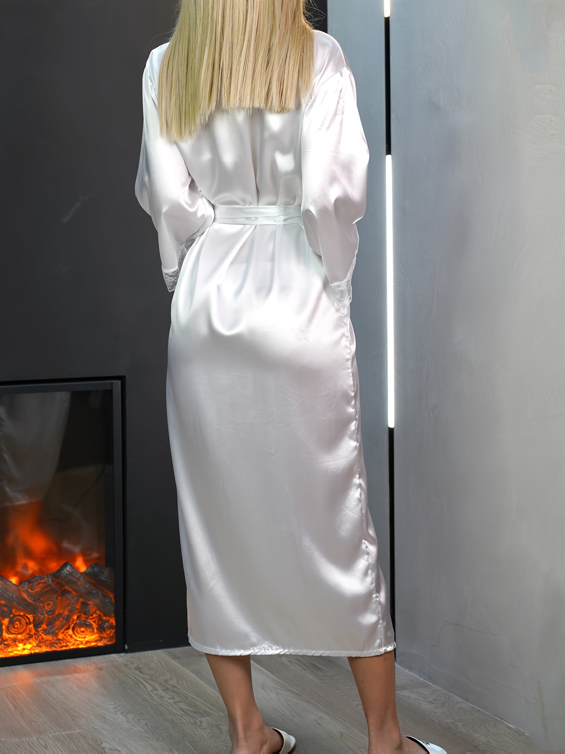 استمتع بإطلالة أنيقة ومريحة مع هذا الروب ساتان النسائي. يحتوي على خصر محزم وأكمام مزخرفة، مما يجعله مثالياً للاستخدام في المنزل أو السبا.