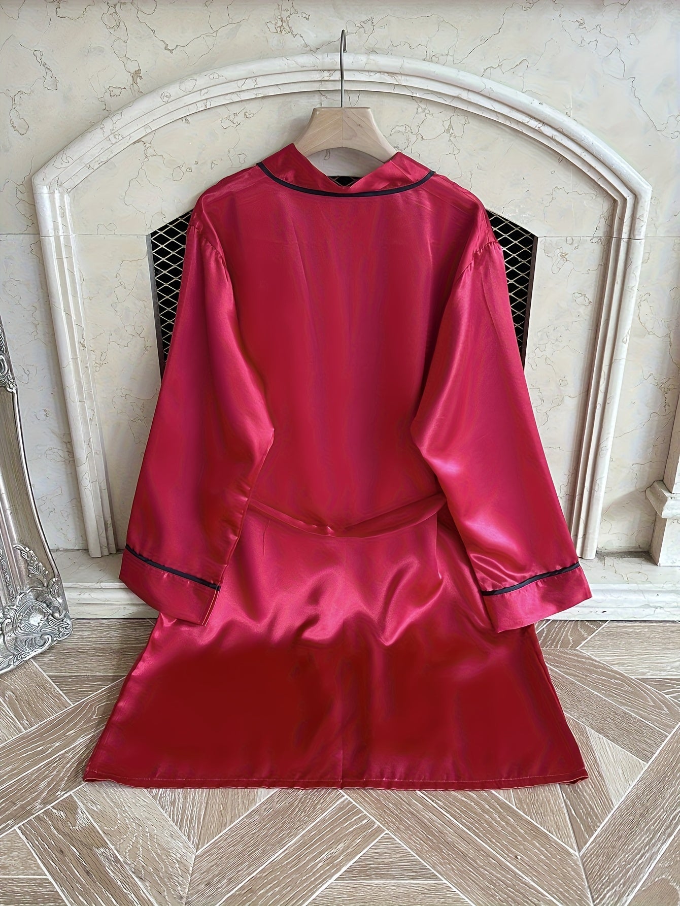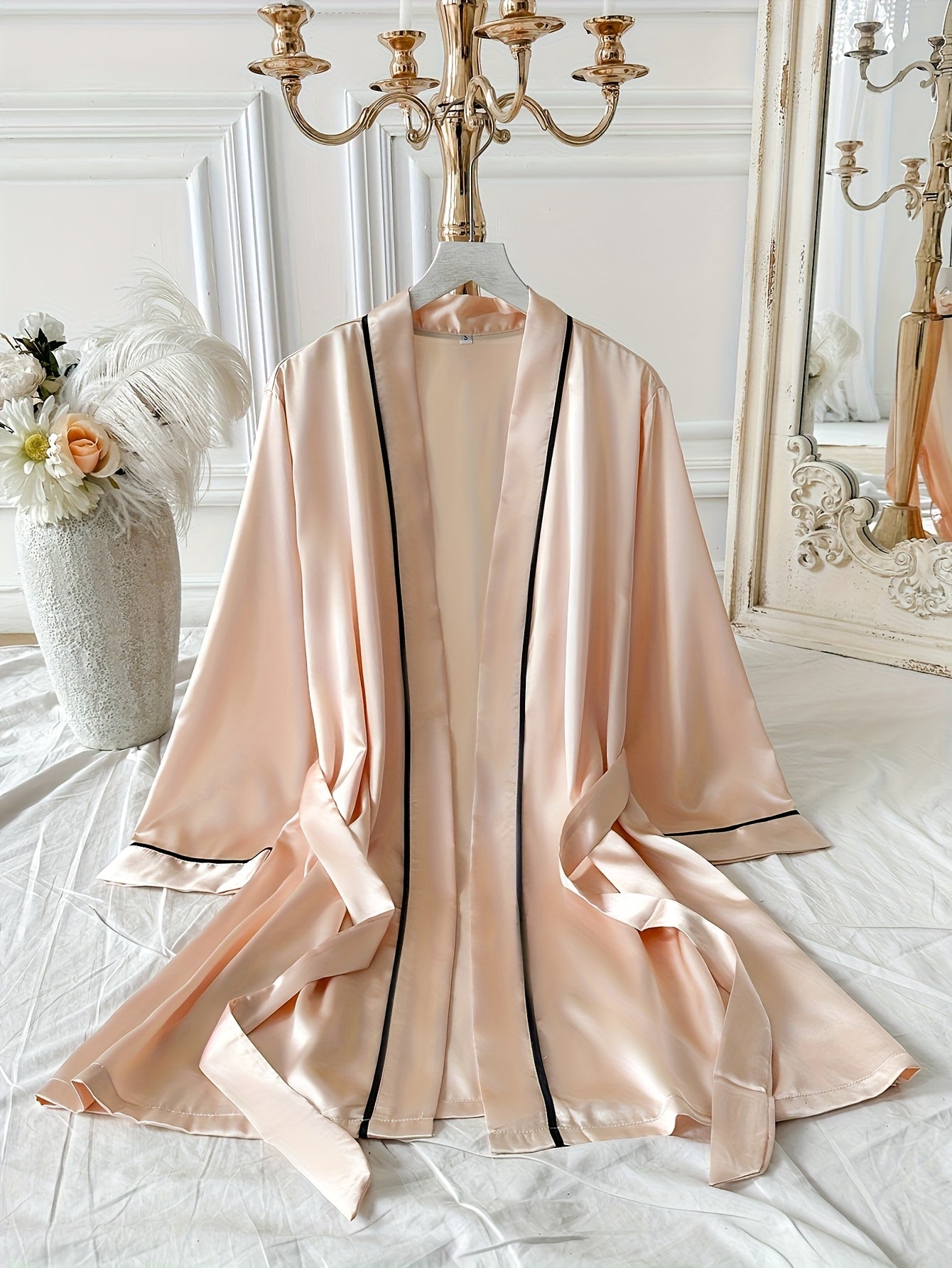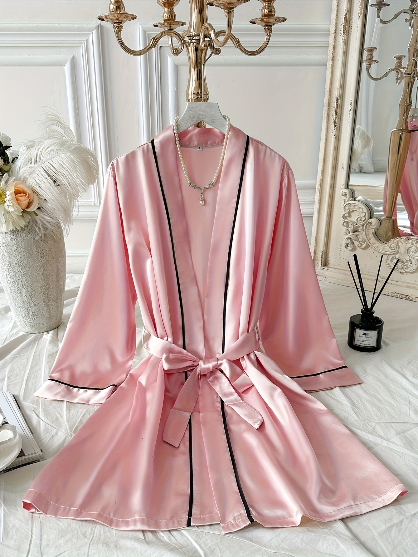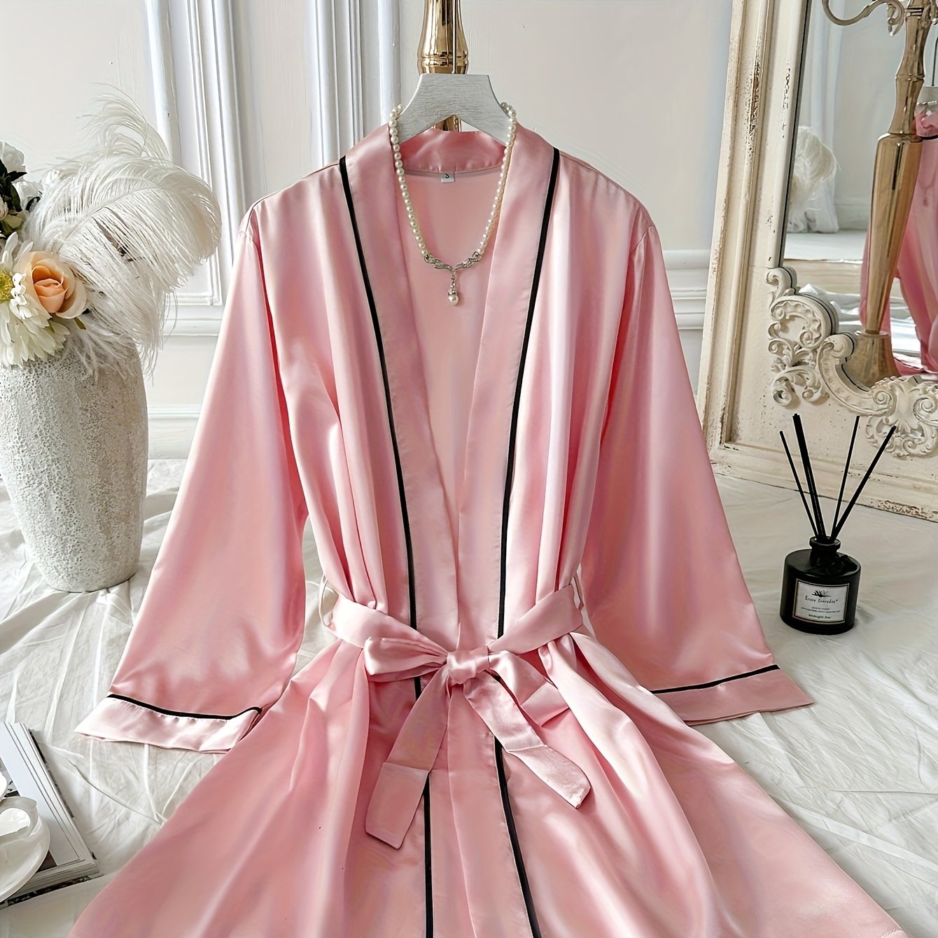 استمتعي بأناقة وراحة لا مثيل لهما مع روب الساتان النسائي باللون الوردي. يتميز بتفاصيل سوداء أنيقة وأكمام طويلة، مما يجعله مثالياً للاستخدام المنزلي والراحة.