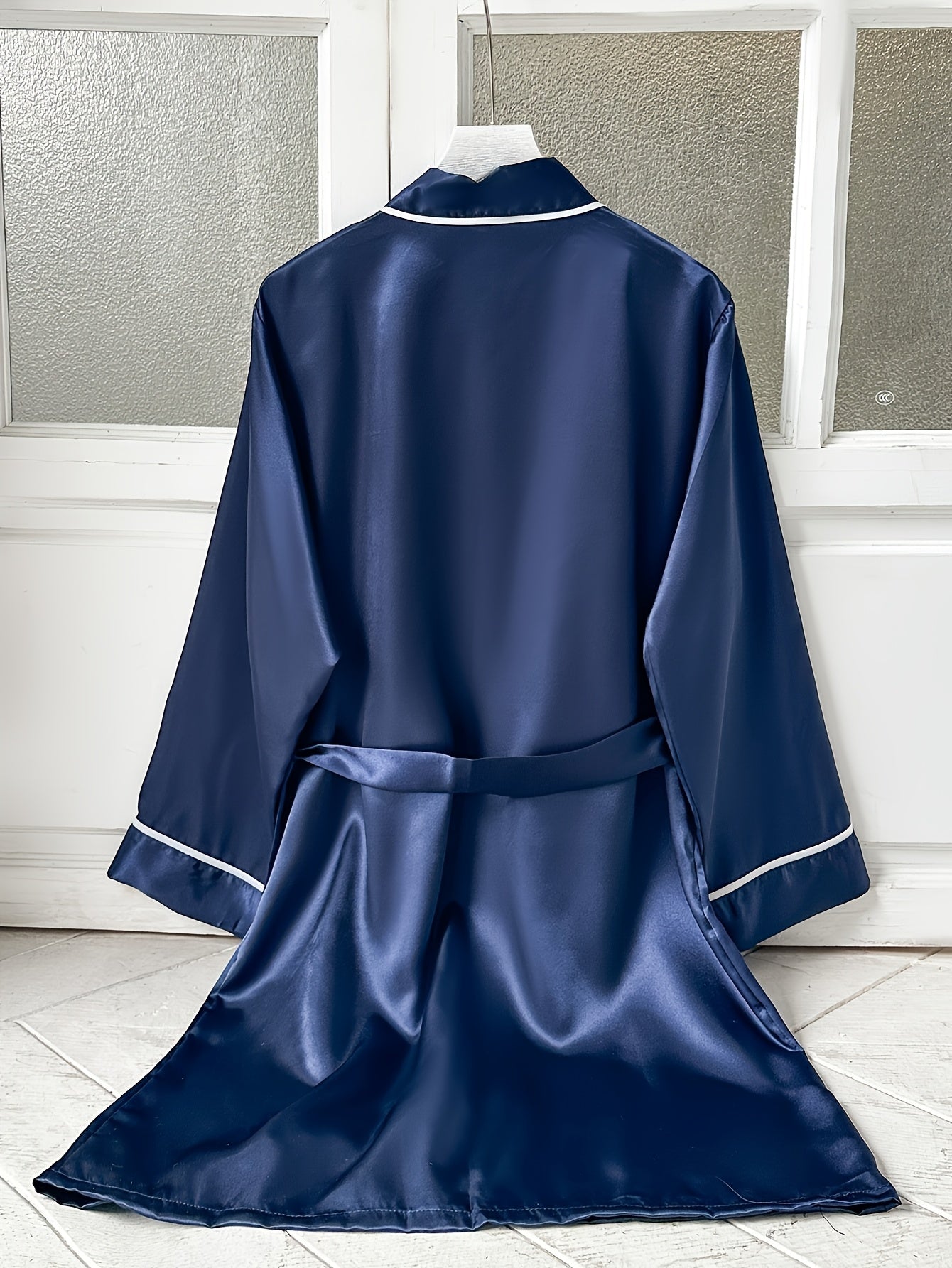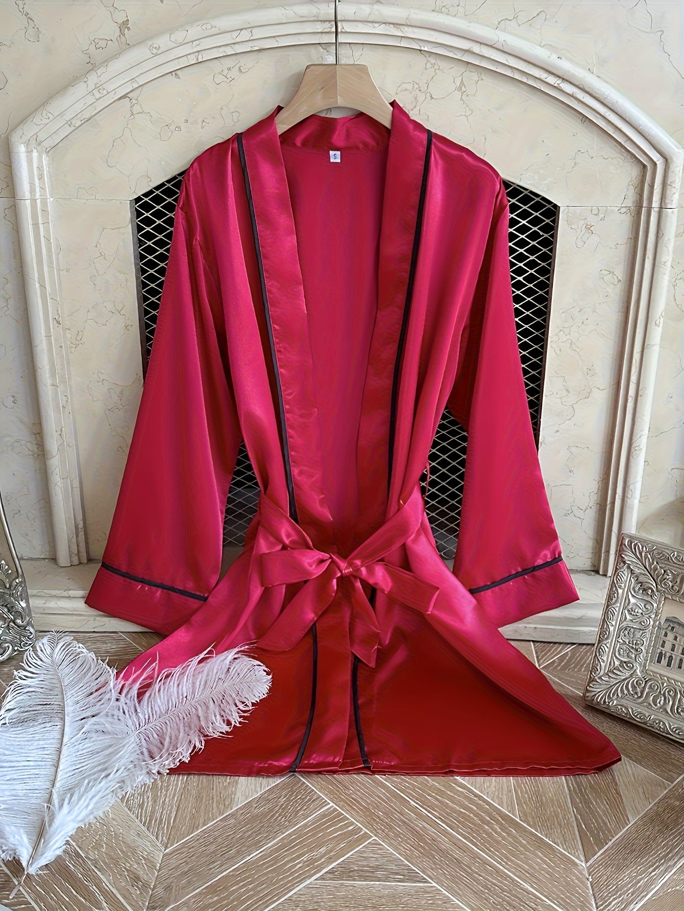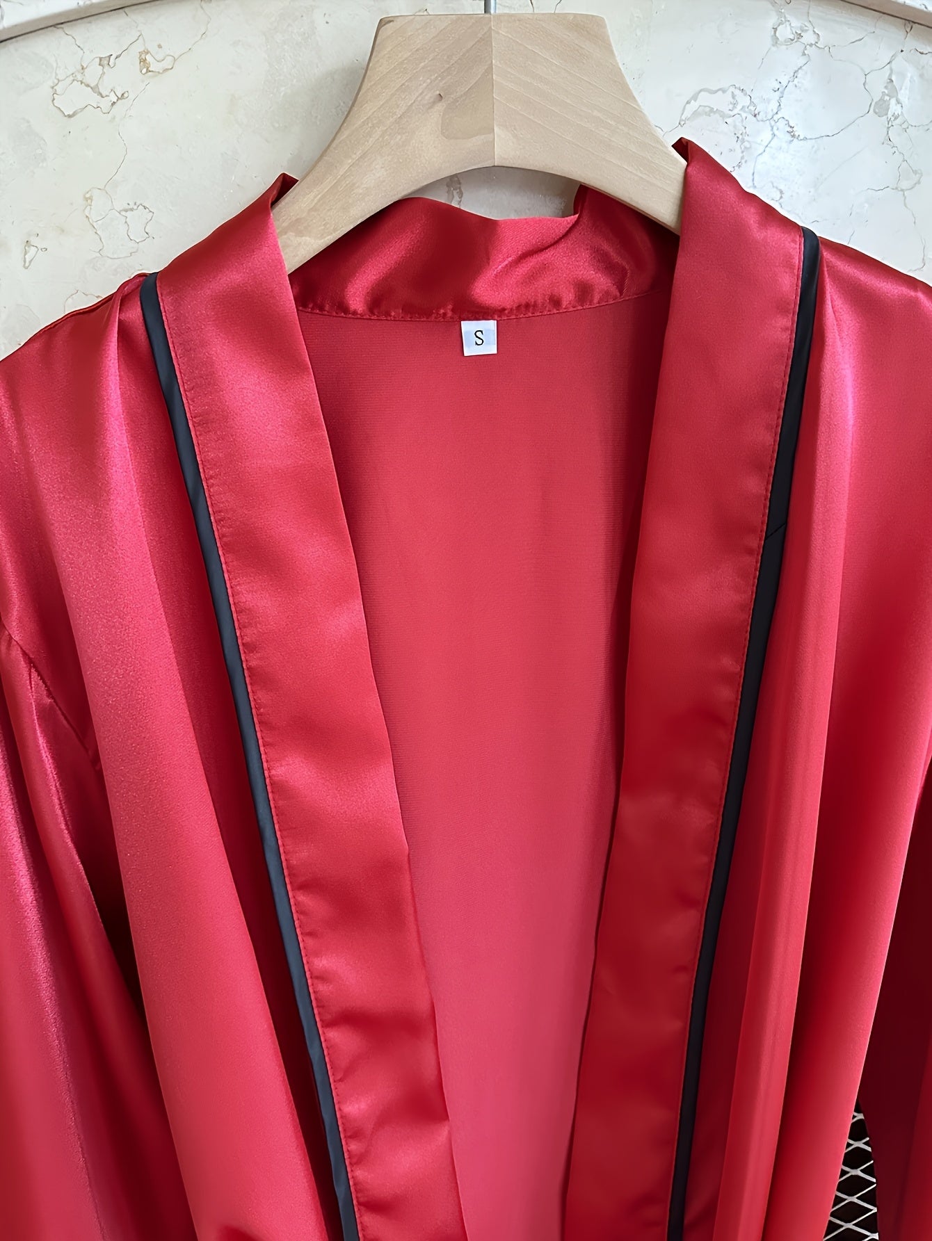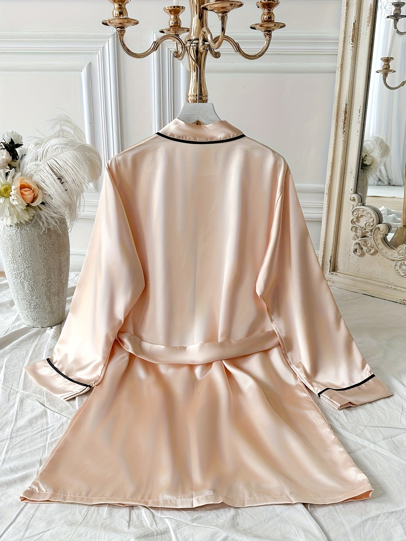 استمتعي بأناقة وراحة لا مثيل لهما مع روب الساتان النسائي باللون الوردي. يتميز بتفاصيل سوداء أنيقة وأكمام طويلة، مما يجعله مثالياً للاستخدام المنزلي والراحة.