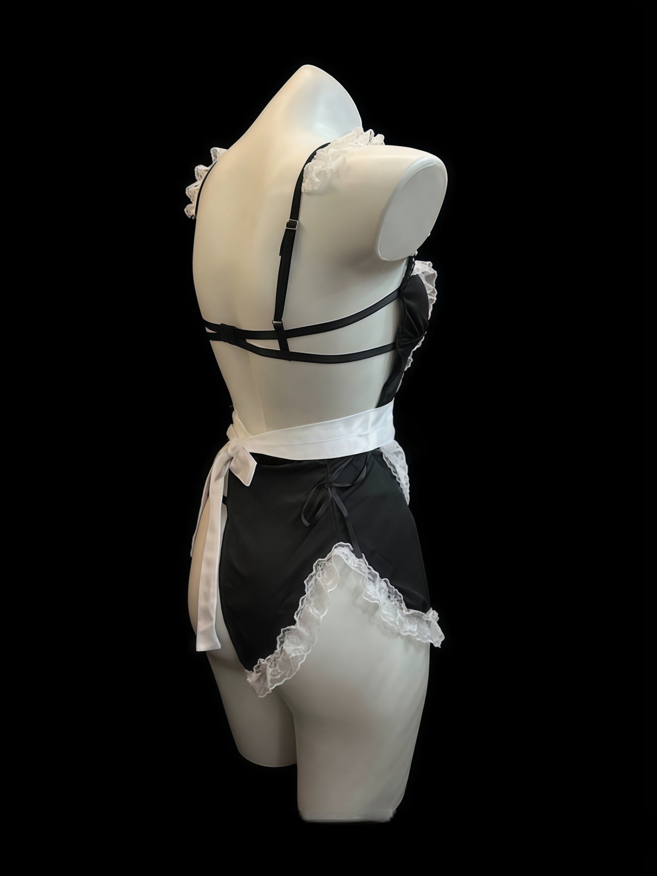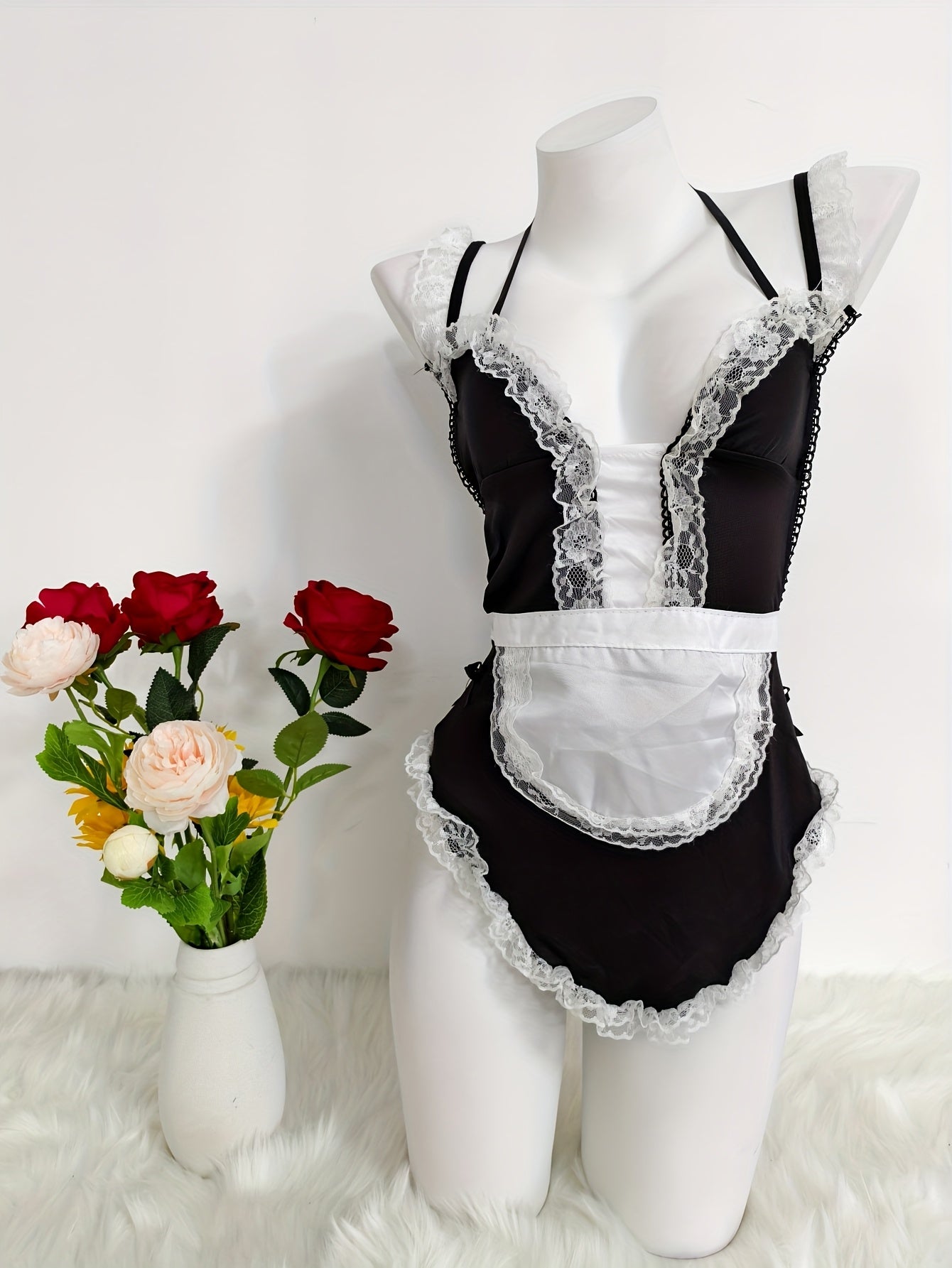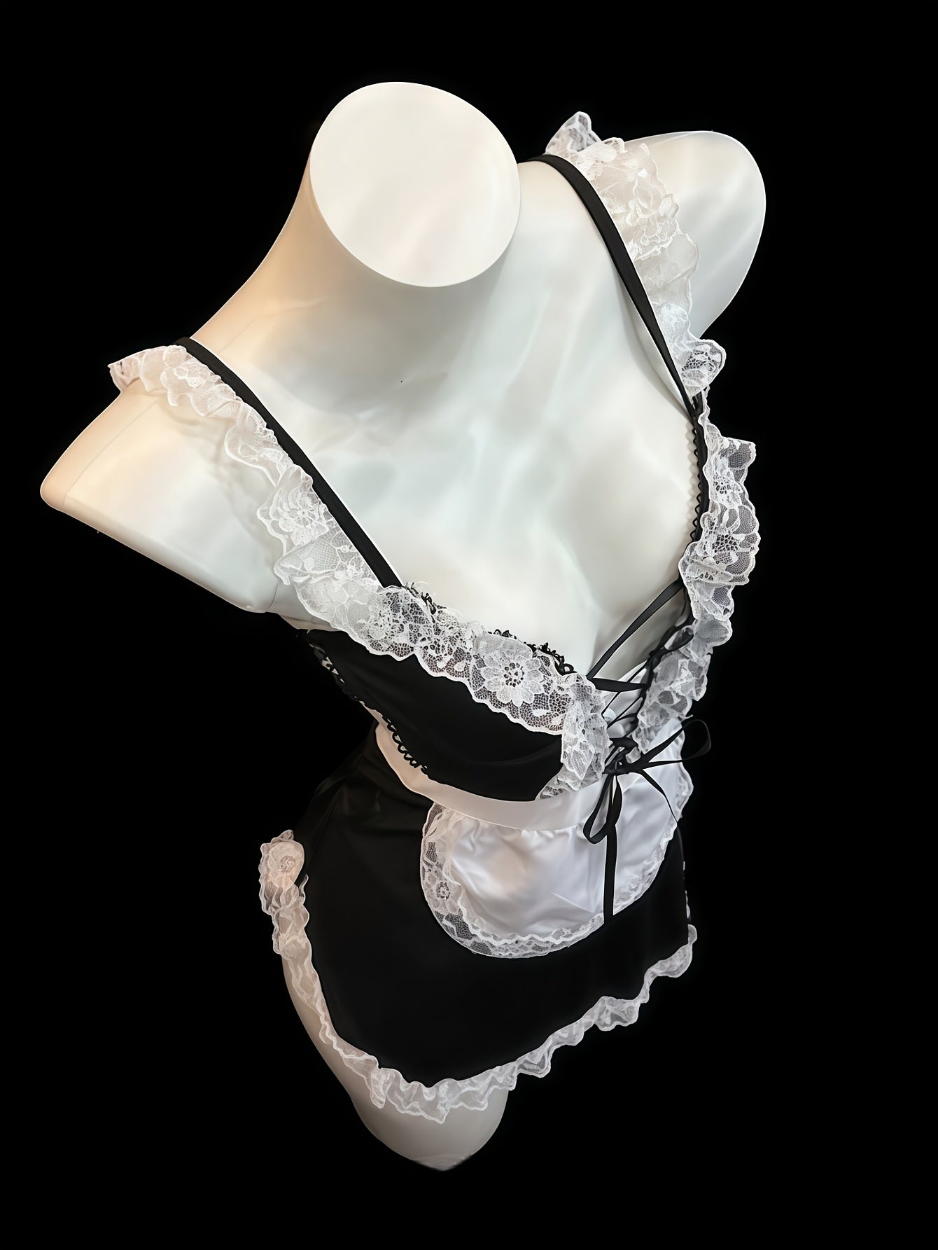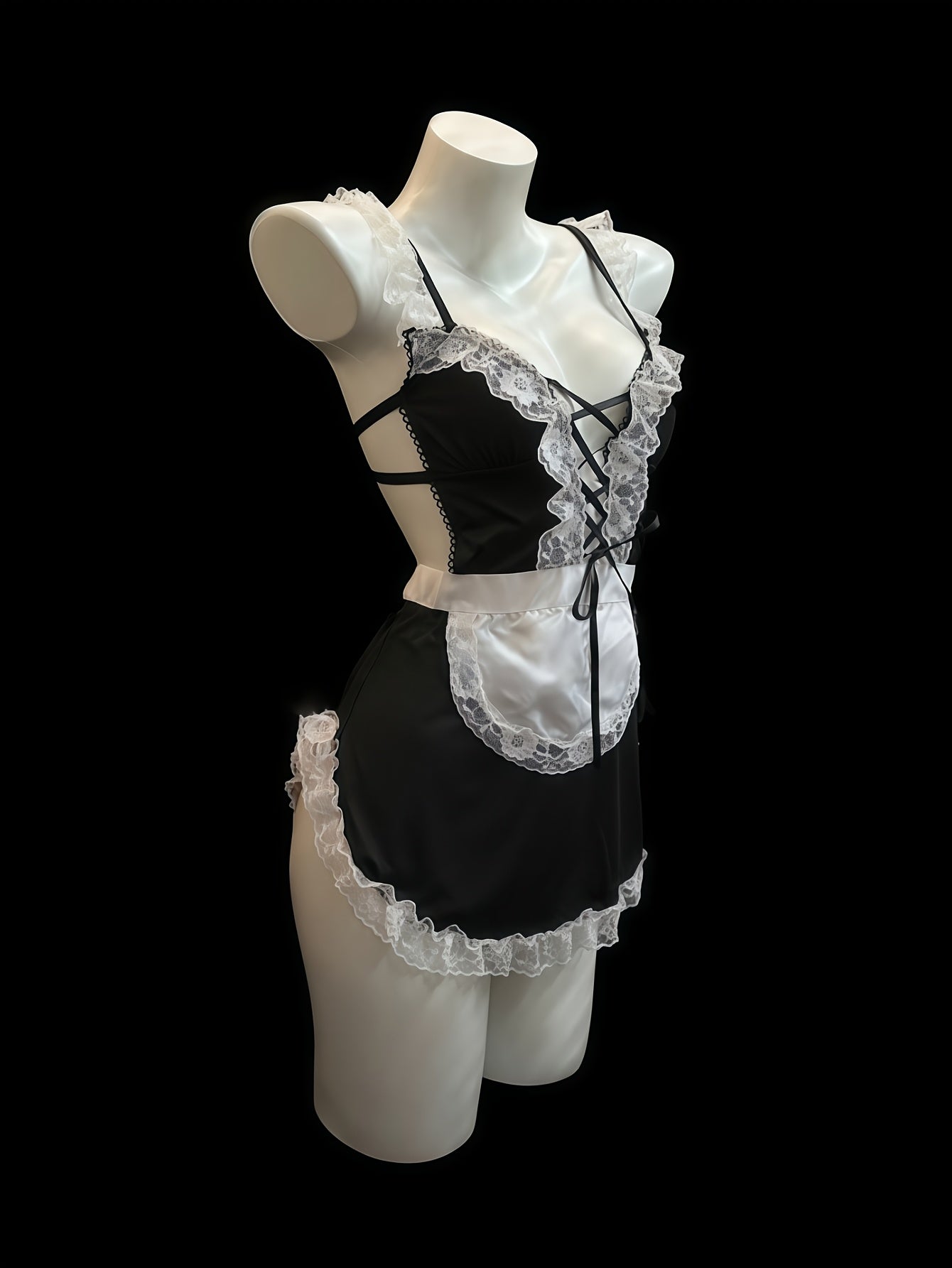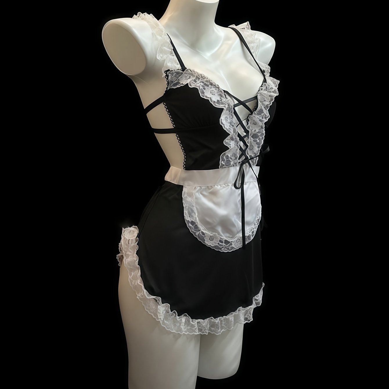 استمتع بإطلالة مثيرة مع زي الخادمة الأنيق باللونين الأسود والأبيض. يتميز بتفاصيل لؤلؤية وسكرت معينة، مما يجعله مثالياً للمناسبات الخاصة.