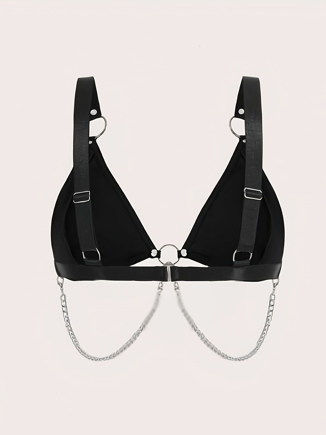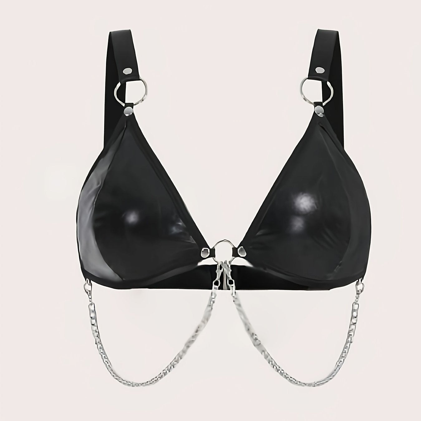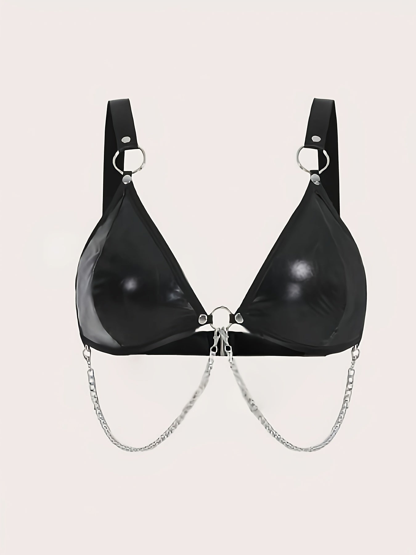 استمتعي بإطلالة مثيرة مع هذه الصدرية النسائية الفريدة المصنوعة من الجلد الصناعي. تتميز بتفاصيل السلسلة وأقمشة محبوكة مريحة.
