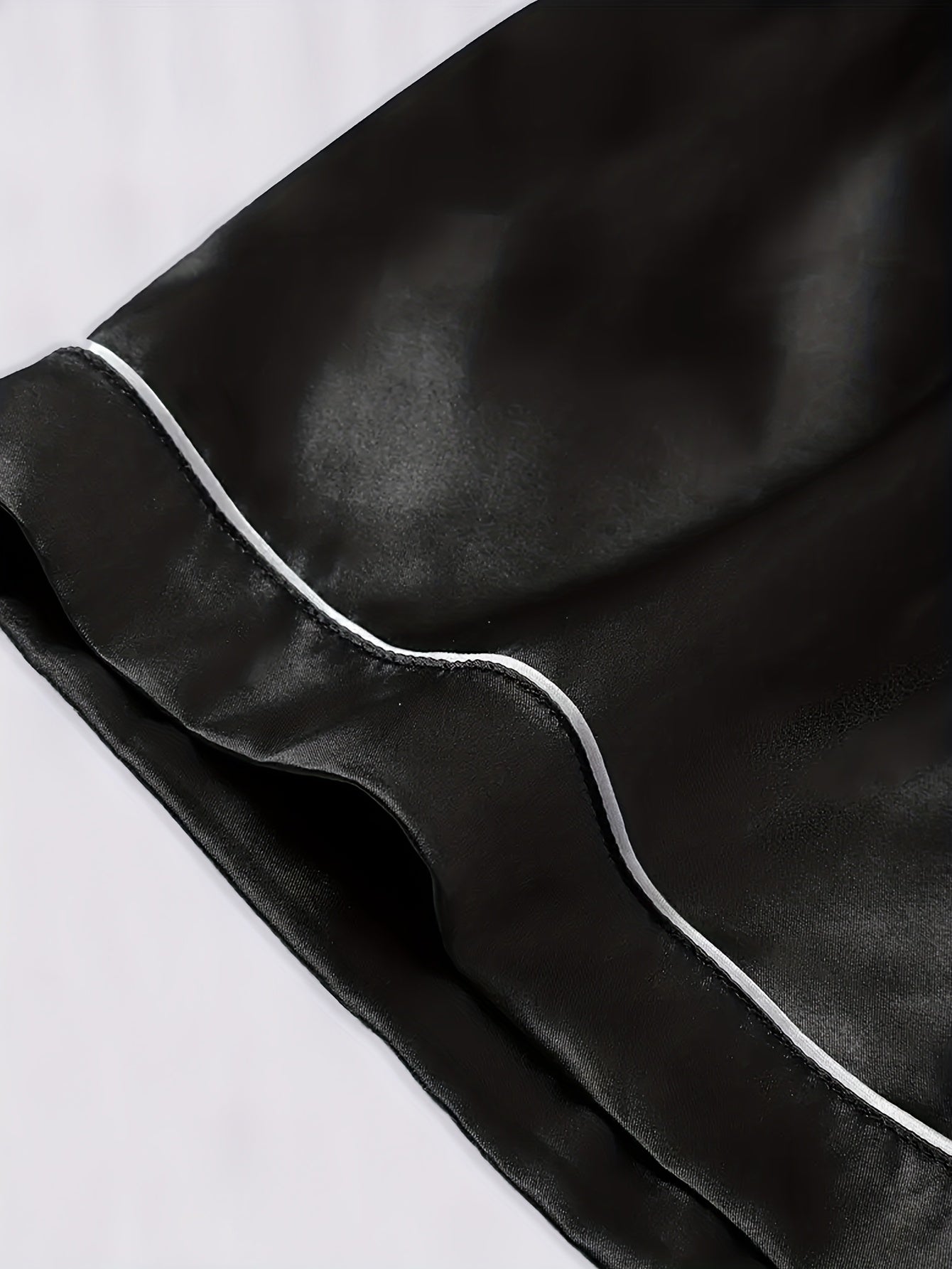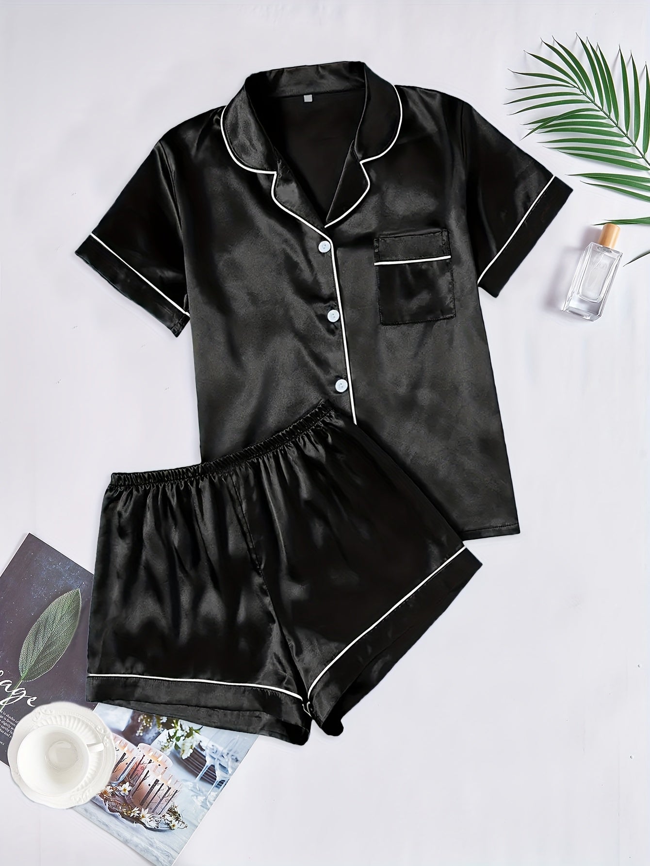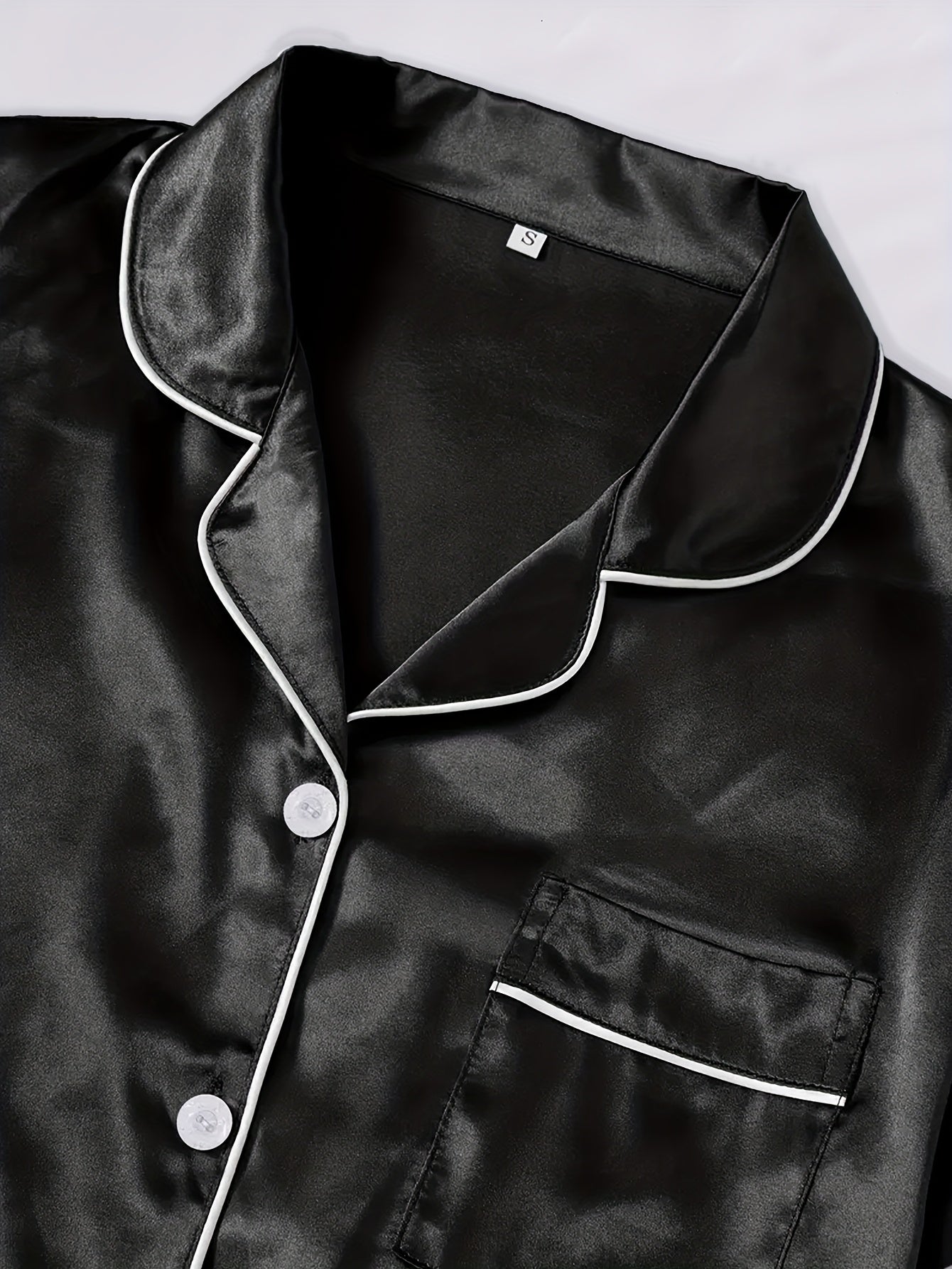 استمتع براحة لا تضاهى مع طاقم البيجاما الأنيق المصنوع من قماش ساتان. يشمل مجموعة من الأعلى المكون من أزرار وأساور قصيرة الساقين، مما يجعله مثاليًا للاستخدام في المنزل.