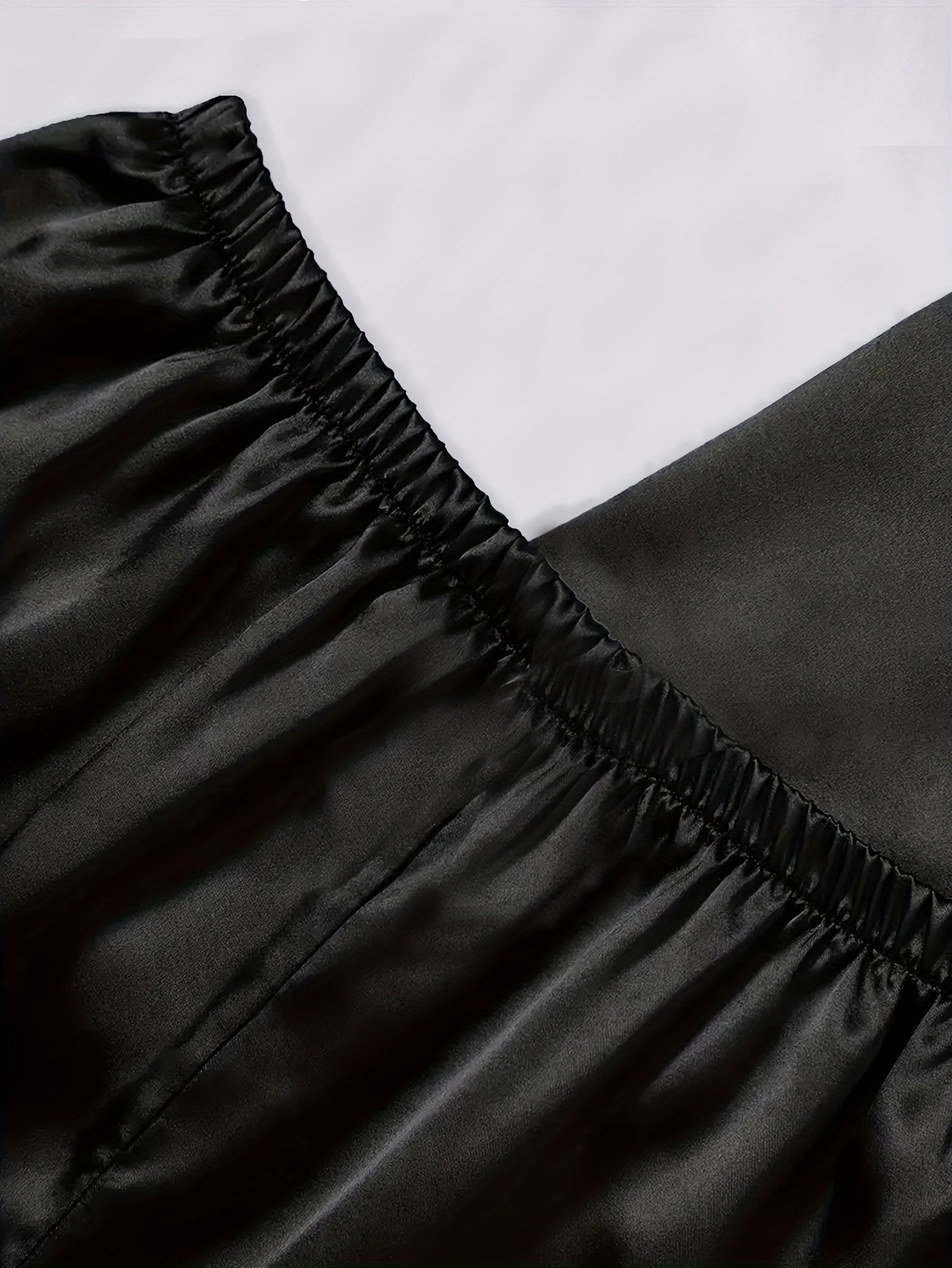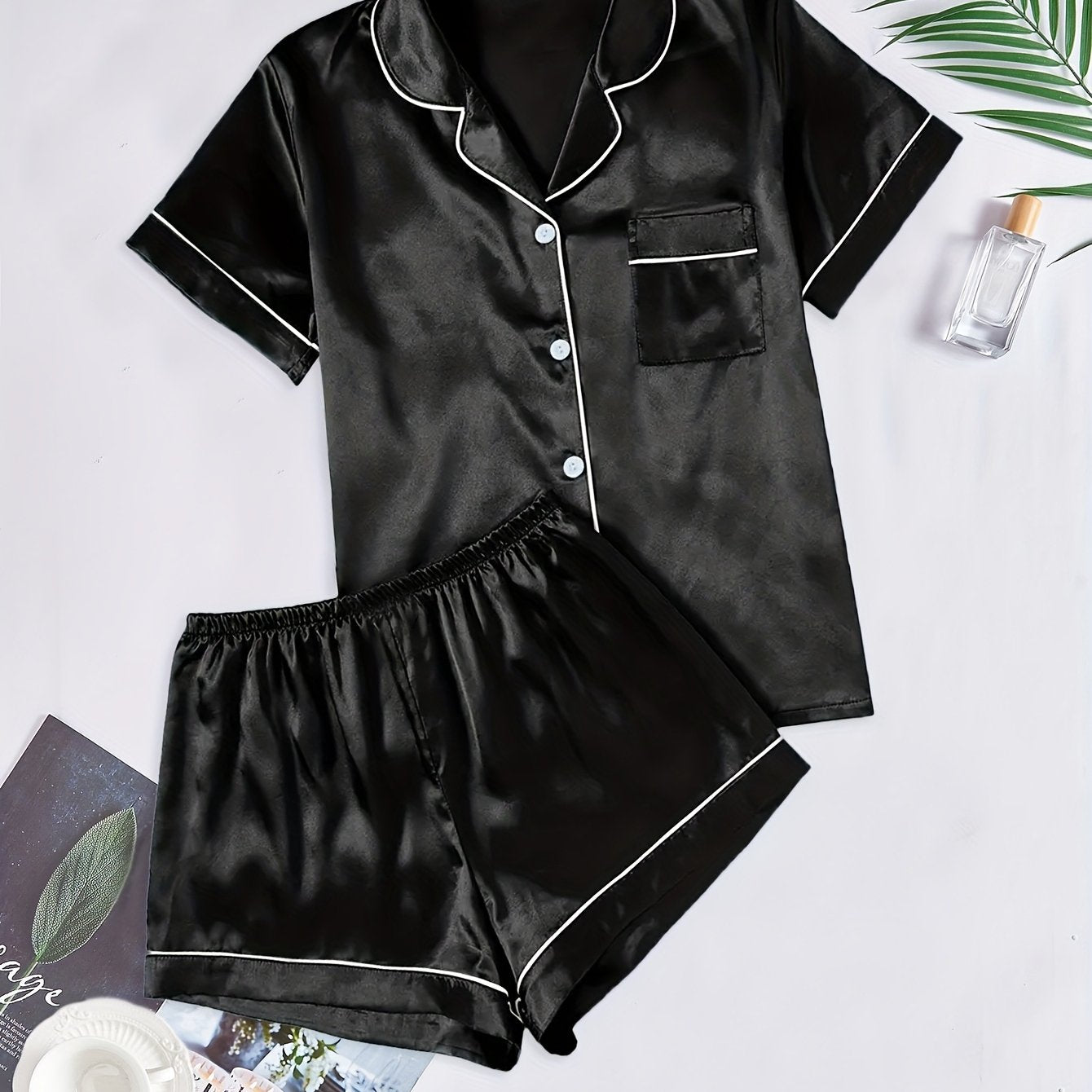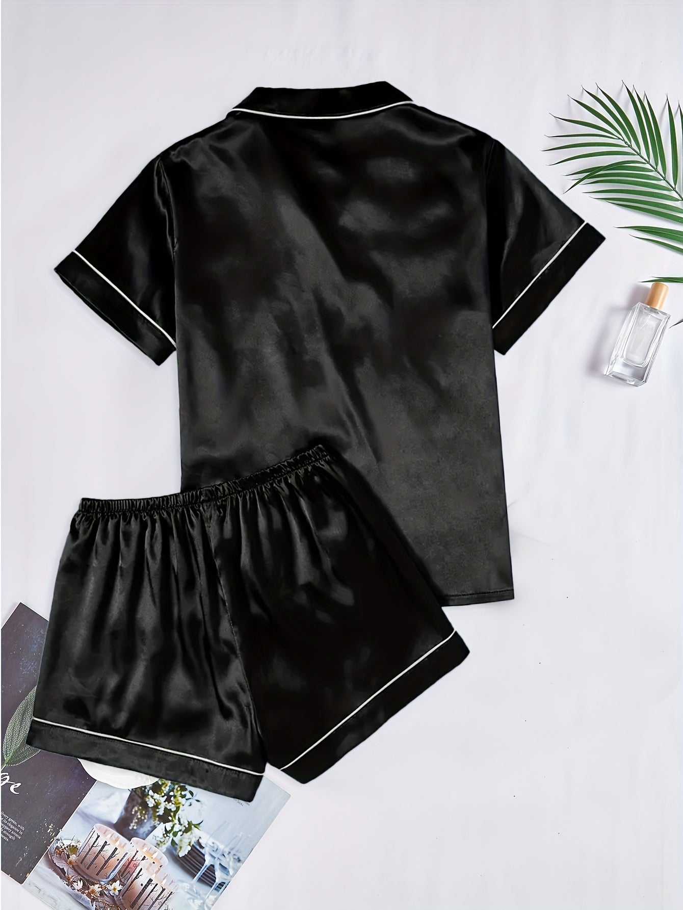 استمتع براحة لا تضاهى مع طاقم البيجاما الأنيق المصنوع من قماش ساتان. يشمل مجموعة من الأعلى المكون من أزرار وأساور قصيرة الساقين، مما يجعله مثاليًا للاستخدام في المنزل.