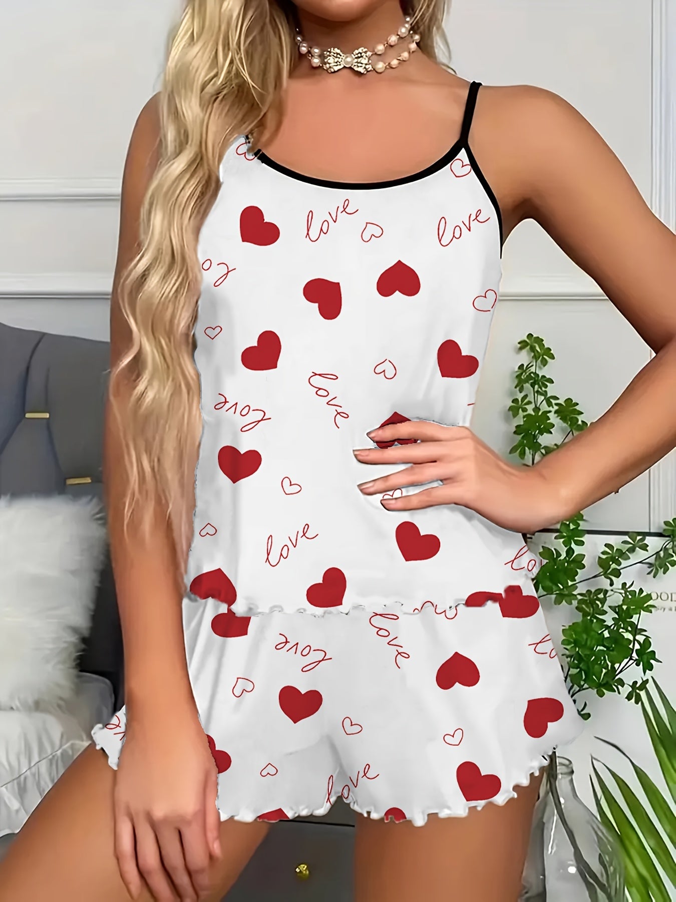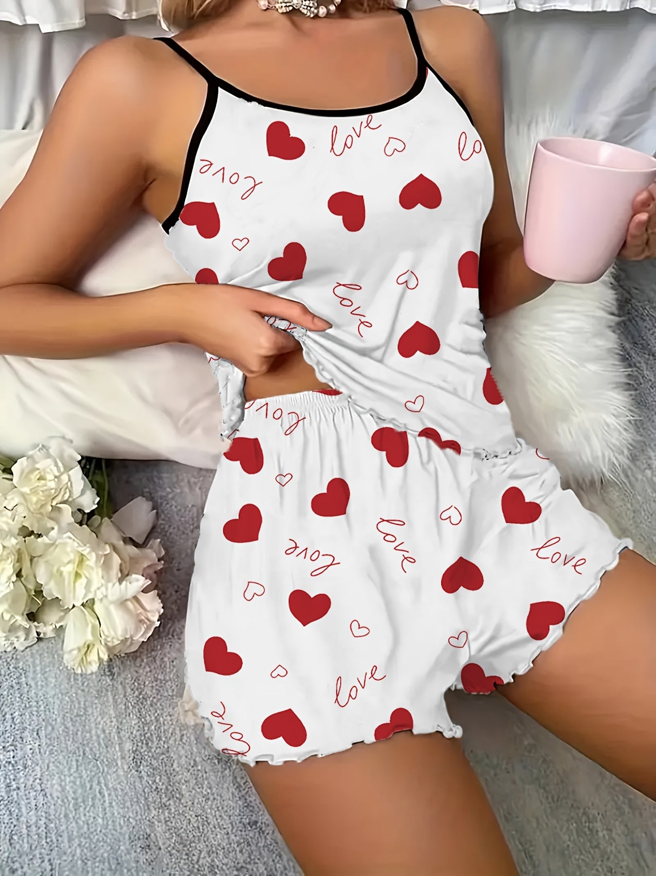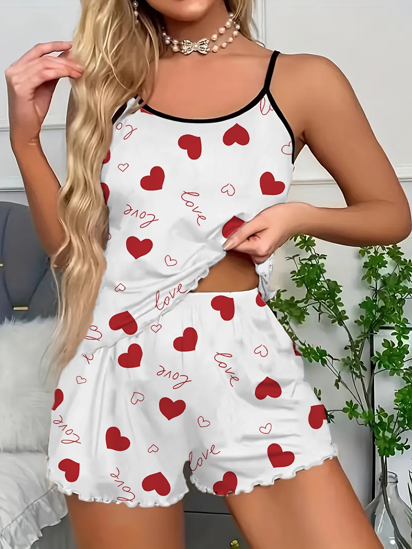 استمتع بأقصى درجات الراحة والأناقة مع طقم البيجاما النسائي المثير. يتميز بتصميمه الجذاب مع حمالات سباغيتي ونقشة قلوب رائعة.