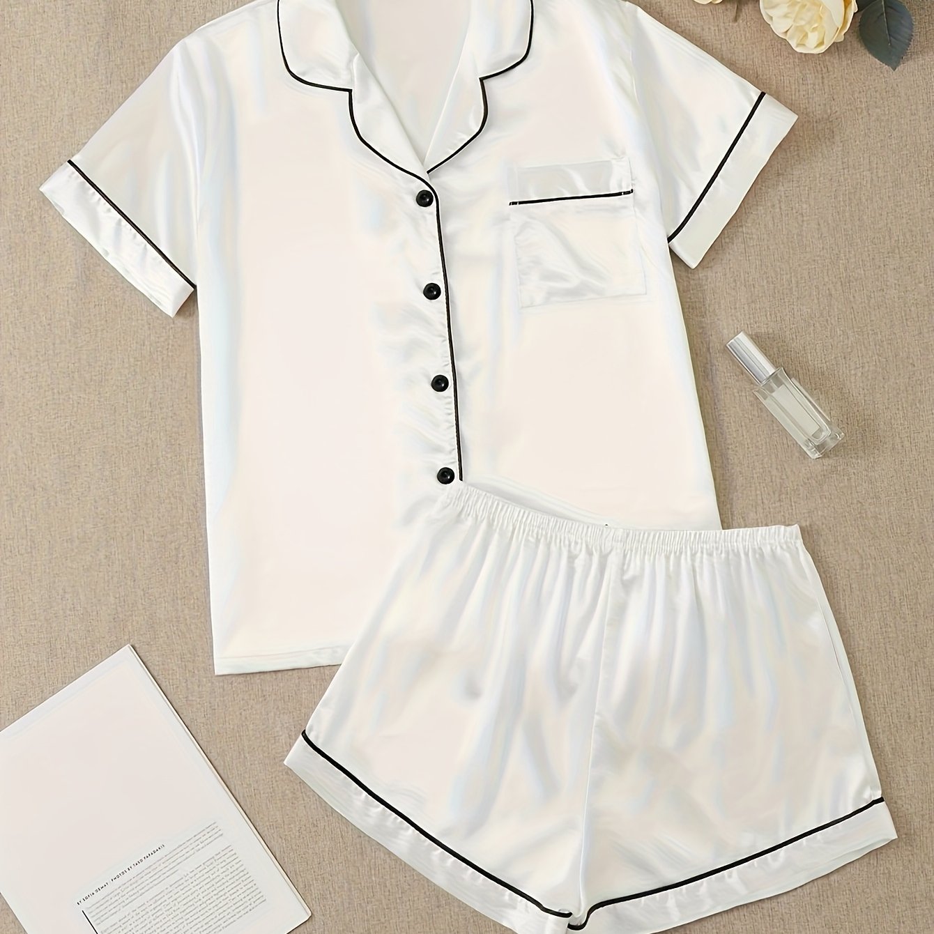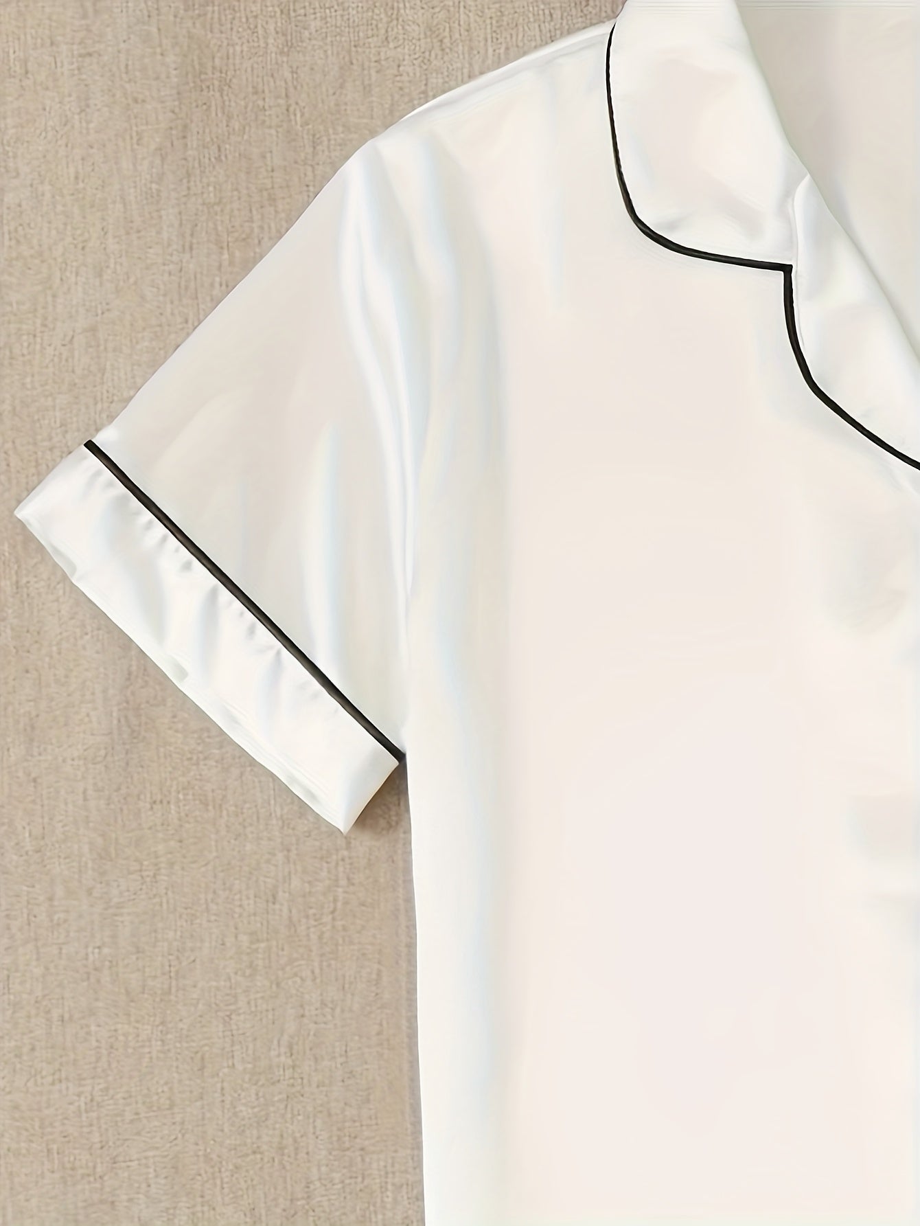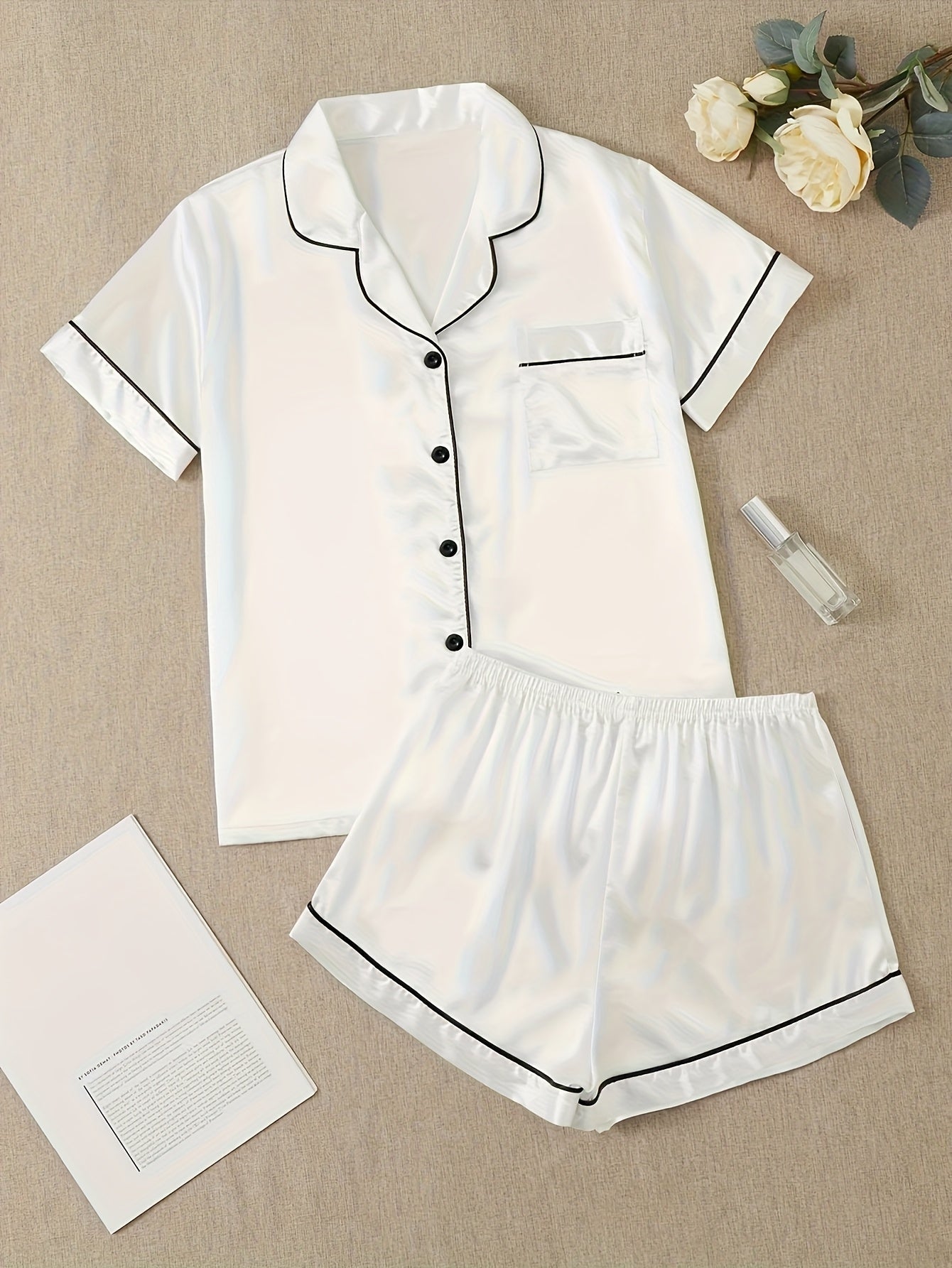 استمتع بالأناقة والراحة مع طقم البيجاما النسائي المثالي. يتضمن قميص بأزرار وأكمام قصيرة مع شورت مريح. مصمم من قماش خفيف ومثالي لفصل الصيف، يأتي مع جيب في الصدر ونقشة بلون موحد مميز.