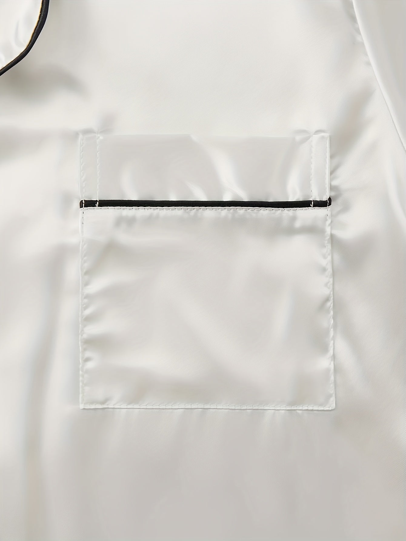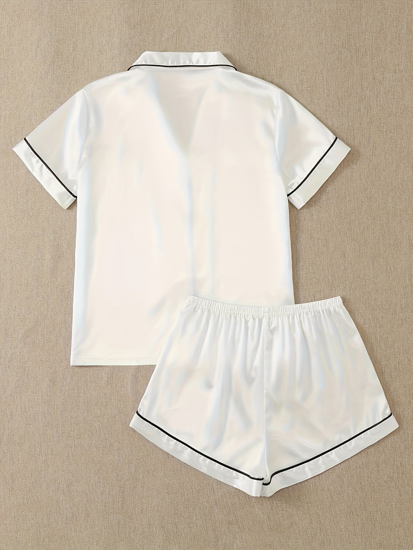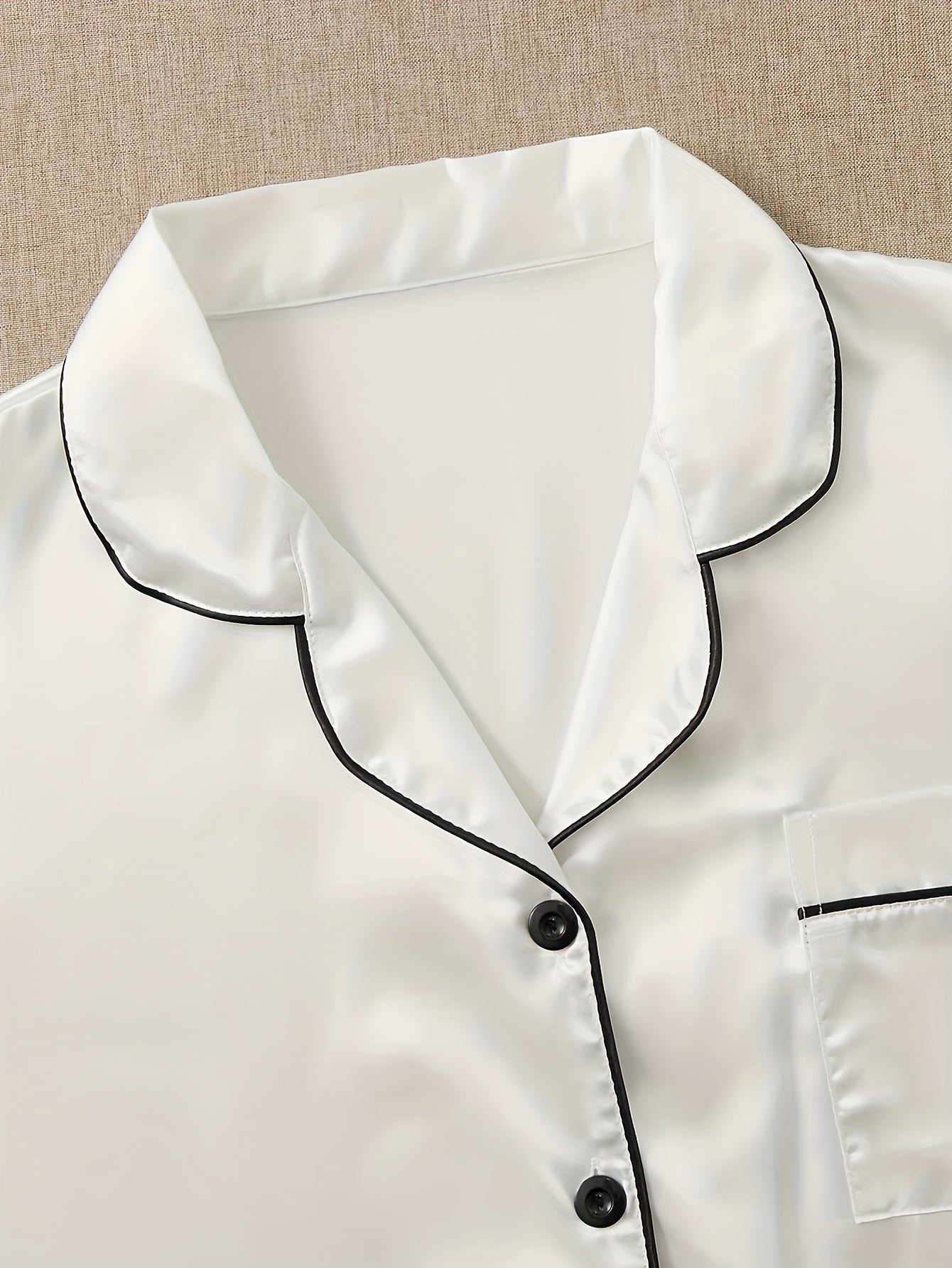 استمتع بالأناقة والراحة مع طقم البيجاما النسائي المثالي. يتضمن قميص بأزرار وأكمام قصيرة مع شورت مريح. مصمم من قماش خفيف ومثالي لفصل الصيف، يأتي مع جيب في الصدر ونقشة بلون موحد مميز.
