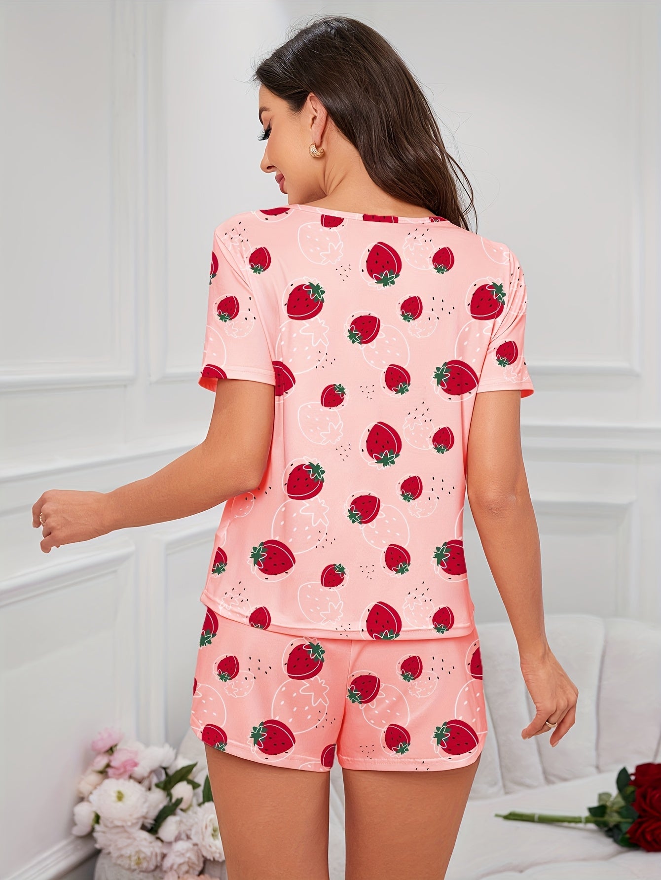 استمتع بليلة مريحة مع طقم البيجامة ذو طبعة الفراولة الجذاب. يحتوي على قميص قصير الأكمام مدور الياقة وسراويل مريحة.