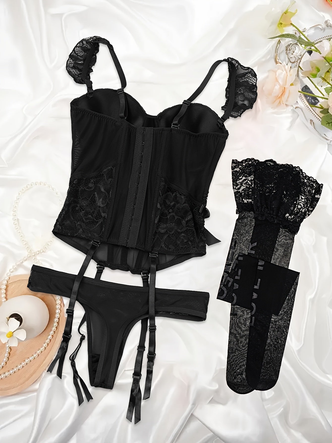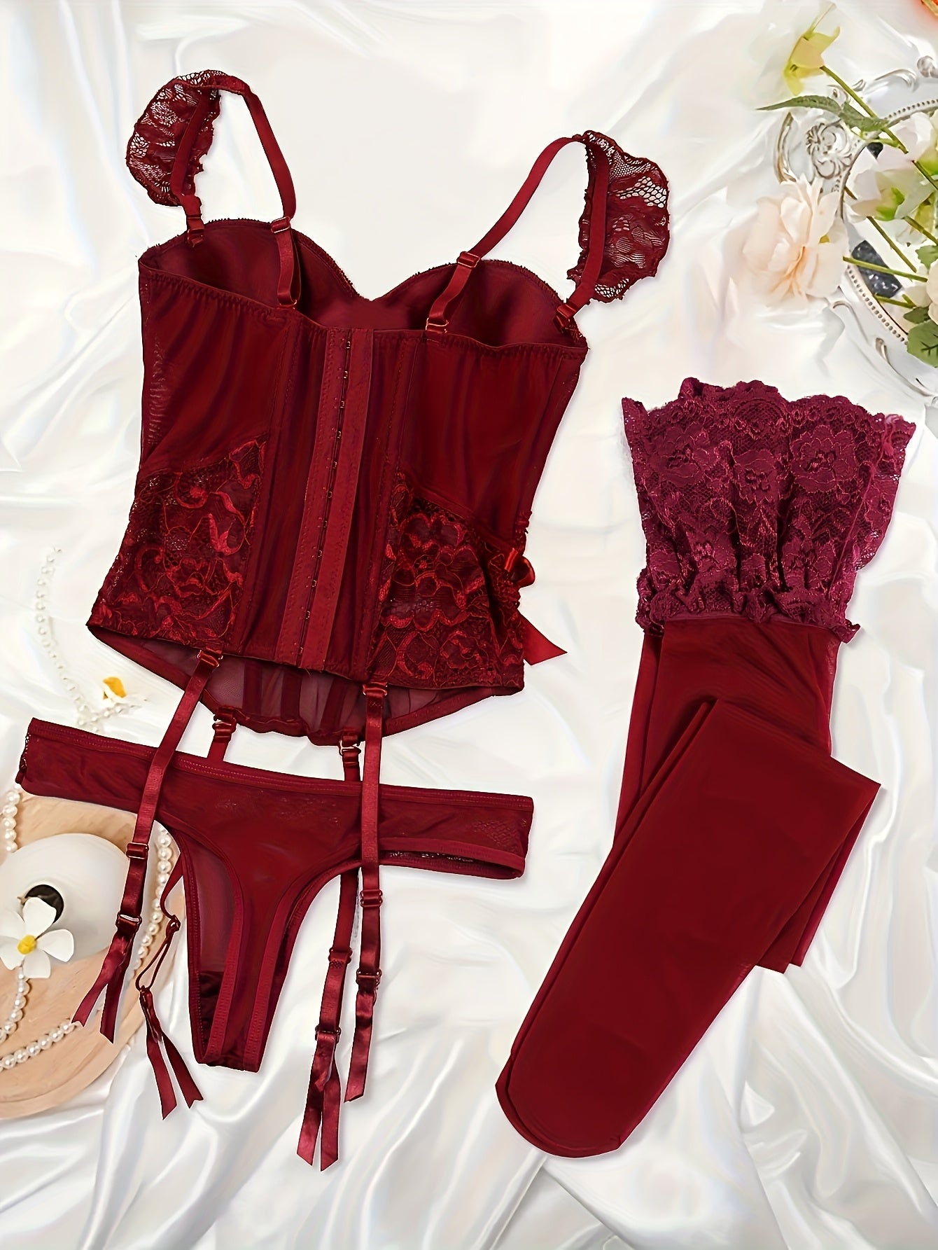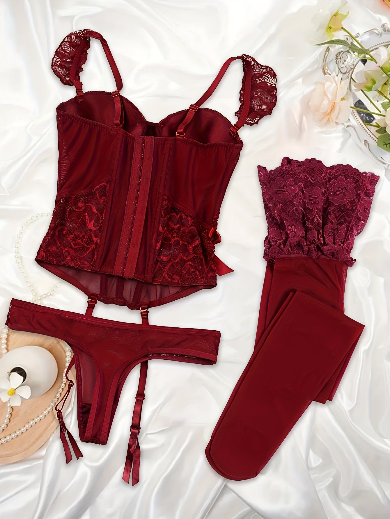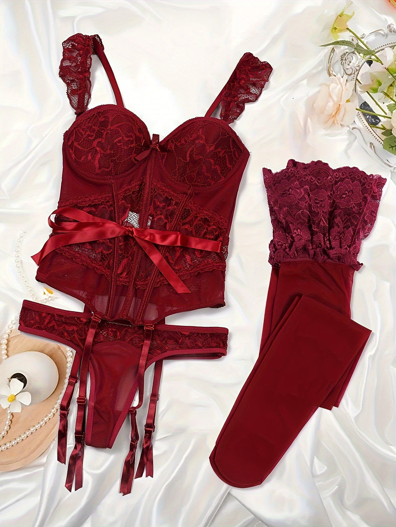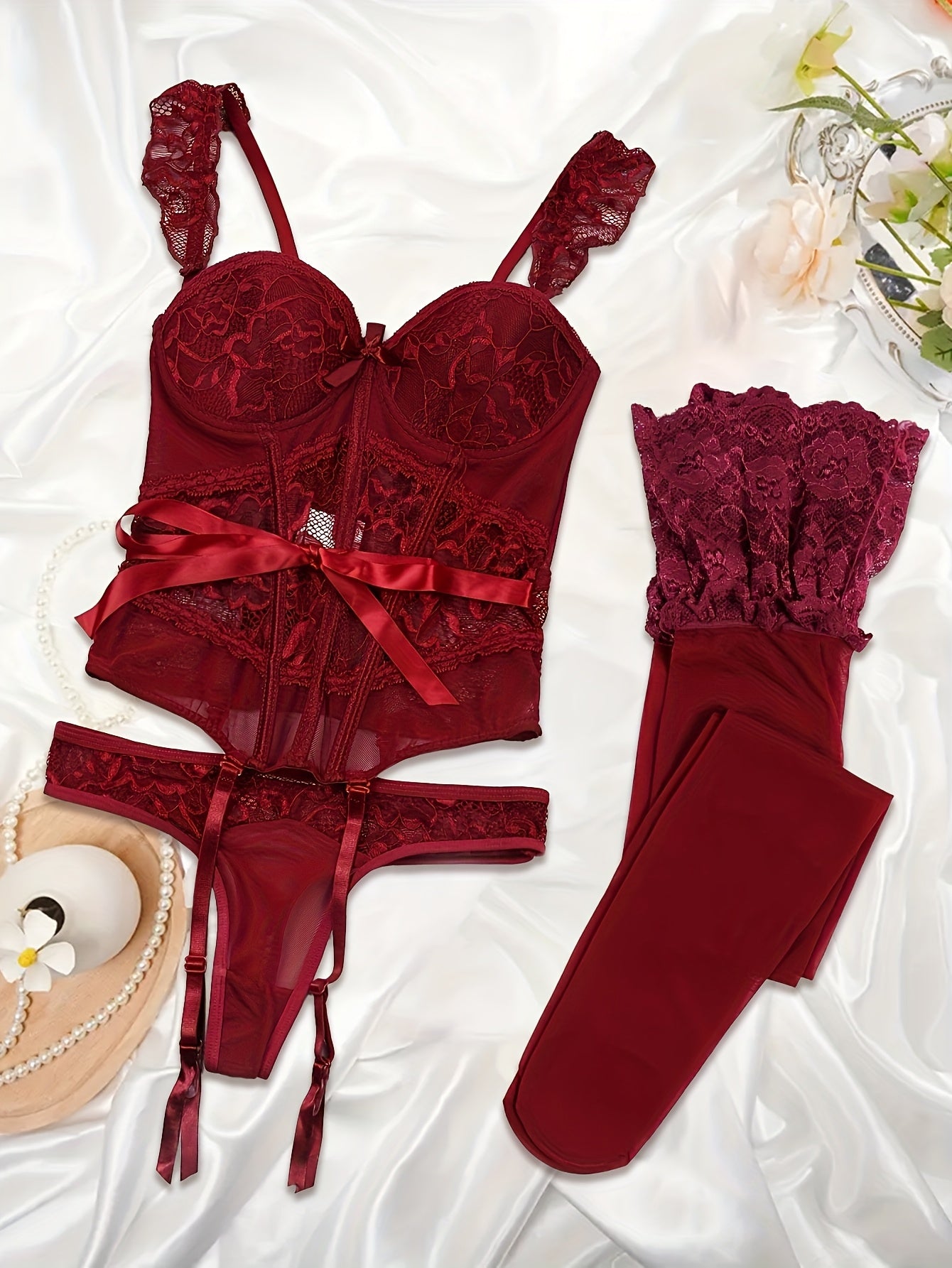 استمتع بتجربة راقية مع طقم اللانجري الدانتيل الأحمر الأنيق. يتضمن الصدرية والسروال وحزام الجوارب بتفاصيل جميلة من الزينة.