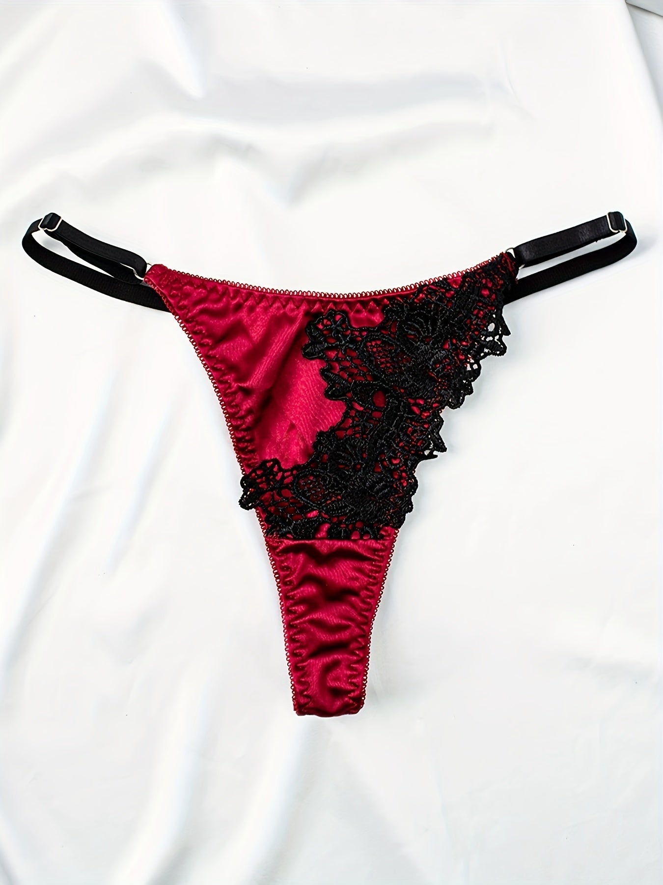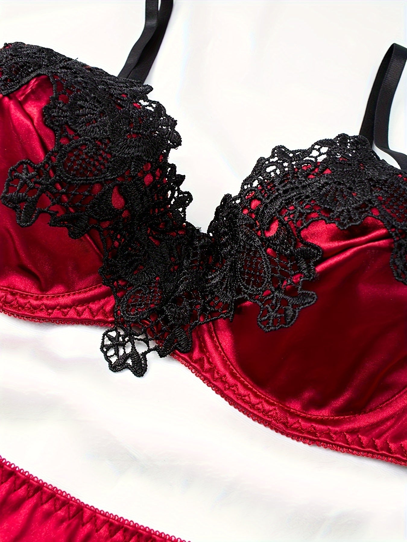 استمتع بأناقة فريدة مع طقم اللانجري من الساتان الذي يتضمن حمالة صدر مزينة بتطريزات زهرية، وشرائط، وبيبي دول.
