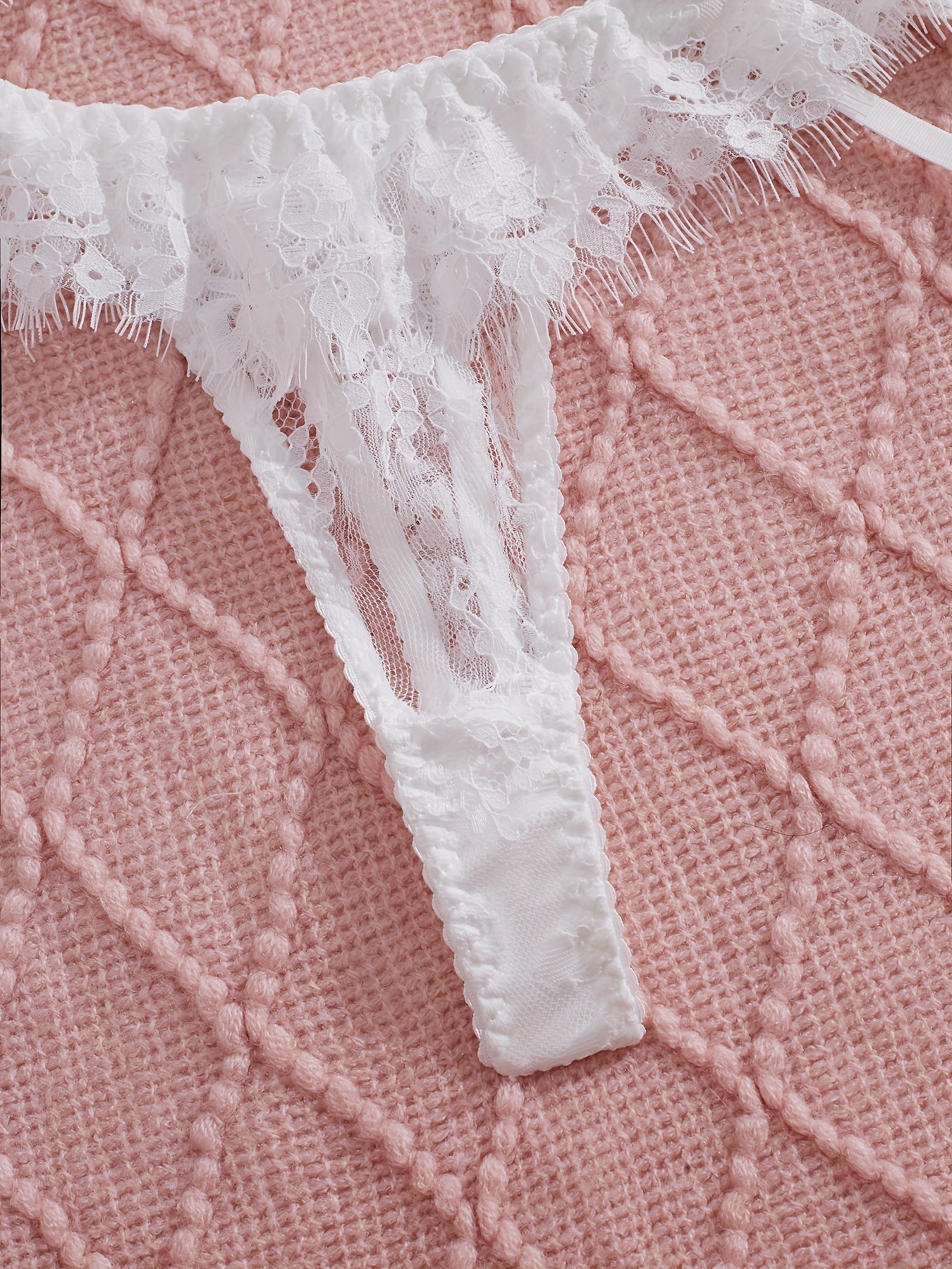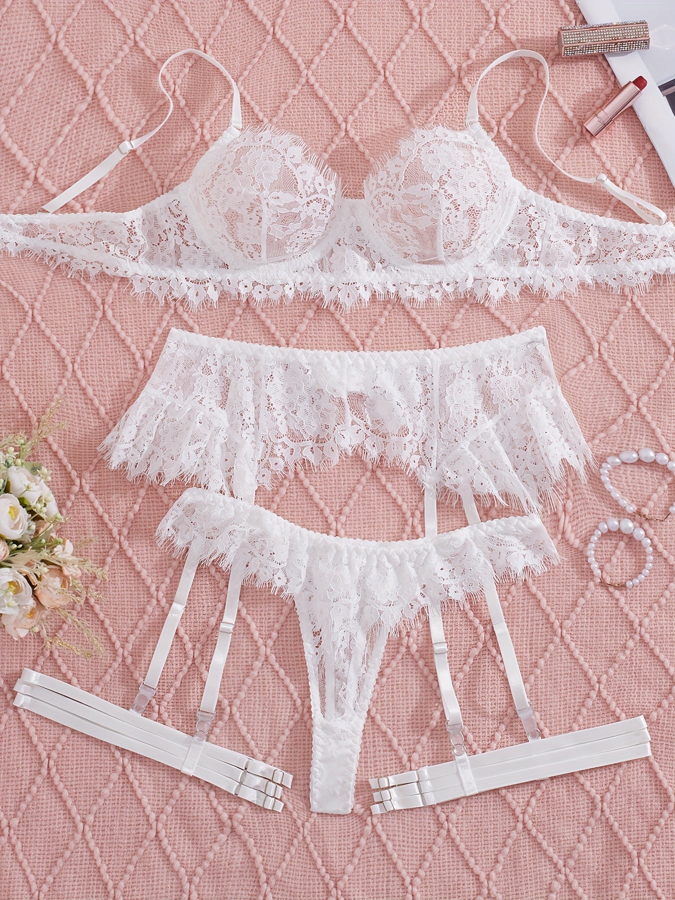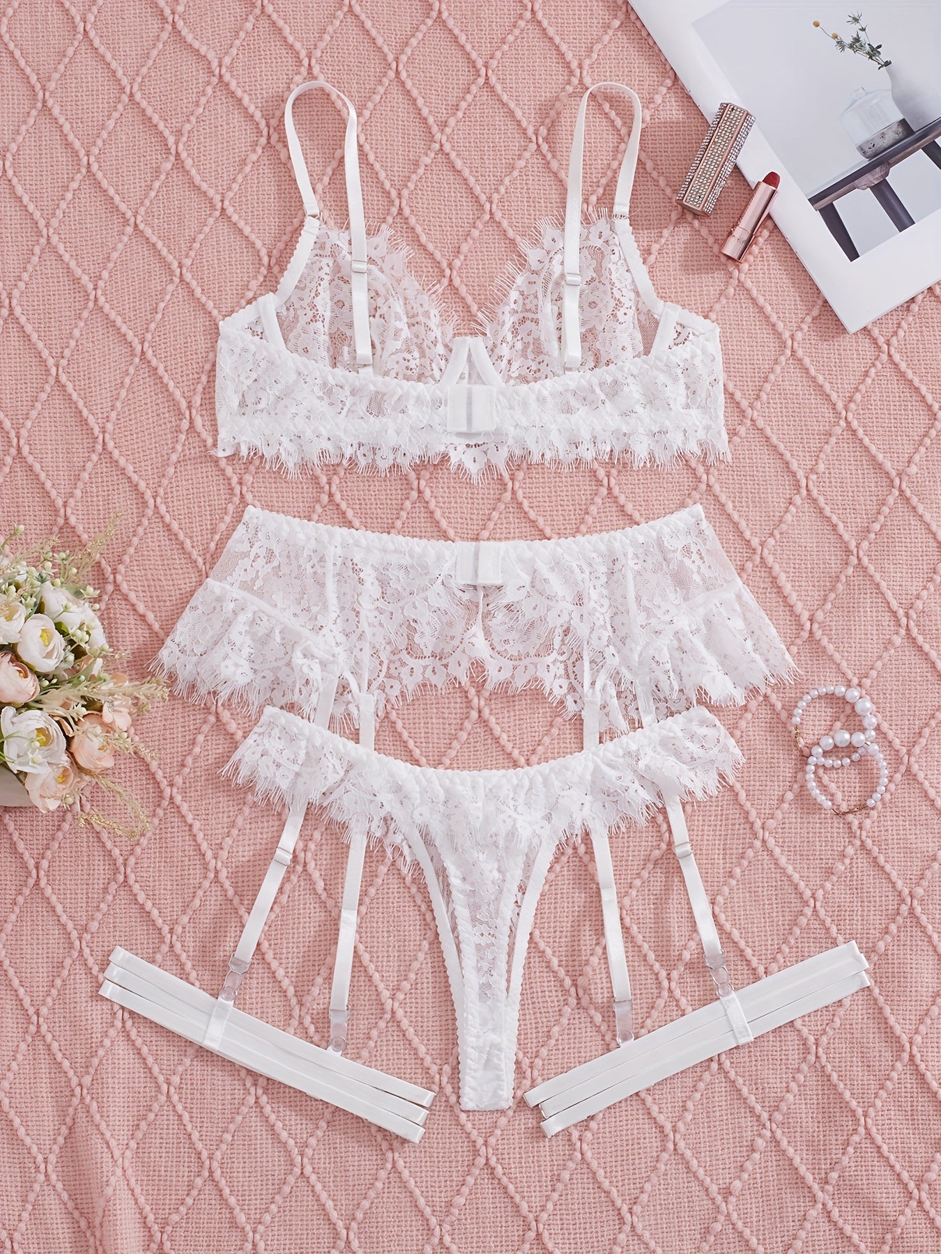 استمتعِ بأناقة وجاذبية مع طقم الملابس الداخلية الأنثوي هذا. مصنوع من الدانتيل الفاخر، يأتي مع حزام ساق لإضفاء لمسة مميزة.