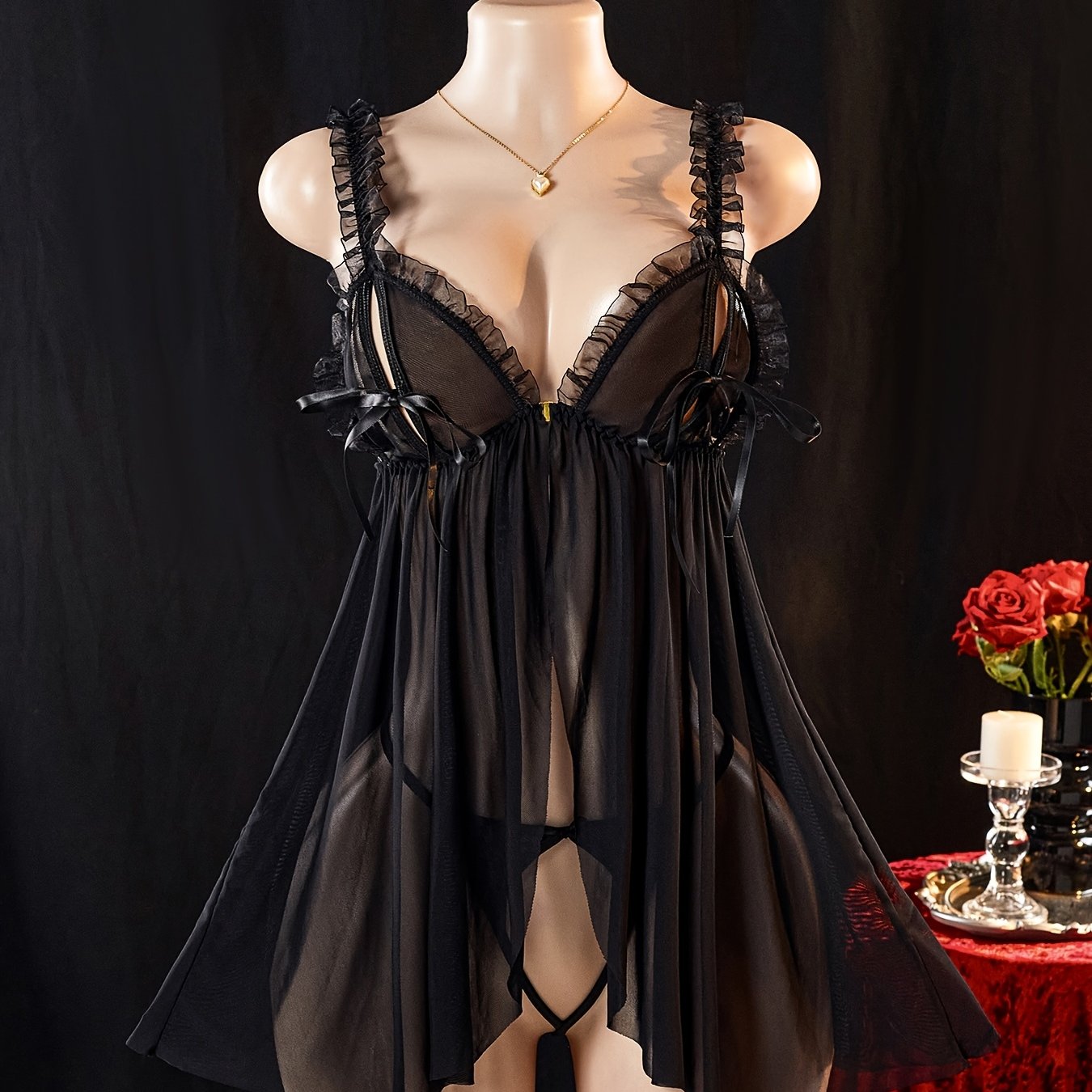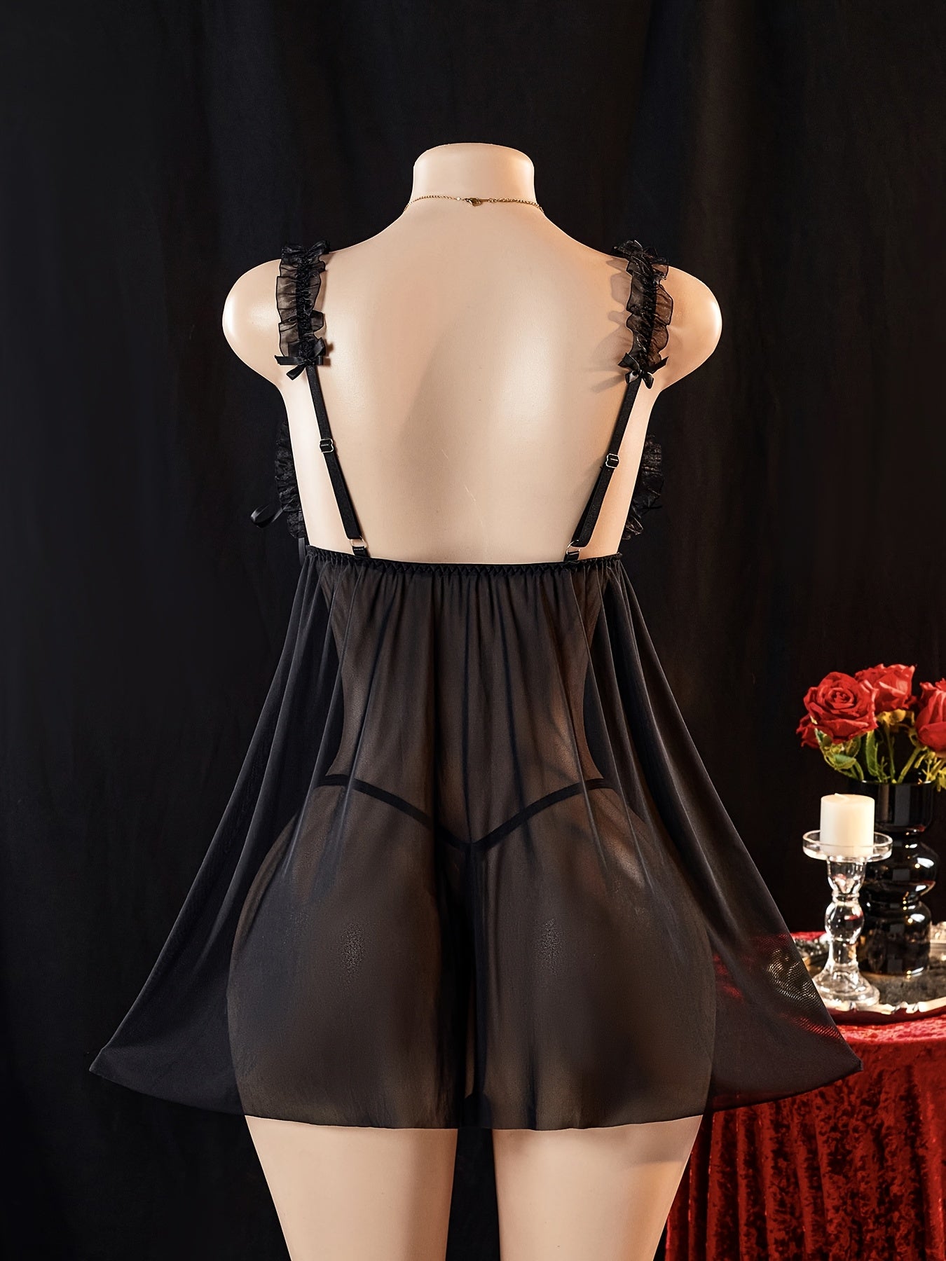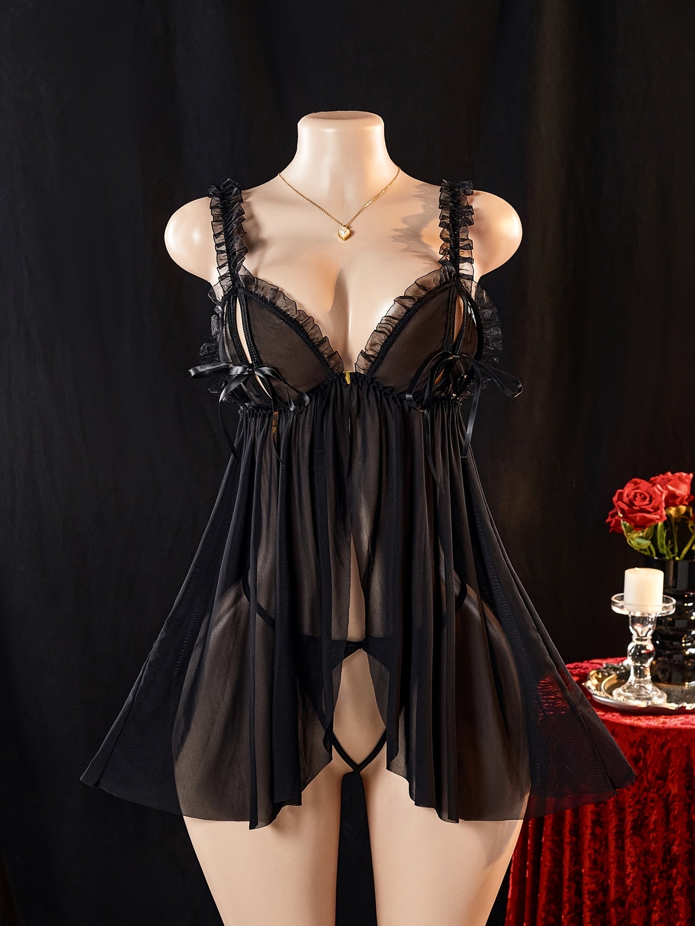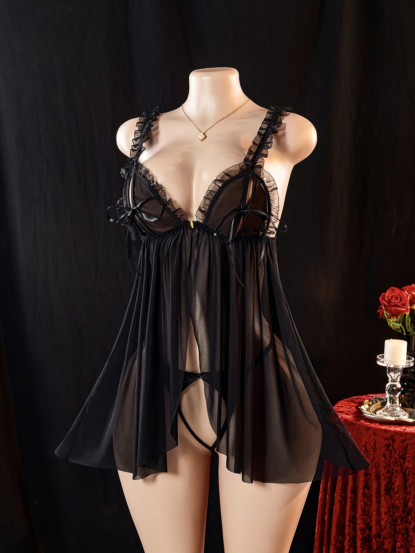استمتع بتجربة أنثوية وجذابة مع مجموعة الفستان المكون من قماش الدانتيل والبانتي.