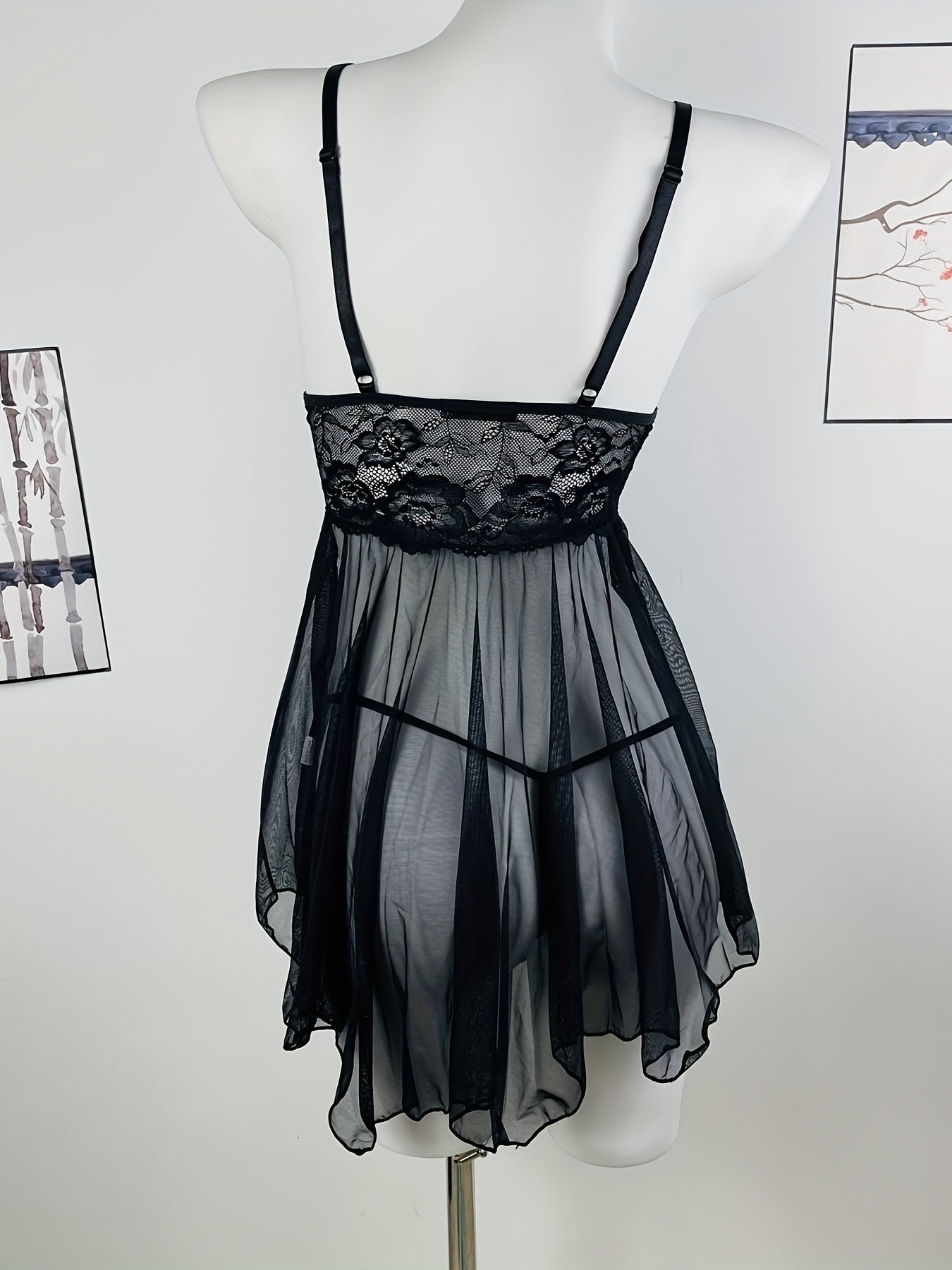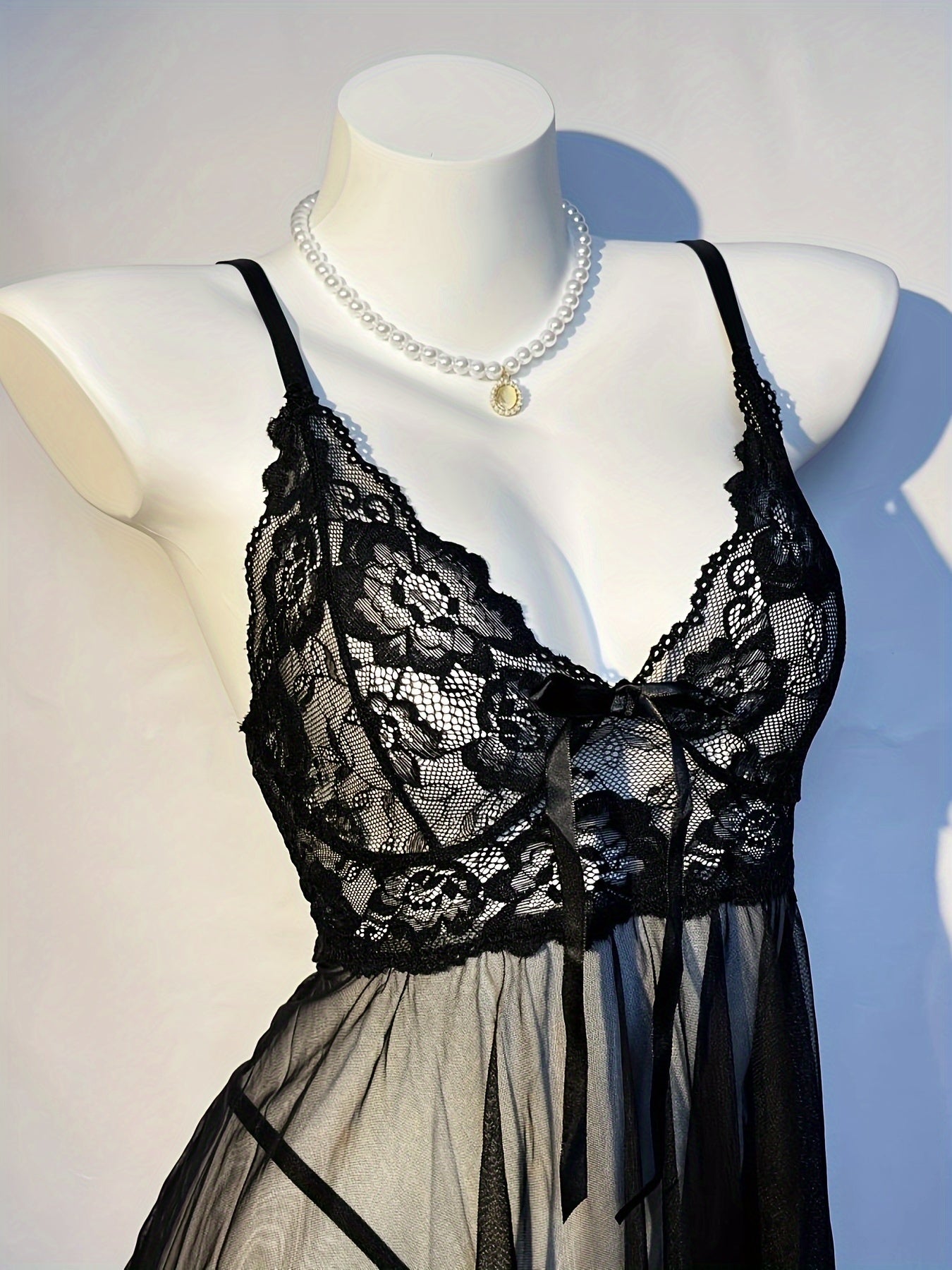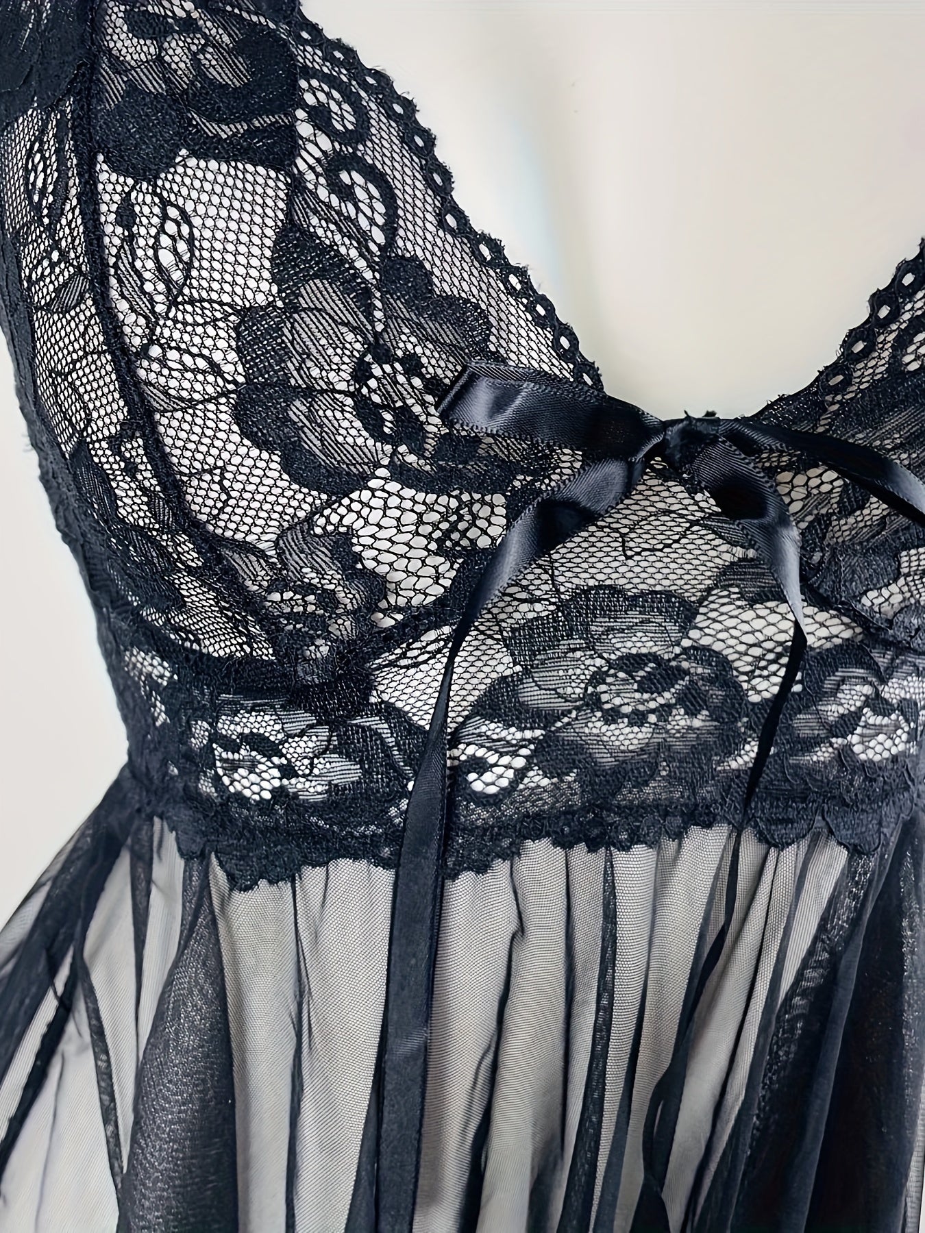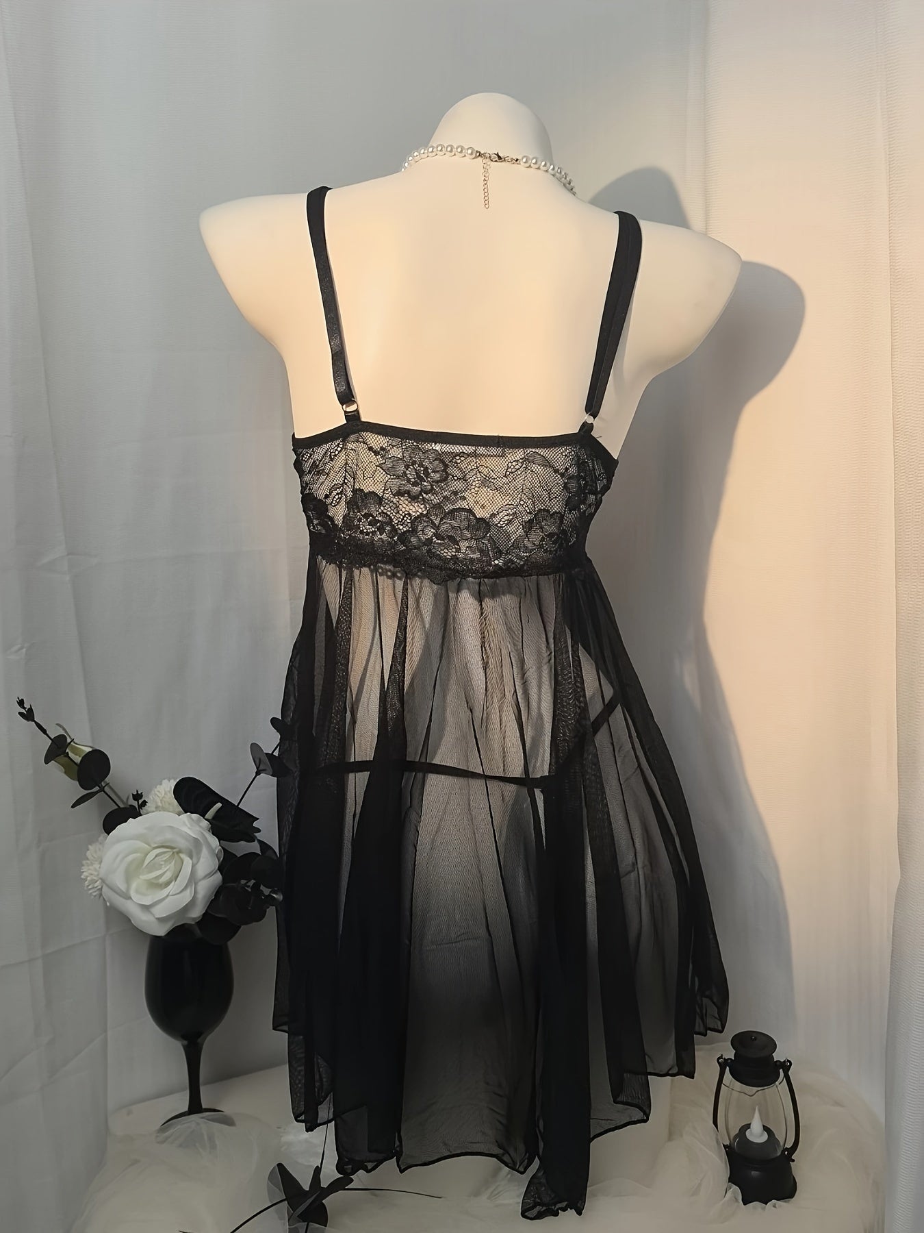 استمتع بجمال وأناقة فستان النوم المثير مزين بالتفاصيل من الدانتيل. يتميز بشبك شفاف وقصة ضيقة، مما يمنحك إطلالة جذابة.