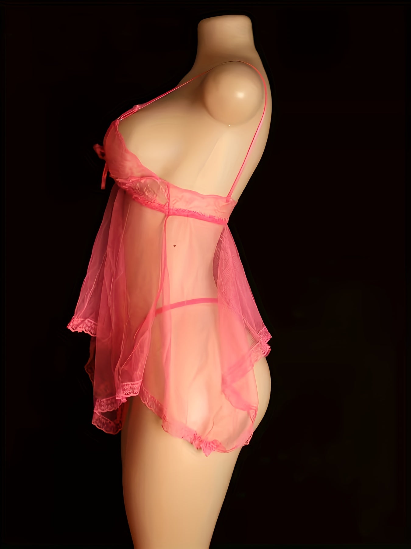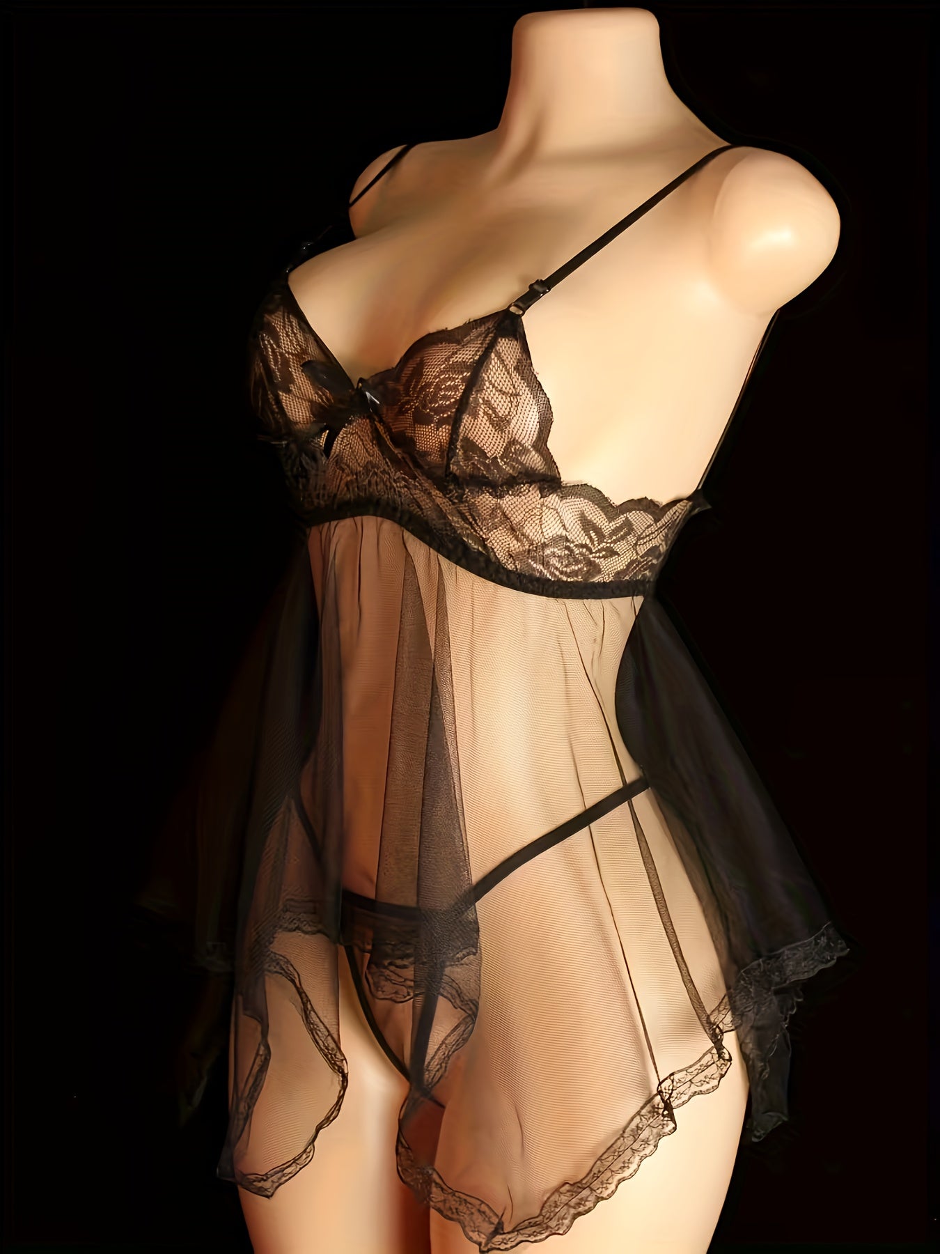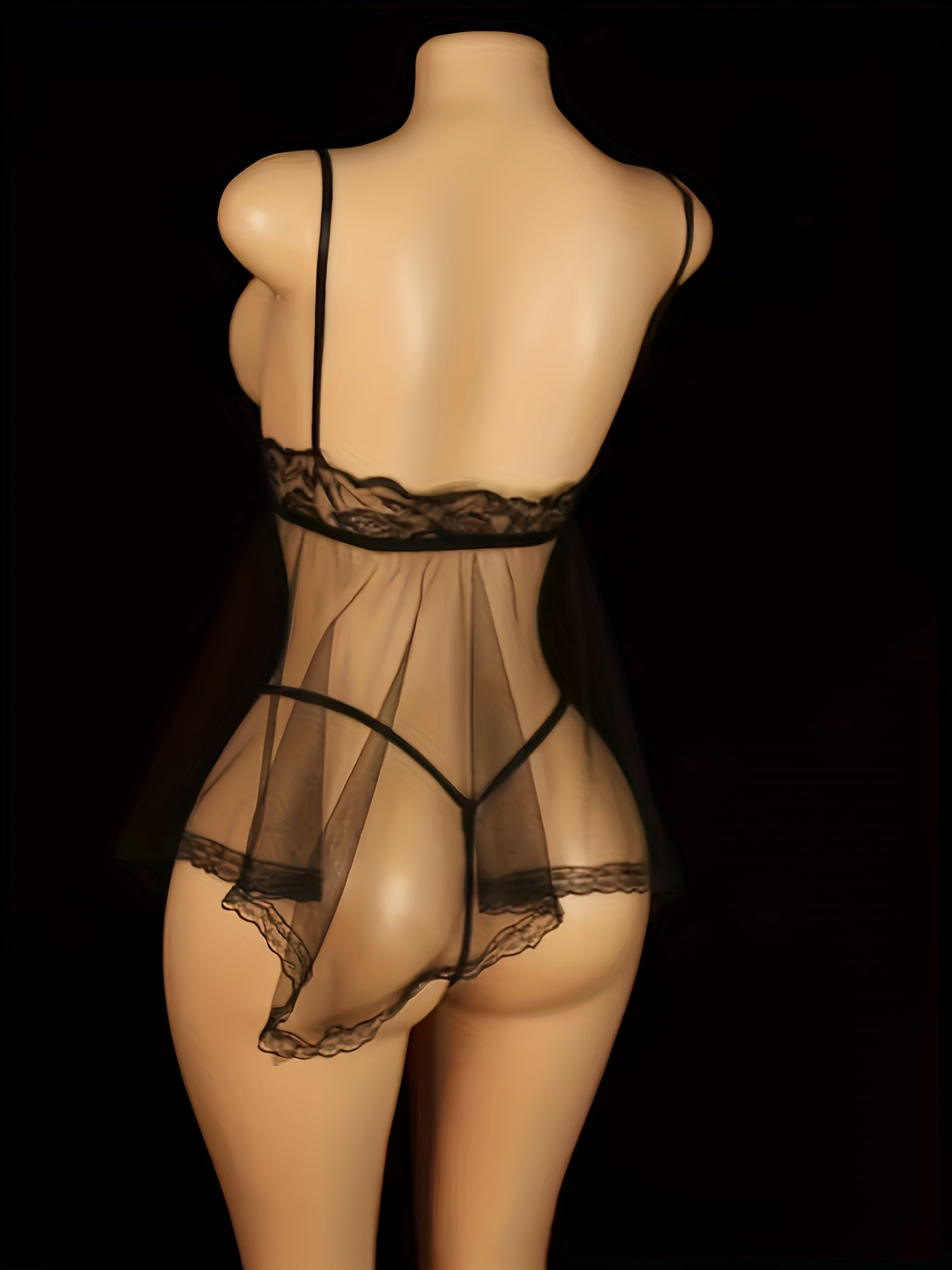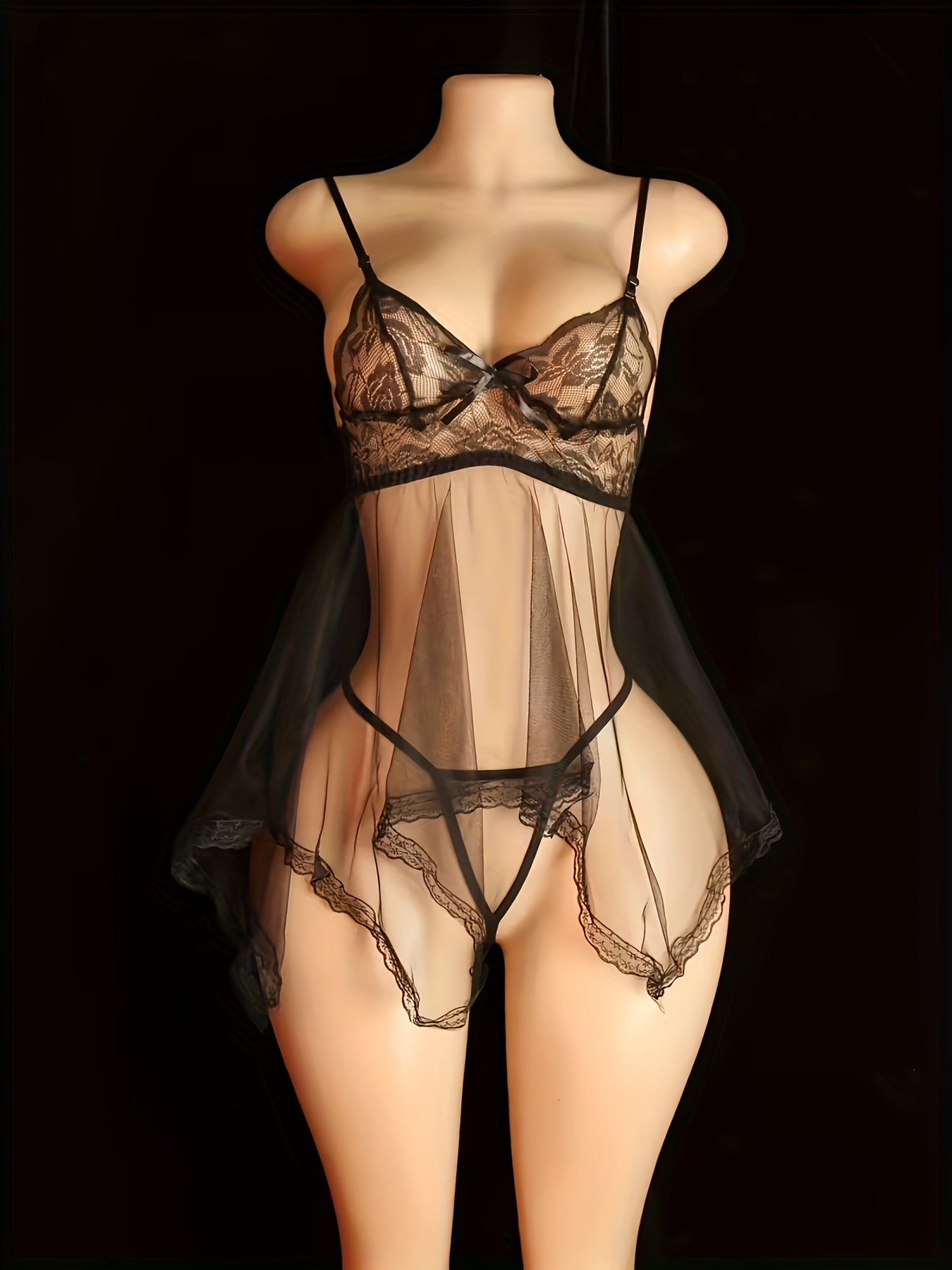 استمتع بلحظات خاصة مع هذا الفستان الشفاف الأنيق بتفاصيل الدانتيل. يتميز الفستان بفتحة أمامية وتصميم مكشوف من النصف مع حواف مموجة.