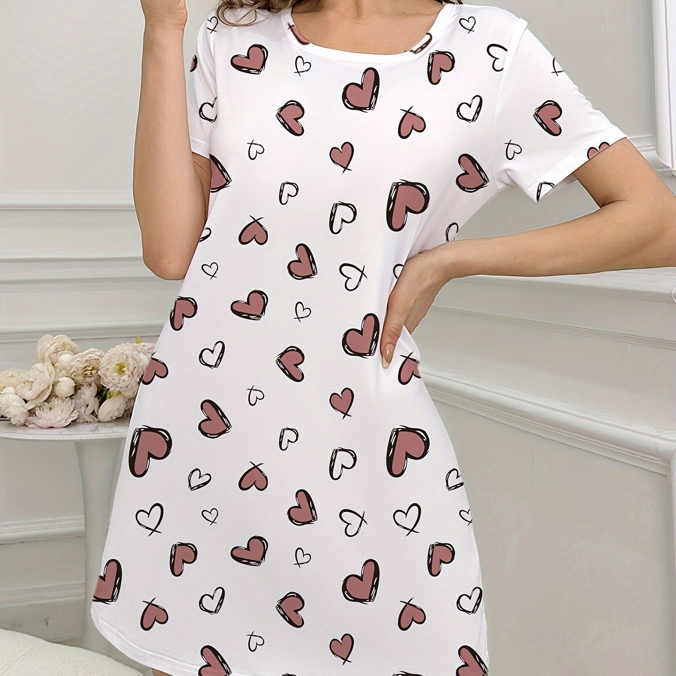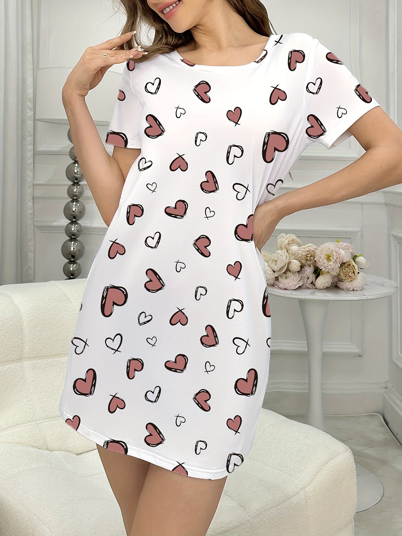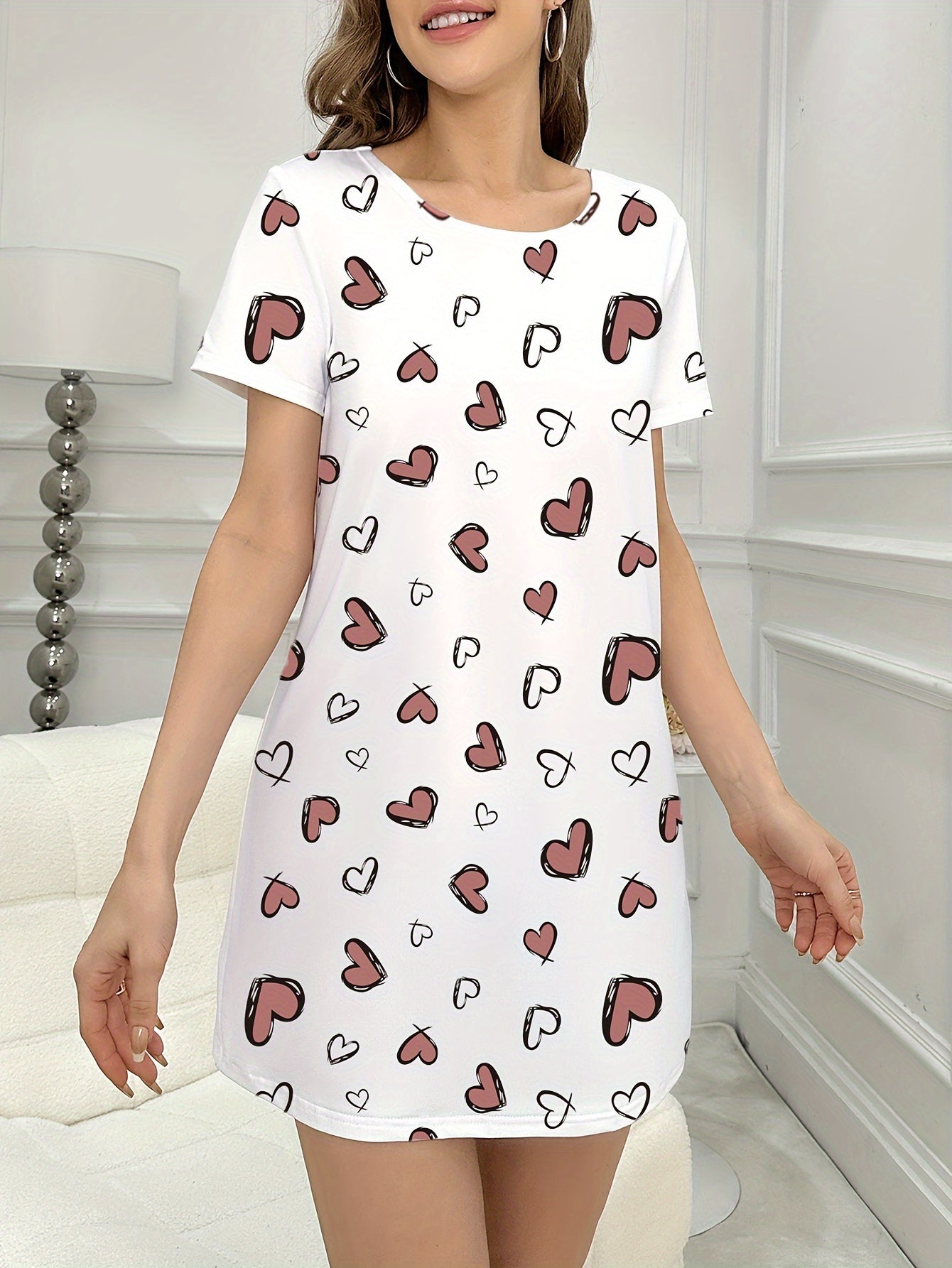استمتعِ بأوقات مريحة مع فستان النوم القصير بأكمام للنساء، الذي يأتي بتصميم لطيف مع طباعة قلوب جميلة. يعتبر خياراً مثالياً للاستخدام في المنزل أو الخروج.