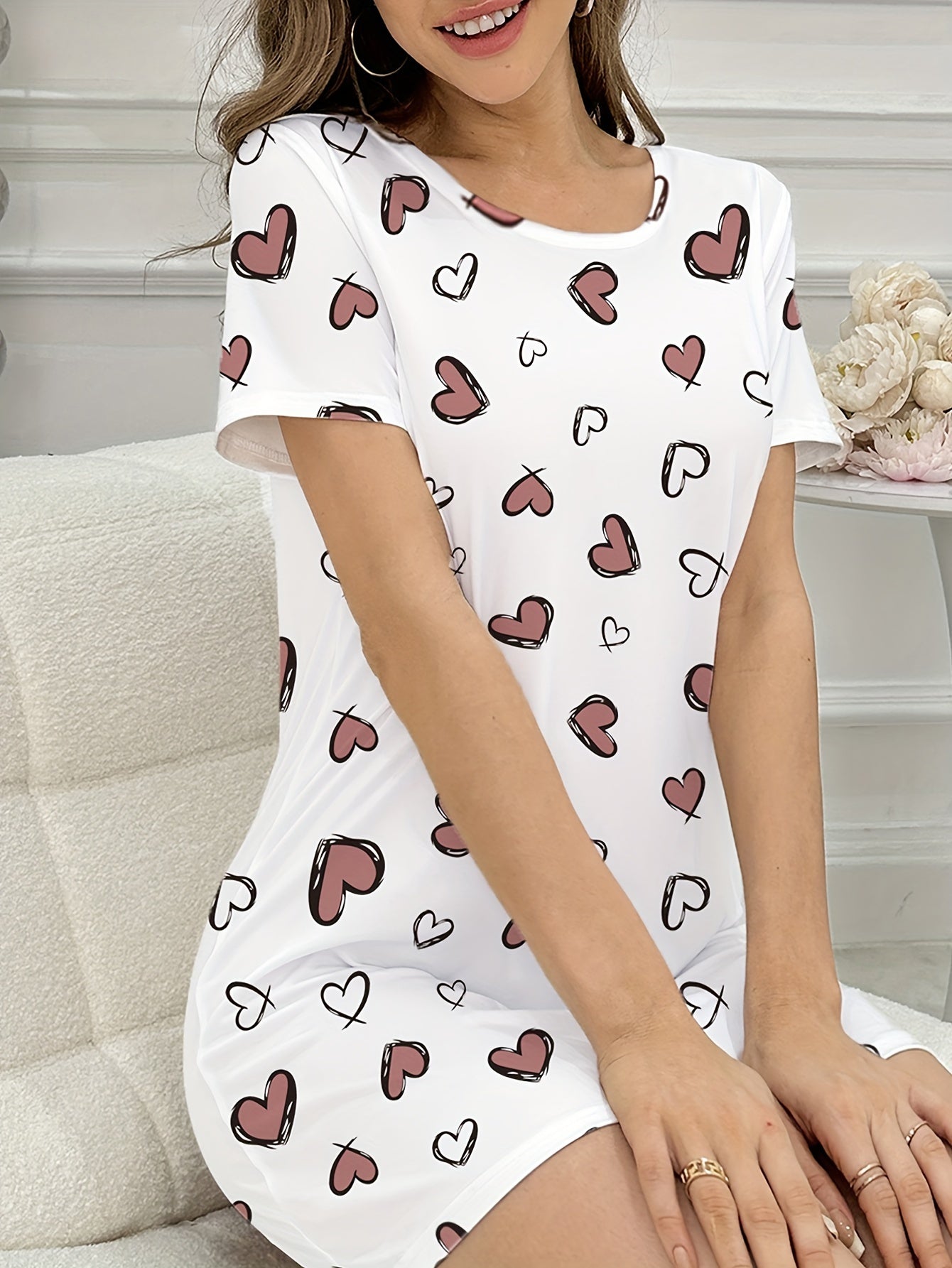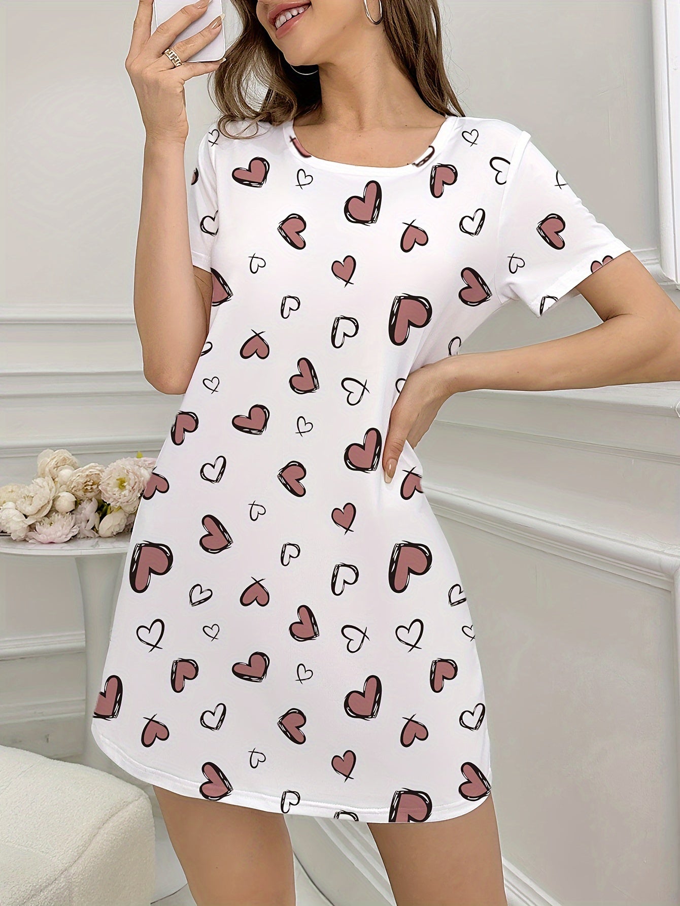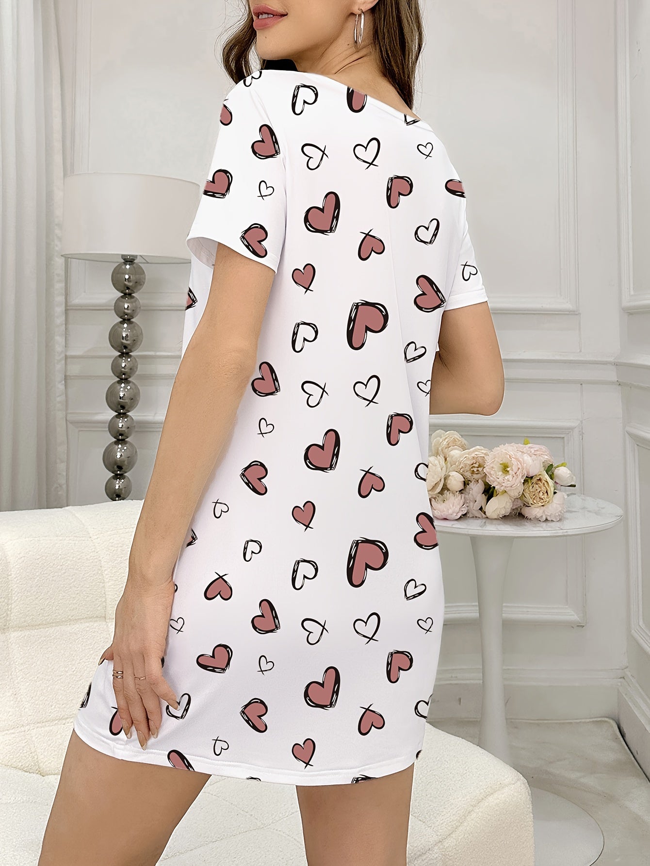 استمتعِ بأوقات مريحة مع فستان النوم القصير بأكمام للنساء، الذي يأتي بتصميم لطيف مع طباعة قلوب جميلة. يعتبر خياراً مثالياً للاستخدام في المنزل أو الخروج.