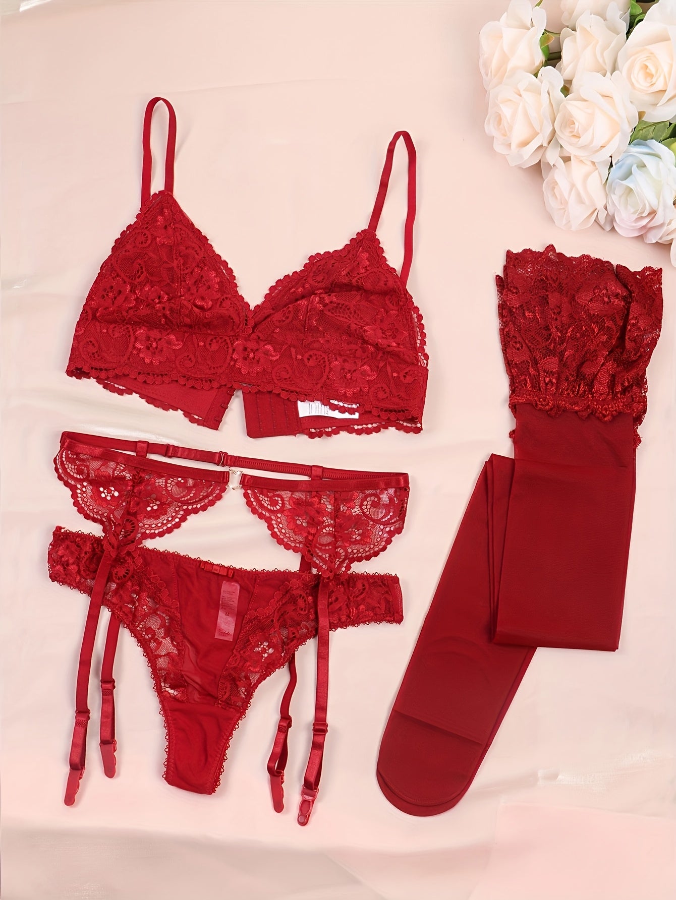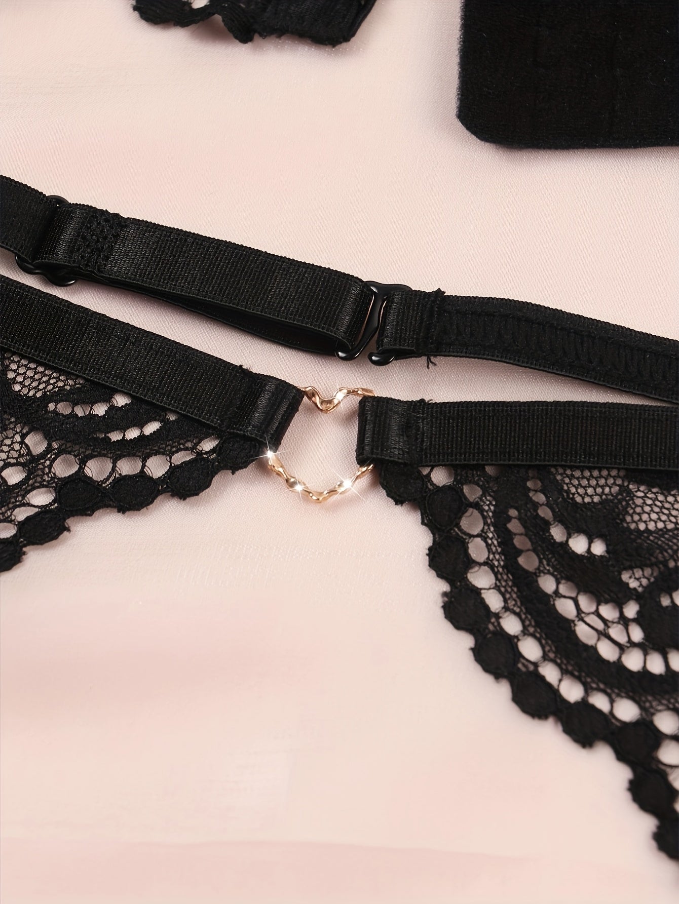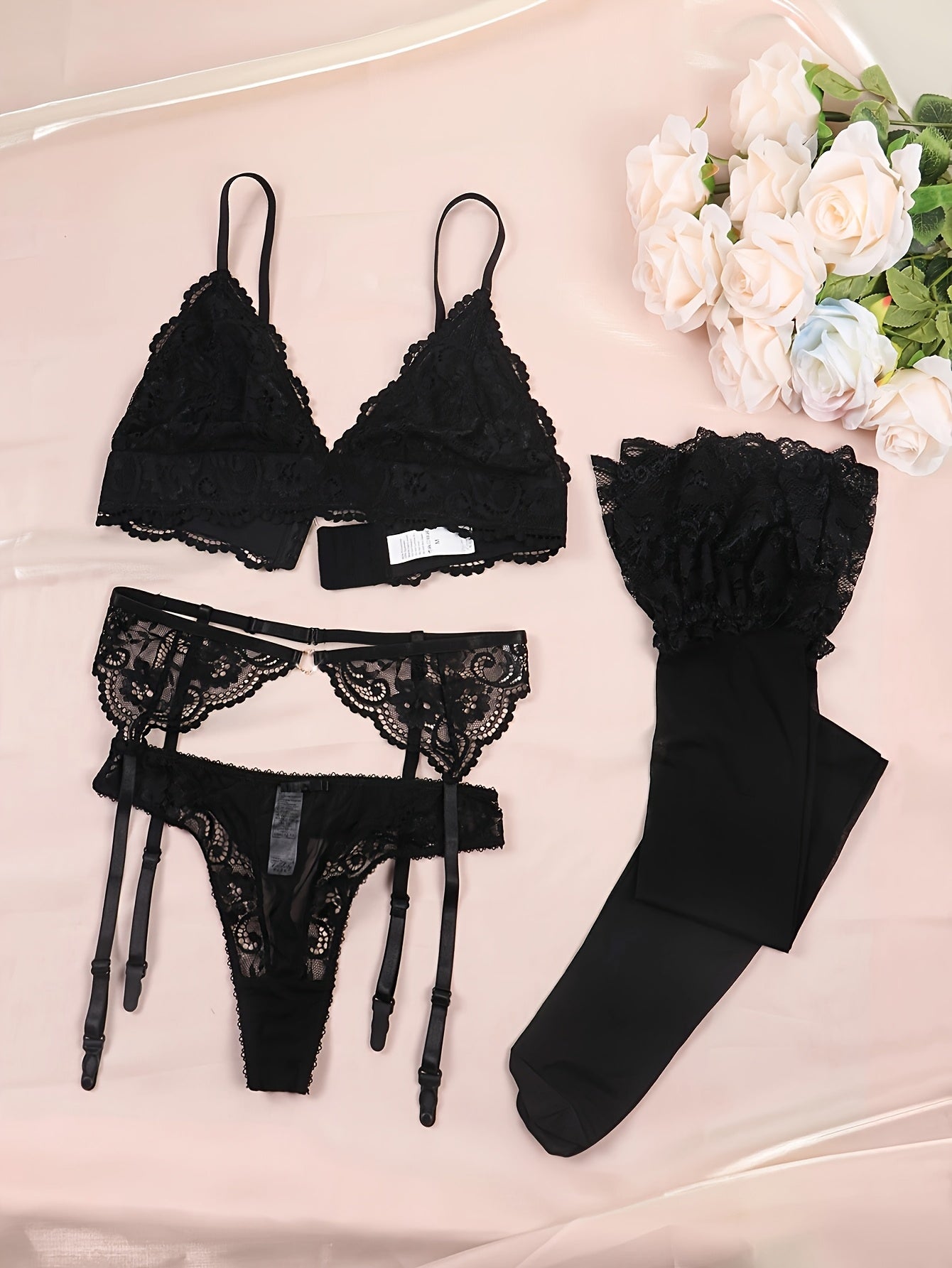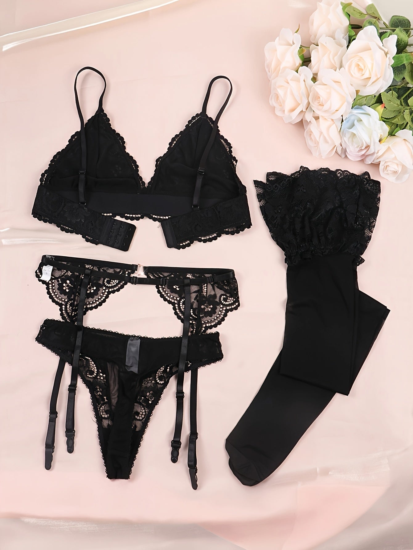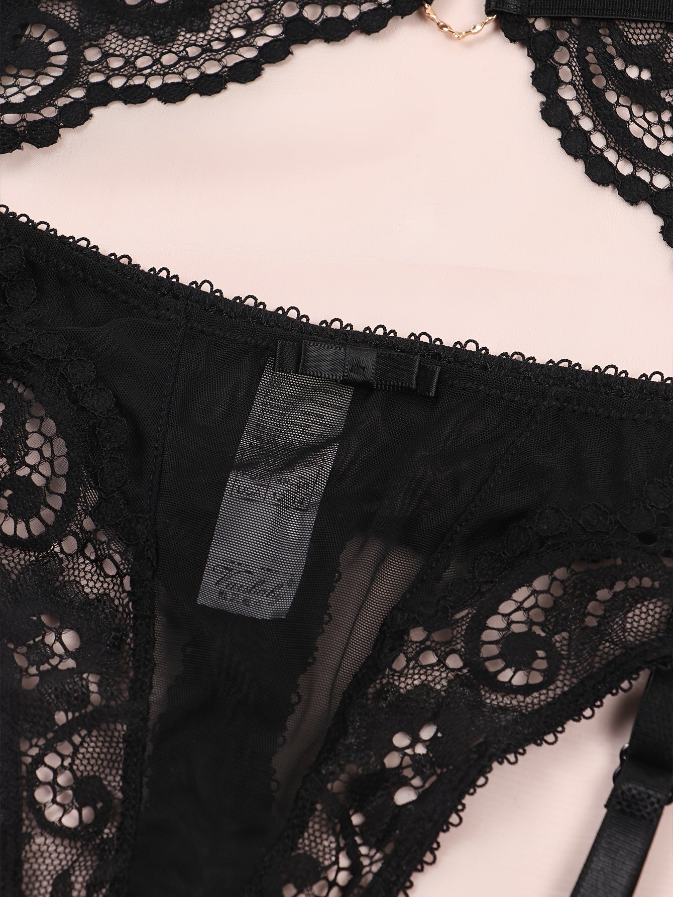 استمتع بجمال الأناقة مع مجموعة حمالة صدر نسائية مكونة من حمالة صدر، سروال، وجوارب. تتميز بتفاصيل جذابة وحواف ممزقة تضيف لمسة مثيرة.