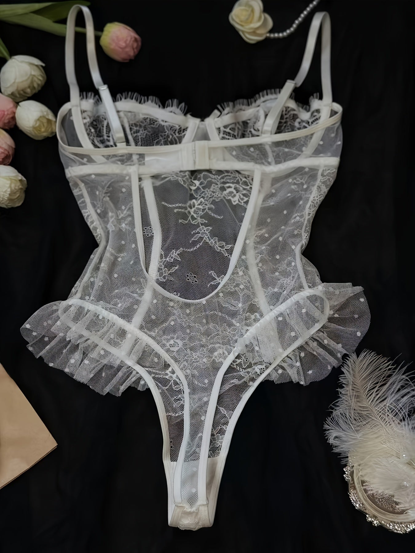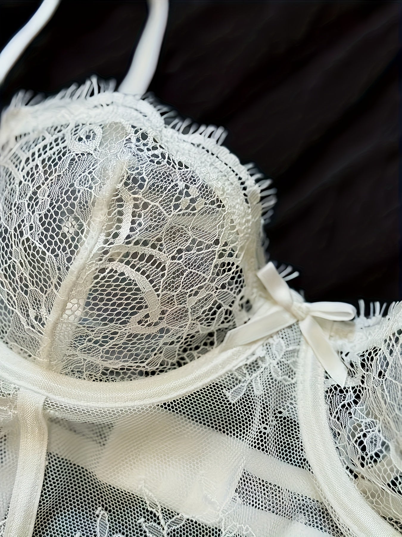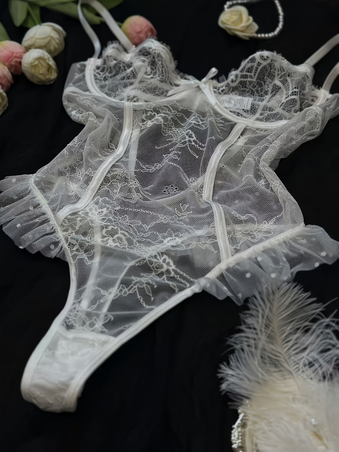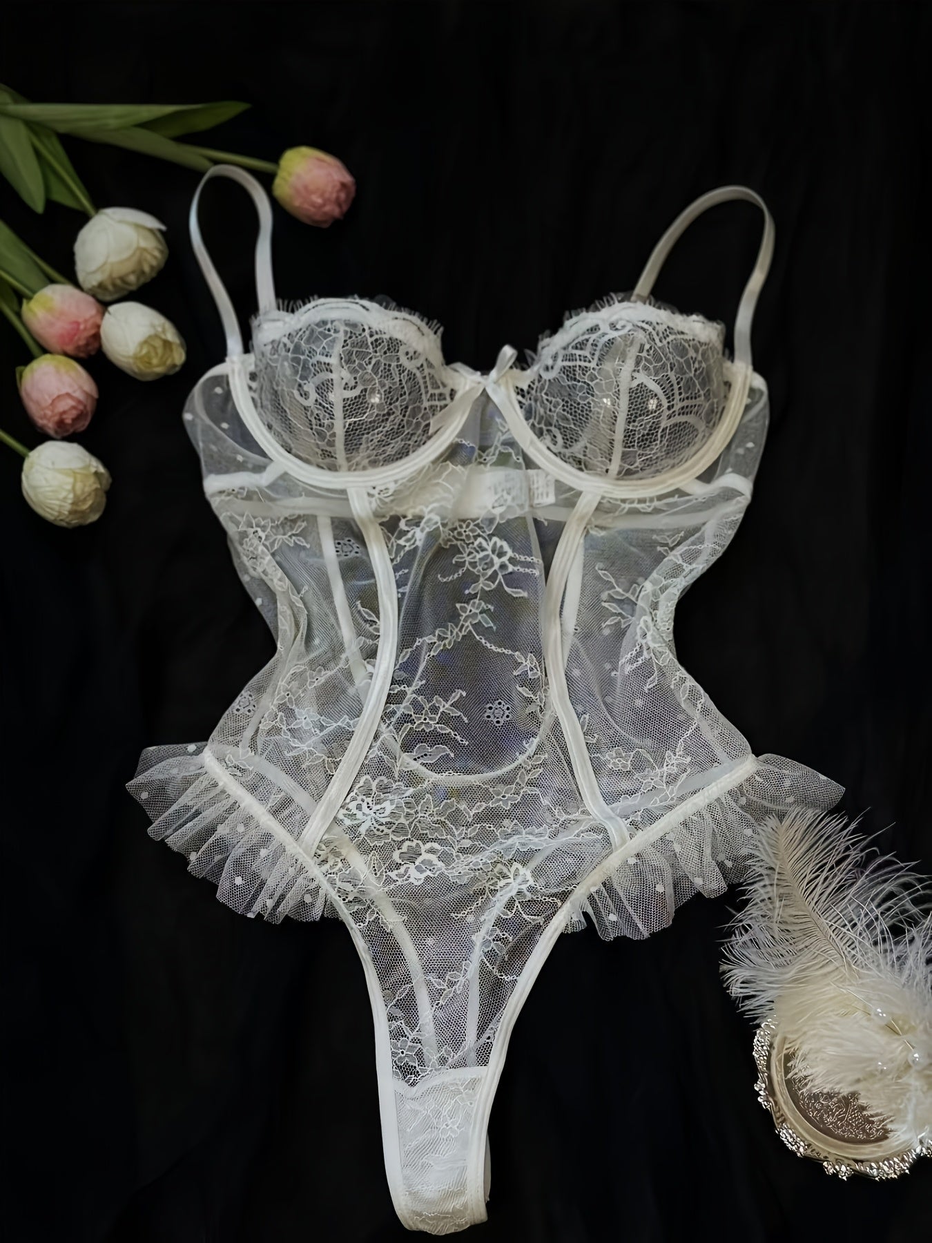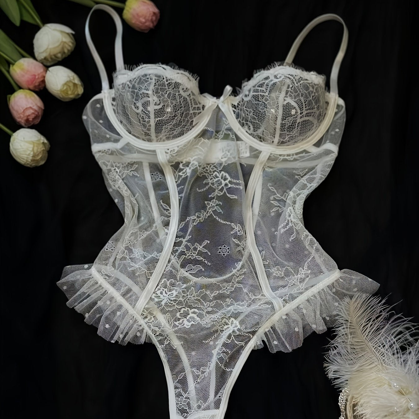 استمتعي بأناقة مختلفة مع هذا التصميم الفريد من الملابس الداخلية المثيرة. مصنوع من قماش شفاف مع تفاصيل من الدانتيل، يوفر هذا الزي راحة وأناقة في آن واحد.
